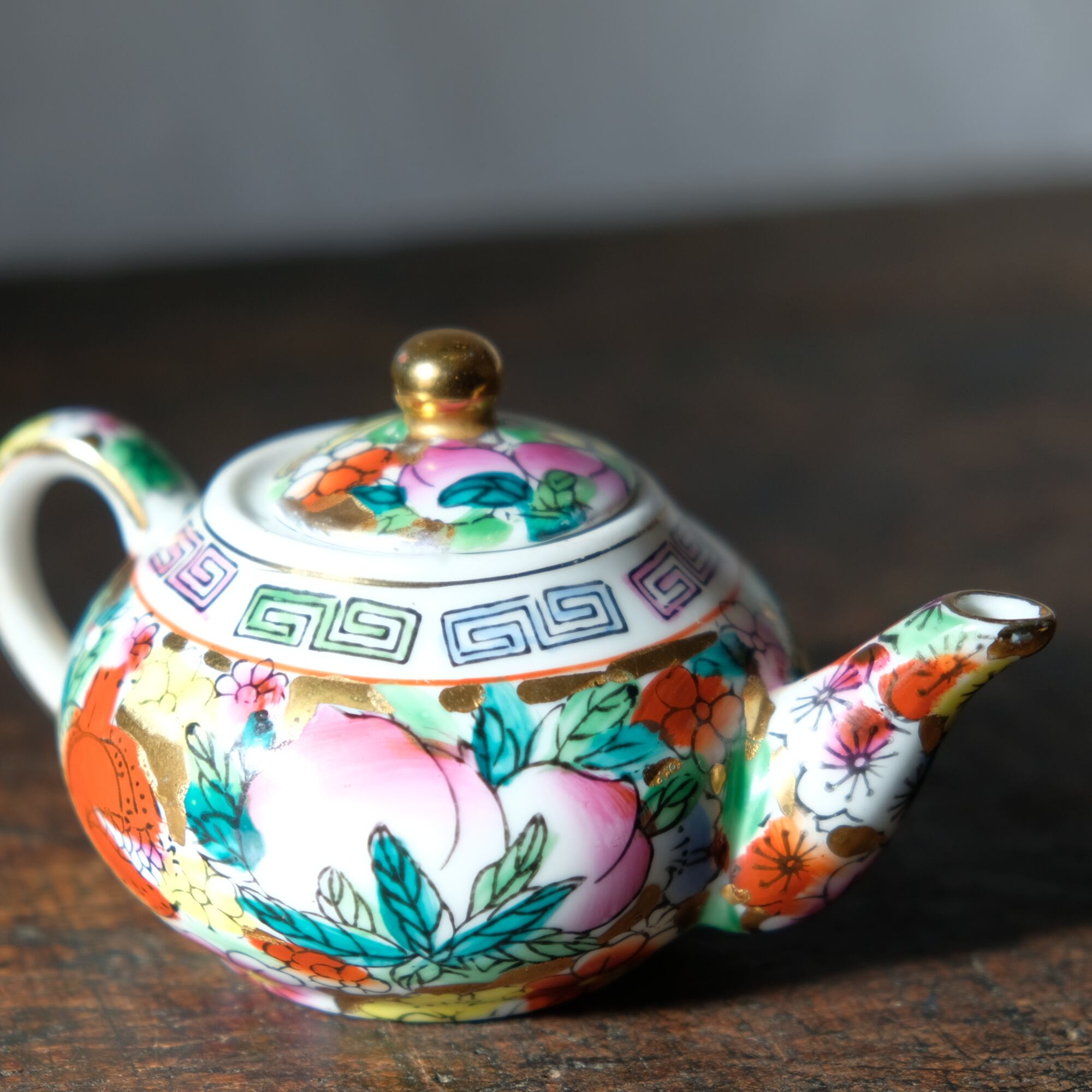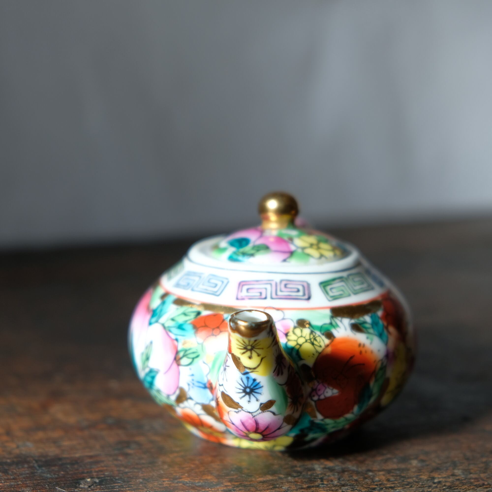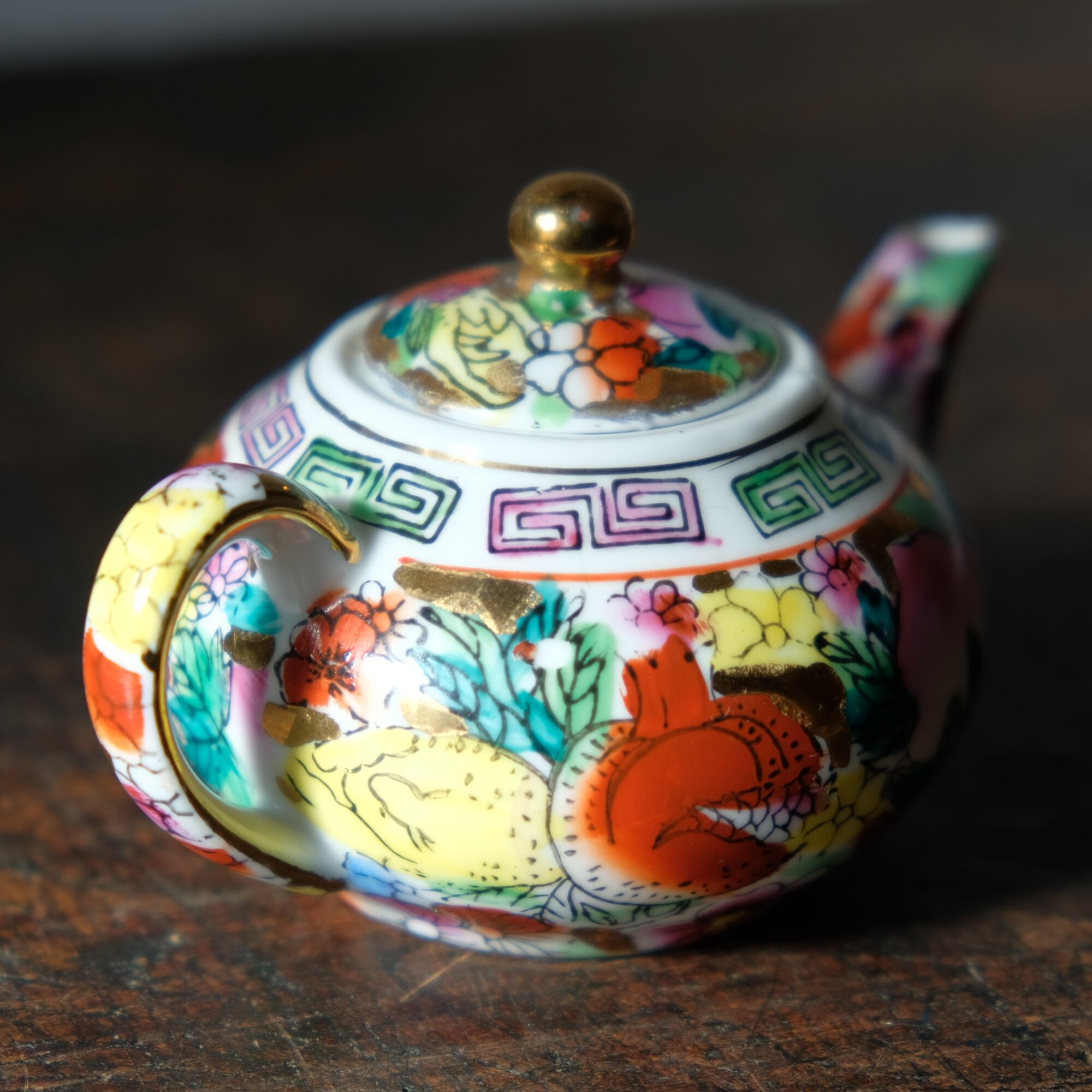 カラフルな花や果実◆中国産 色絵金彩小ぶり急須 煎茶茶器 チャイナレトロ インテリア シノワズリ