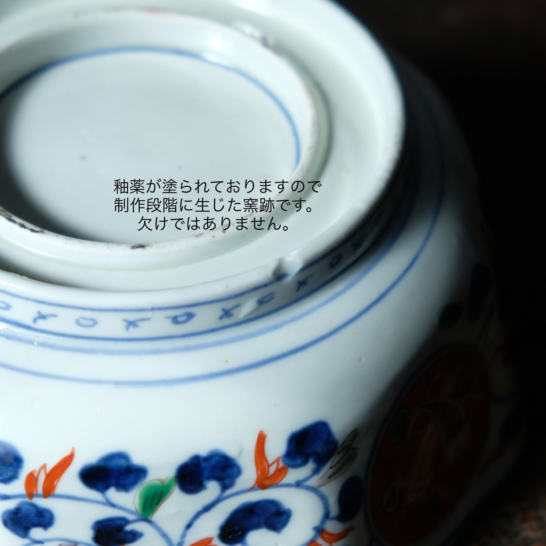◆絵のズレ・色のムラ・個体差による微々たる絵の違い・小さな窯傷・ピンホール(針で刺したような穴)・フリモノやひっつき(制作段階に付着した灰の粉やその他付着物)・斑点・色の抜け・個体差による色の濃さの違い・形の歪み・がございます。