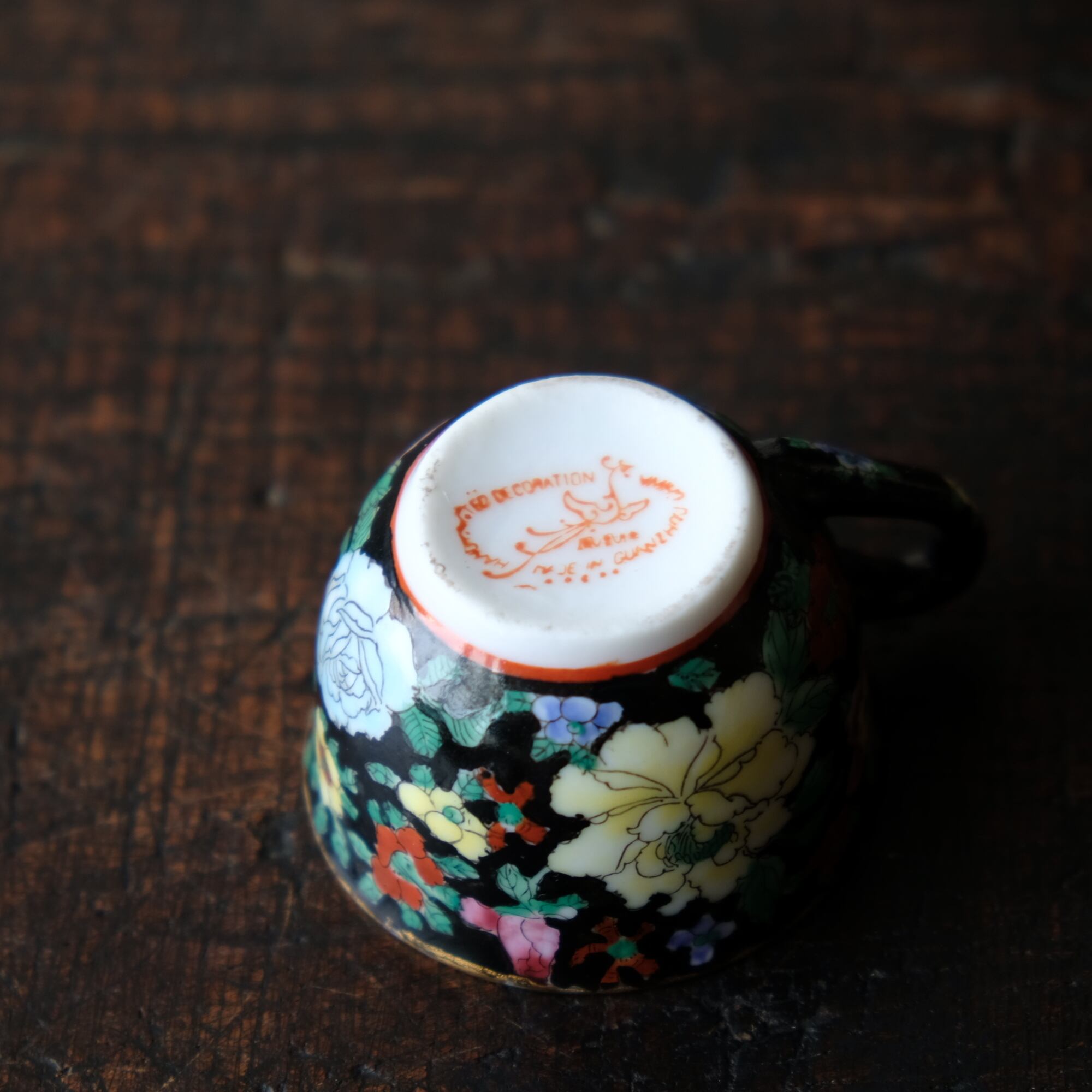 黒やかな青にカラフルな花尽くし◆中国産 色絵金彩小ぶりカップ 茶器 チャイナレトロ シノワズリ インテリア