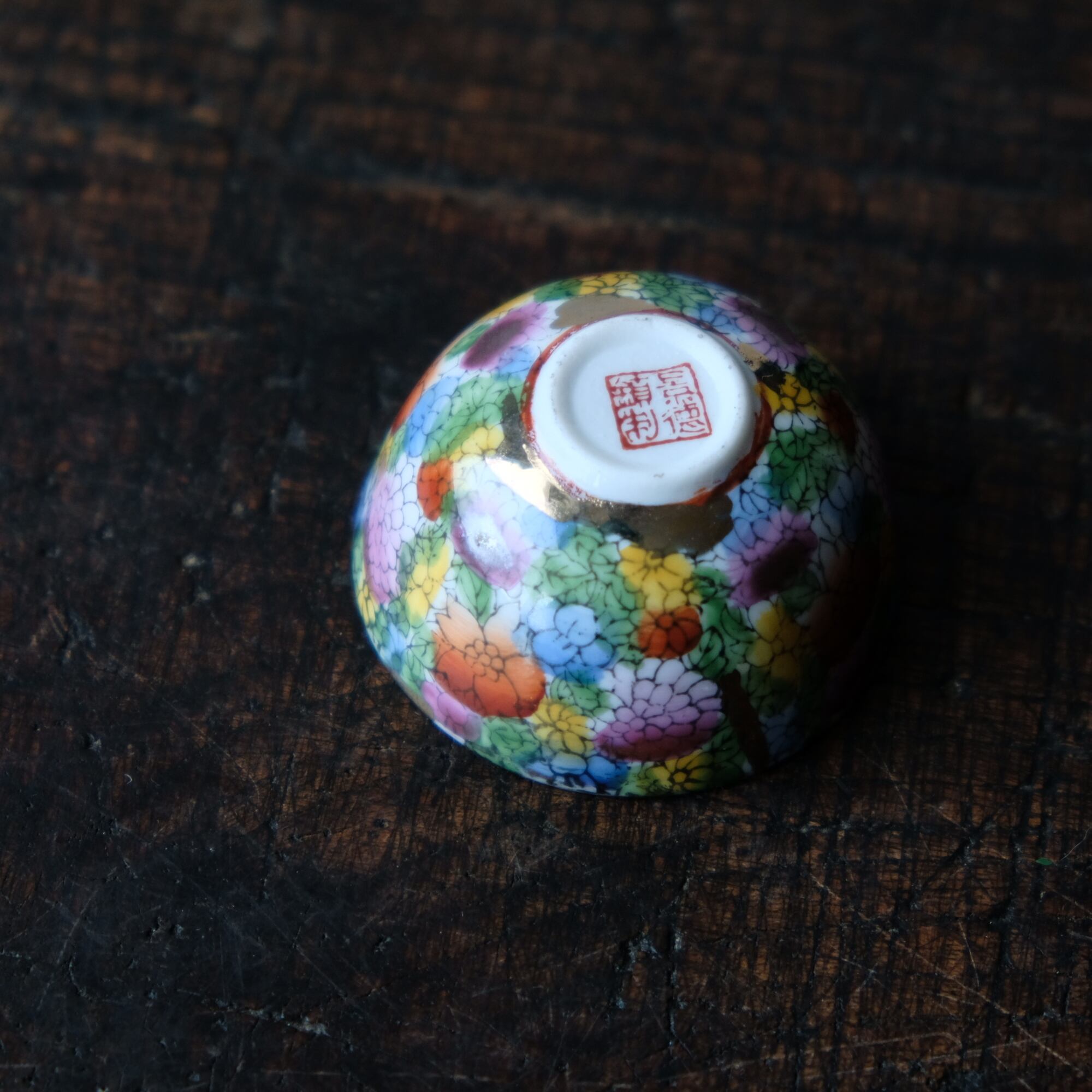 見込みに午(馬)◆チャイナレトロで可愛い。中国景徳鎮 干支 色絵金彩小ぶり猪口 花尽くし シノワズリ