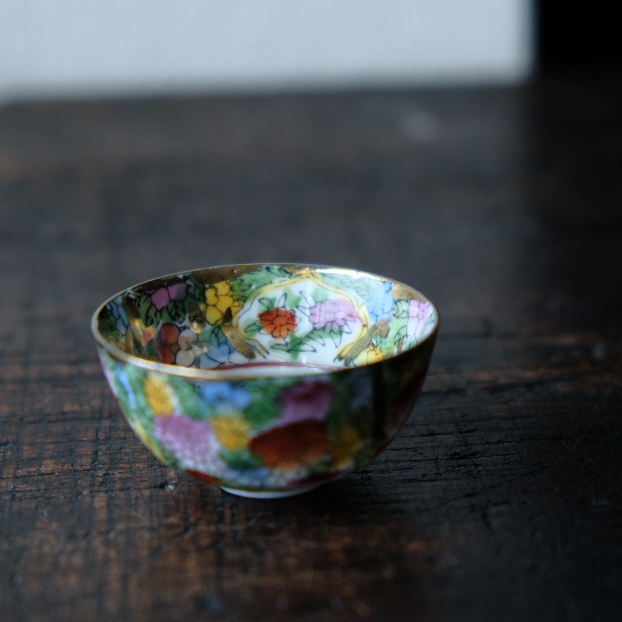 見込みに未(羊(ヤギ)◆チャイナレトロで可愛い。中国景徳鎮 干支 色絵金彩小ぶり猪口 花尽くし シノワズリ