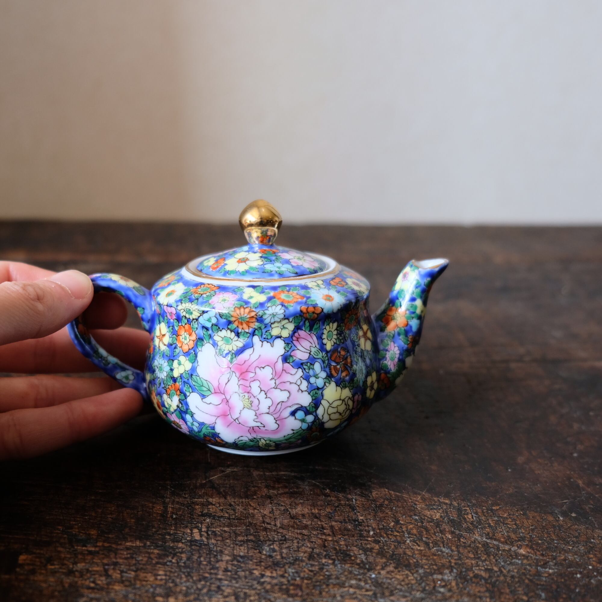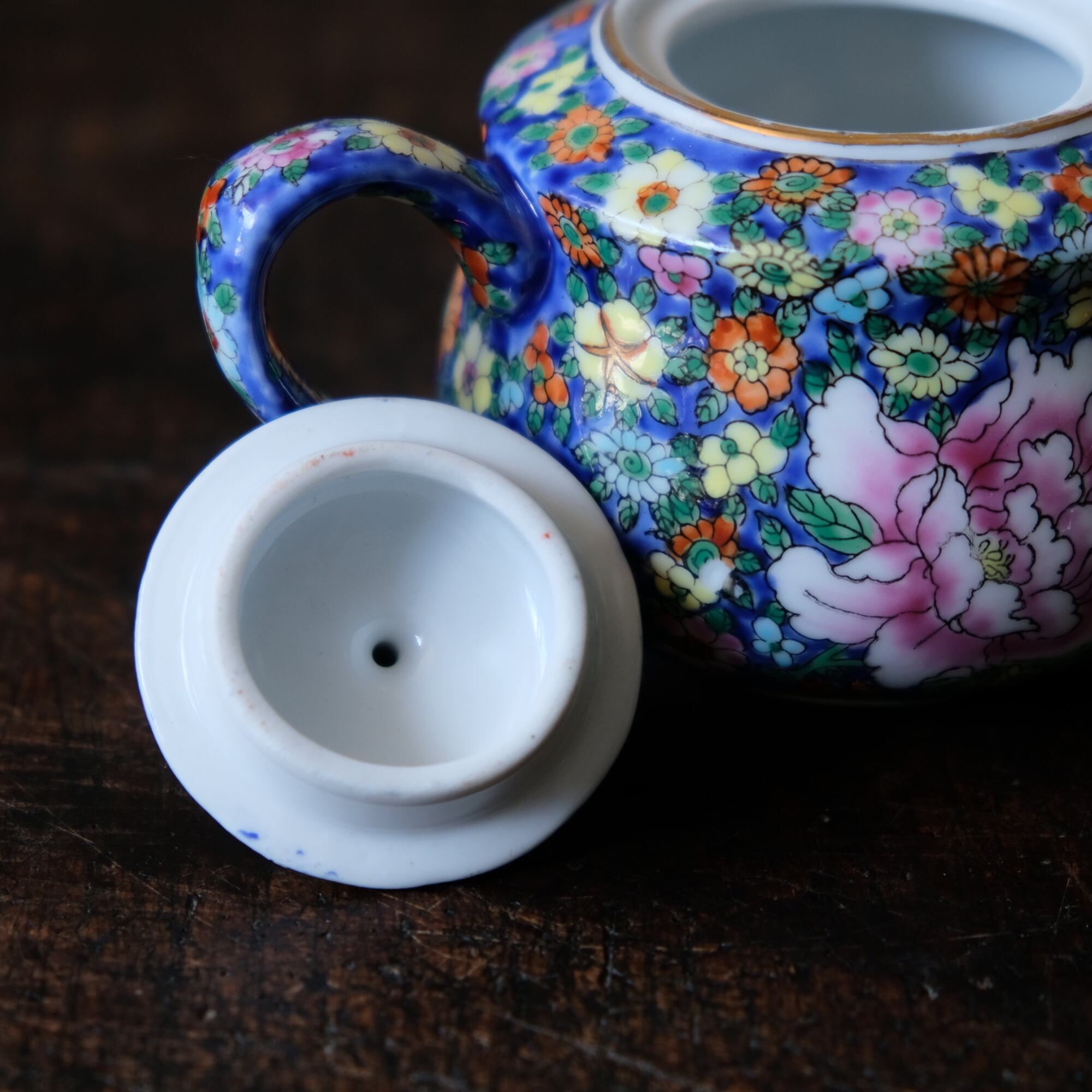 青にカラフルな花尽くし◆中国廣彩 色絵金彩急須 茶器 チャイナレトロ シノワズリ インテリア