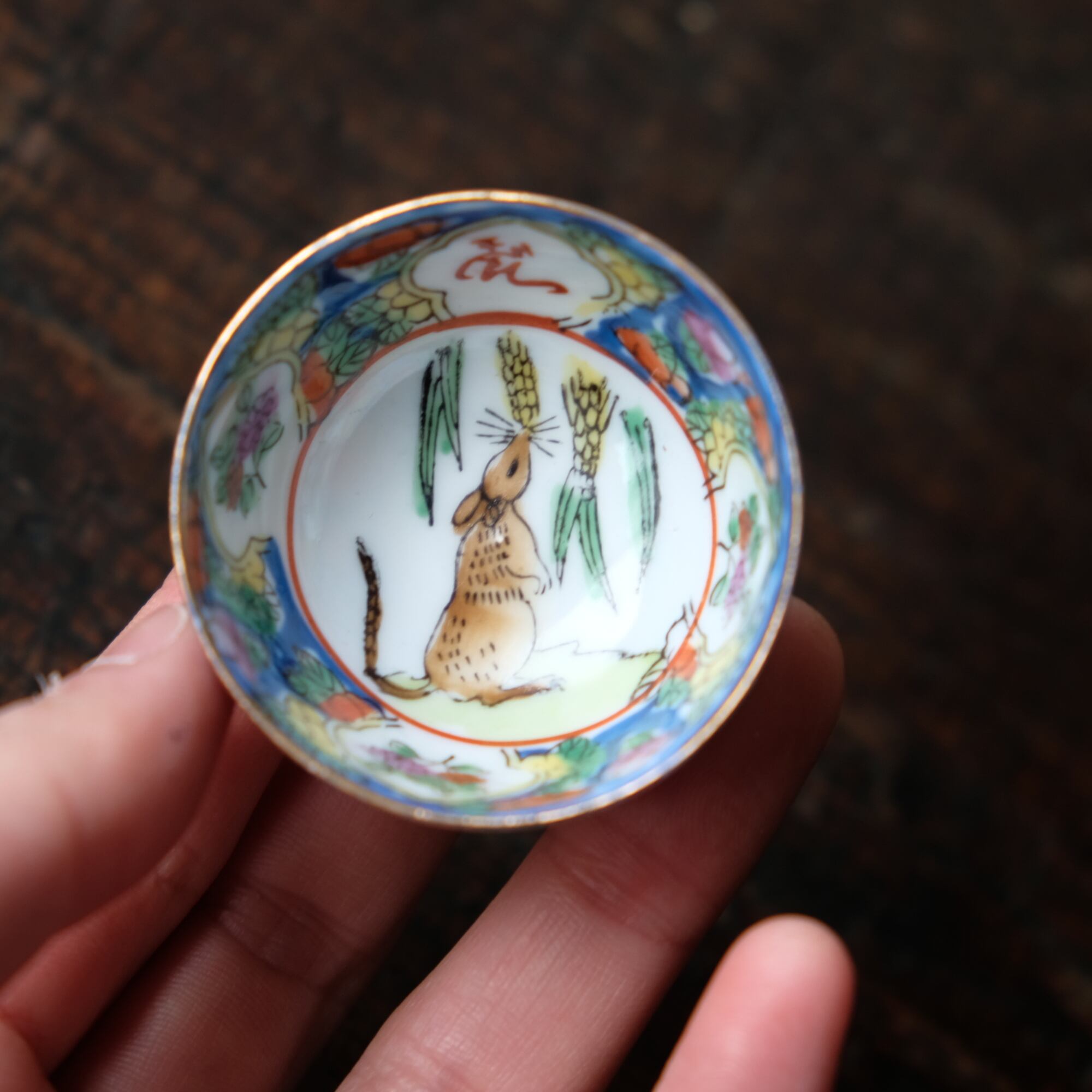 見込みに子(鼠)◆チャイナレトロで可愛い。中国景徳鎮 青 干支 色絵金彩小ぶり猪口 花尽くし。シノワズリ
