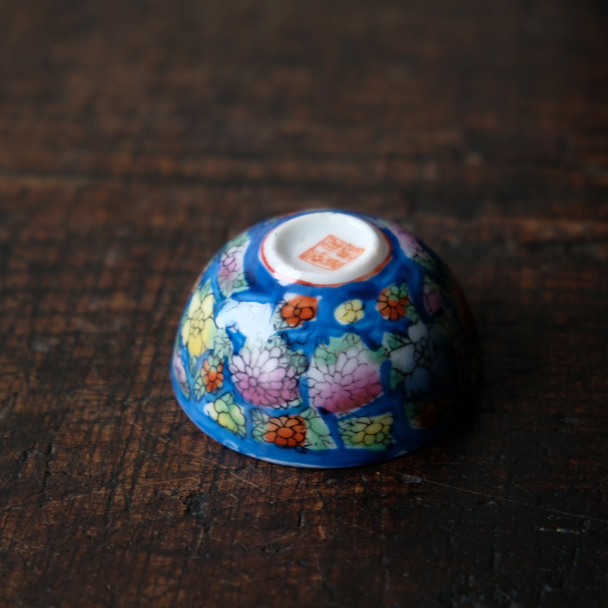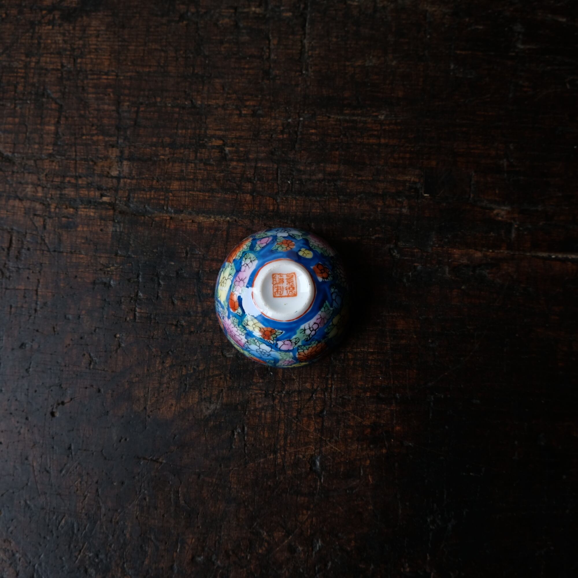見込みに申(猿)◆ ◆チャイナレトロで可愛い。中国景徳鎮 青 干支 色絵金彩小ぶり猪口 花尽くし。シノワズリ