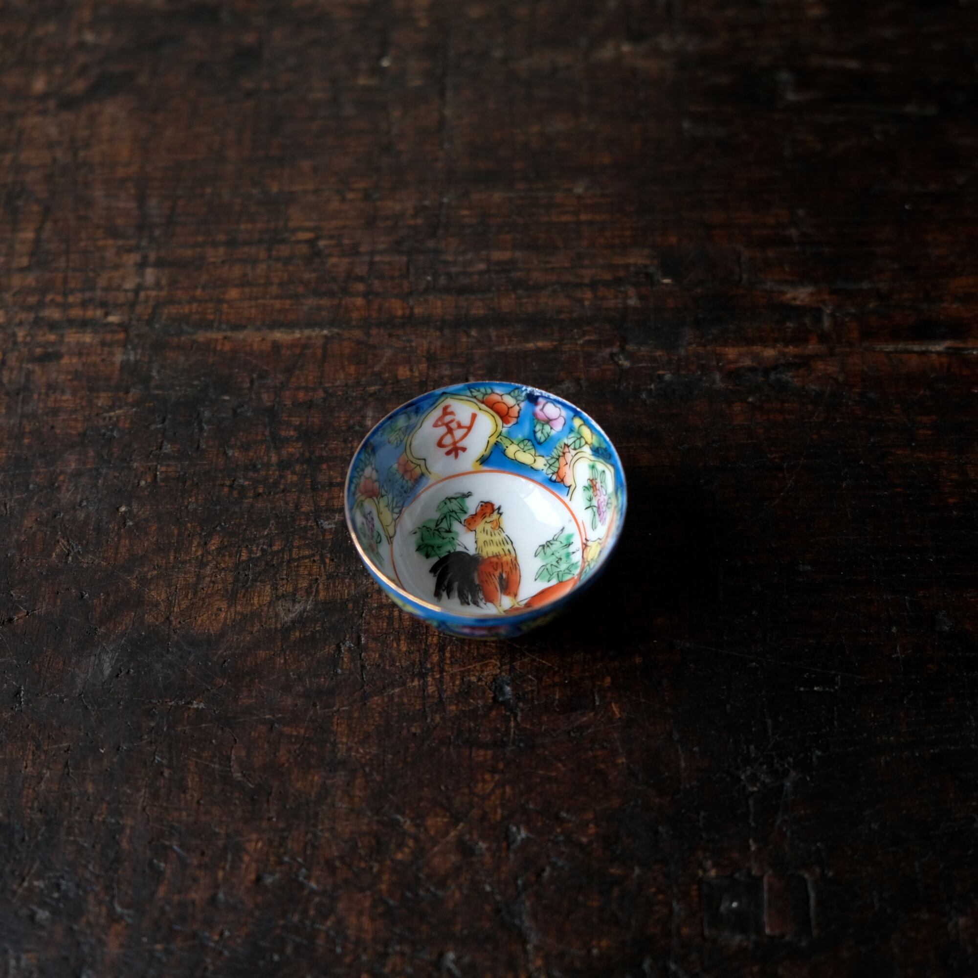 見込みに酉(鳥)◆チャイナレトロで可愛い。中国景徳鎮 青 干支 色絵金彩小ぶり猪口 花尽くし。シノワズリ