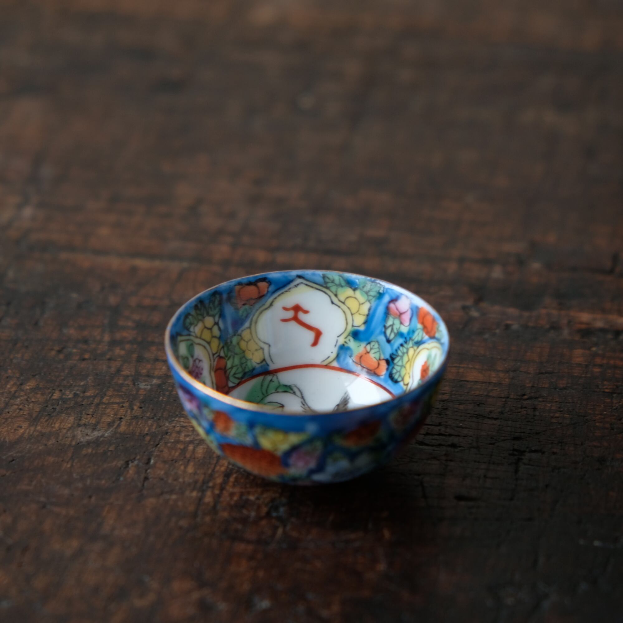 見込みに戌(犬)◆チャイナレトロで可愛い。中国景徳鎮 青 干支 色絵金彩小ぶり猪口 花尽くし。シノワズリ