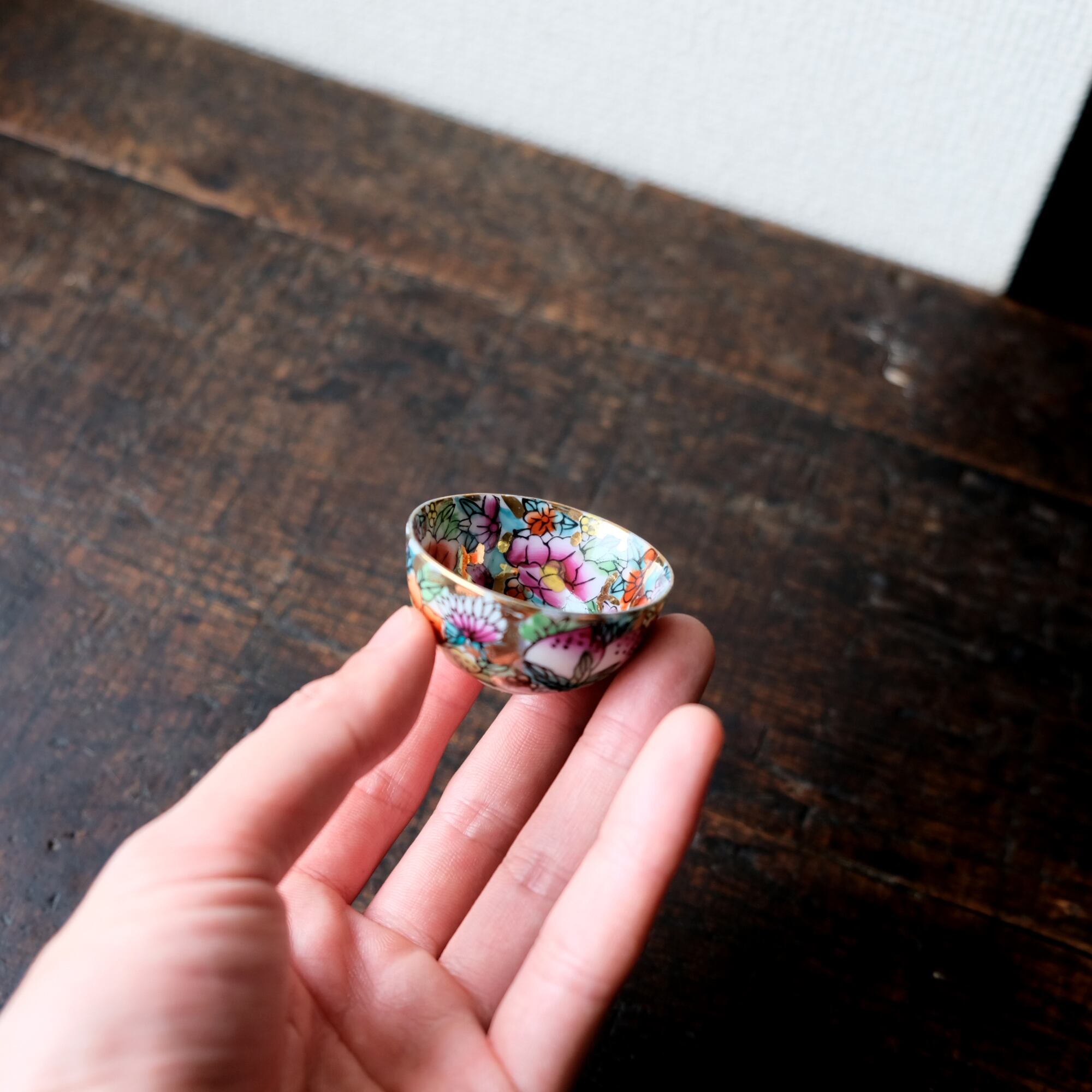 見込みに午(馬)◆チャイナレトロで可愛い。中国製造 干支 色絵金彩小ぶり猪口 花尽くし。シノワズリ