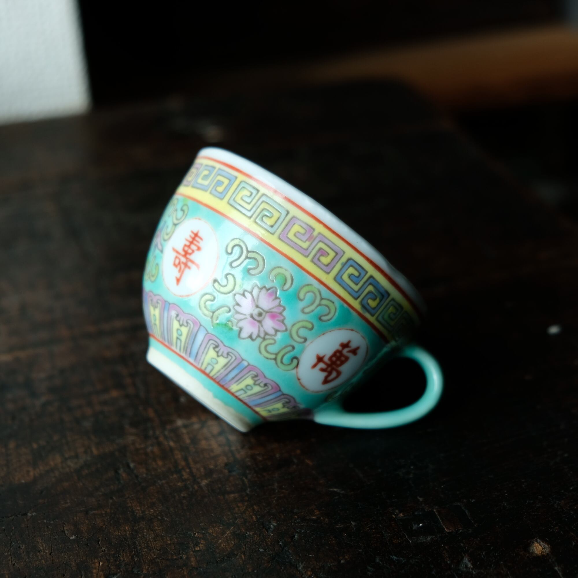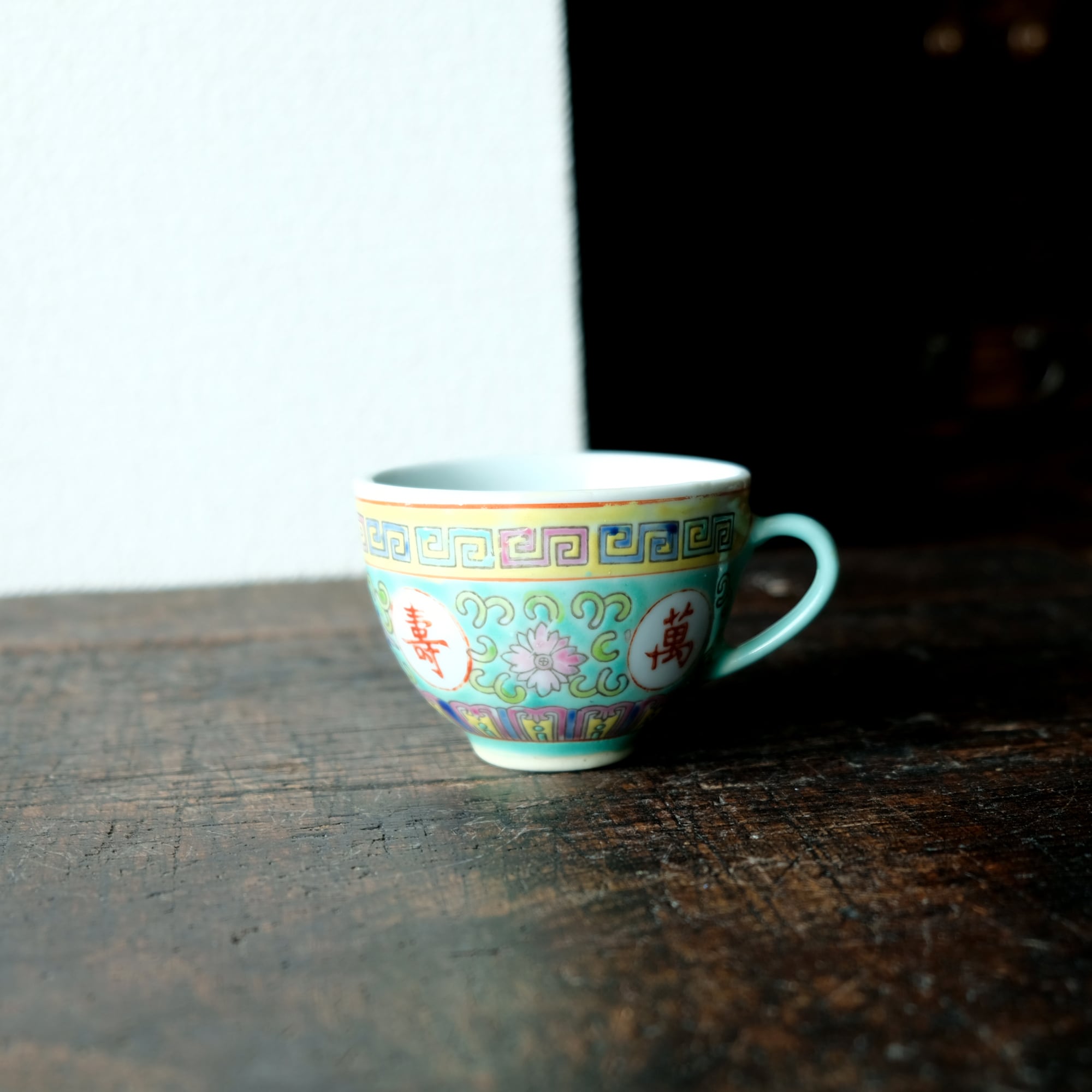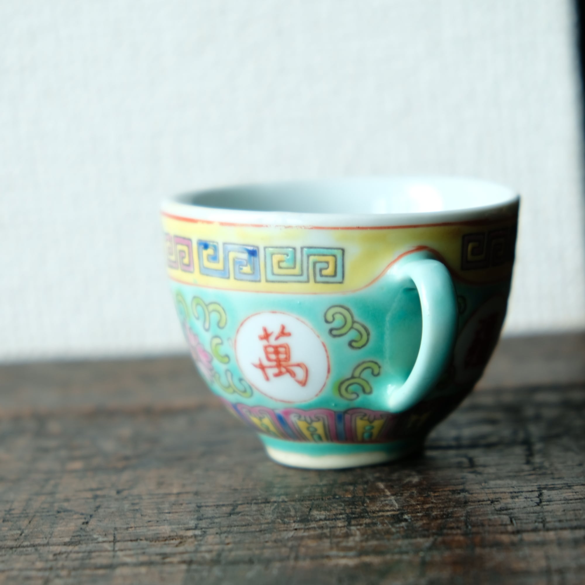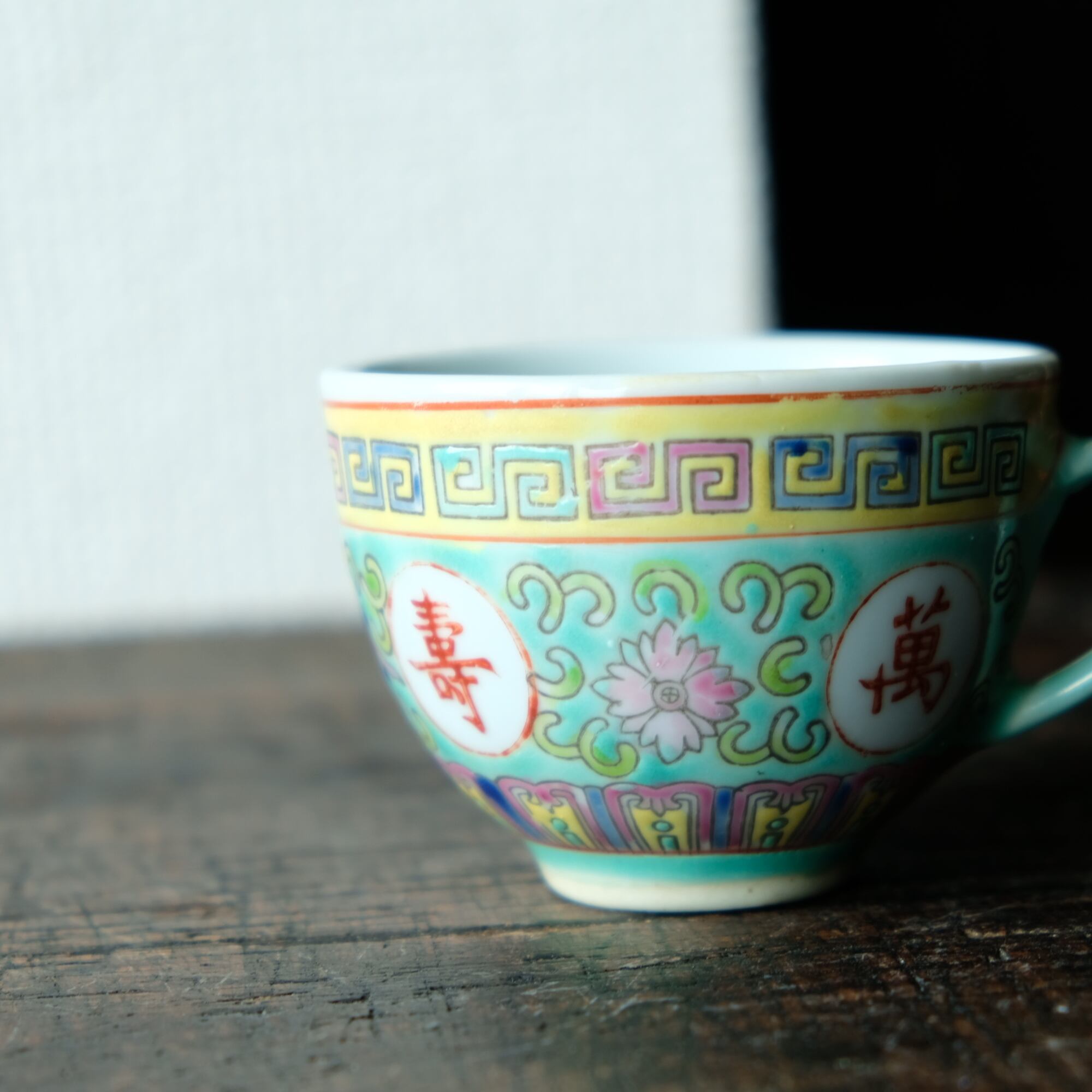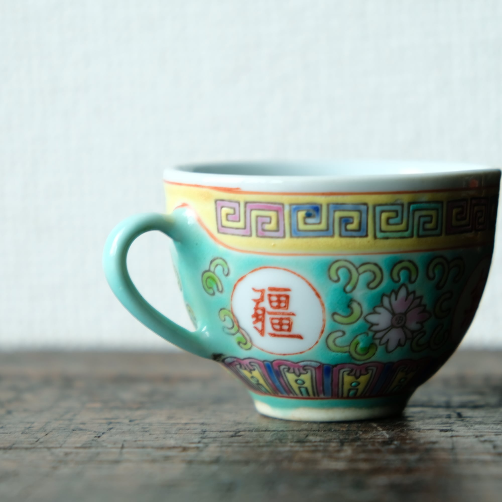 ビビット調のカラーで可愛い◆花唐草と漢字。中国景徳鎮 色絵カップ 茶器 シノワズリ ポップ チャイナレトロ