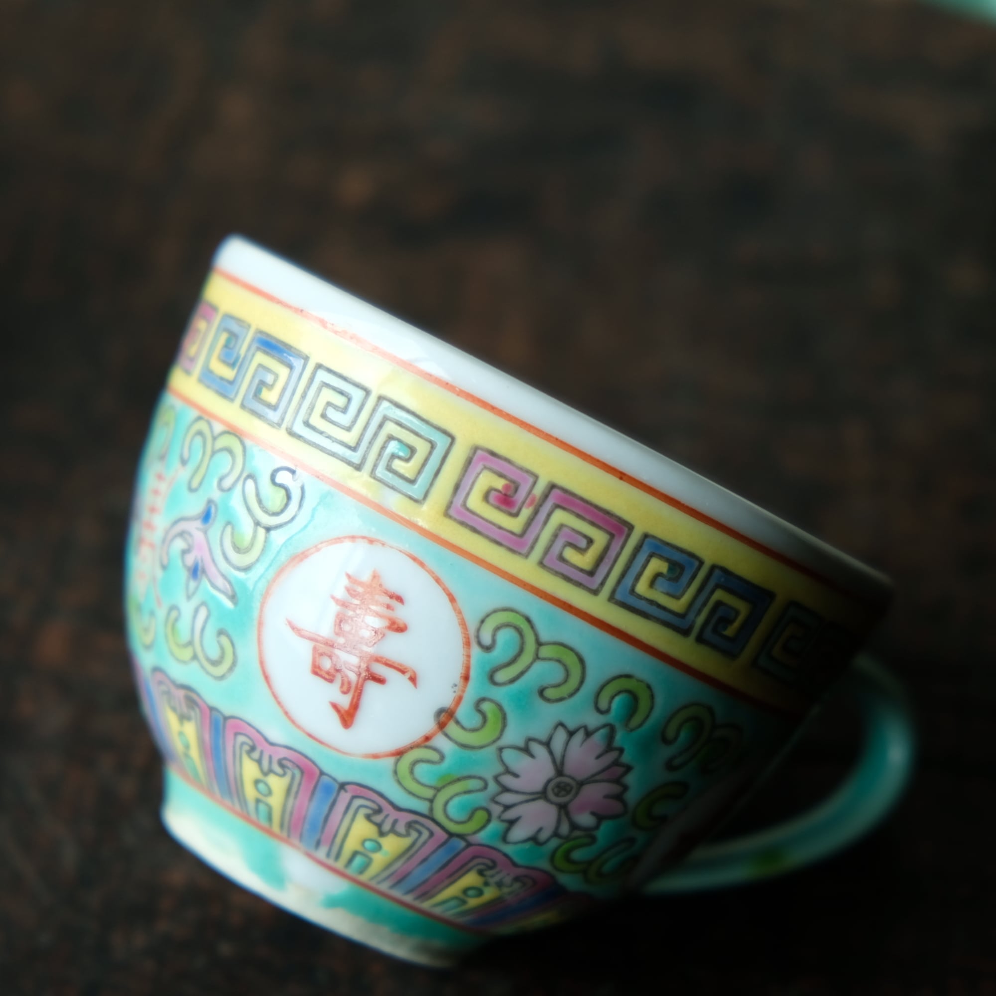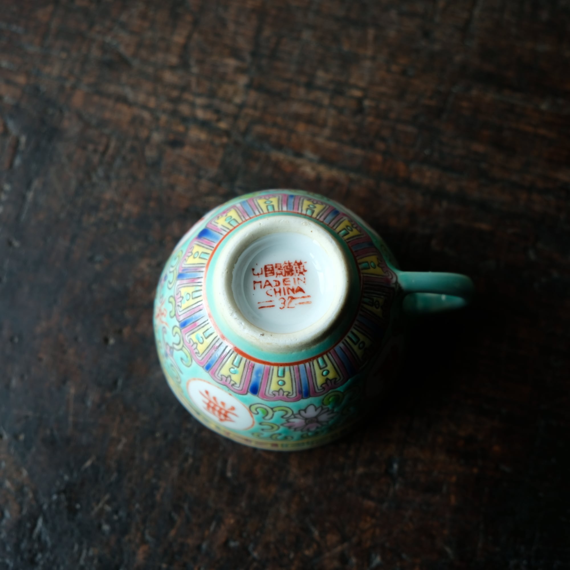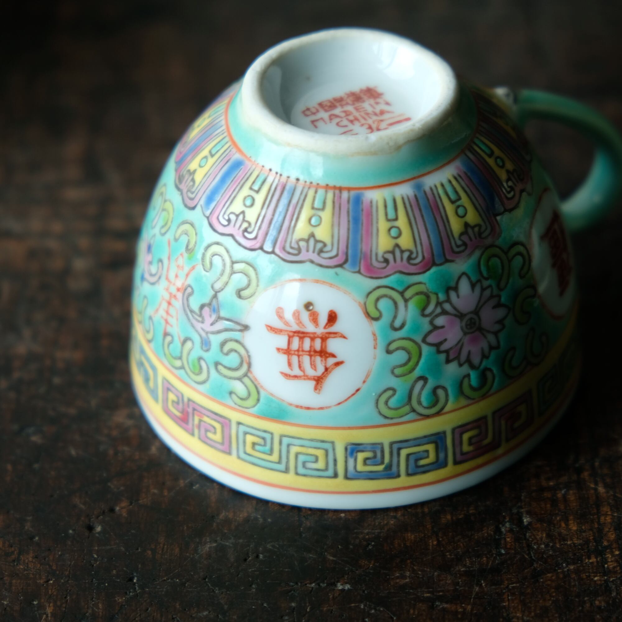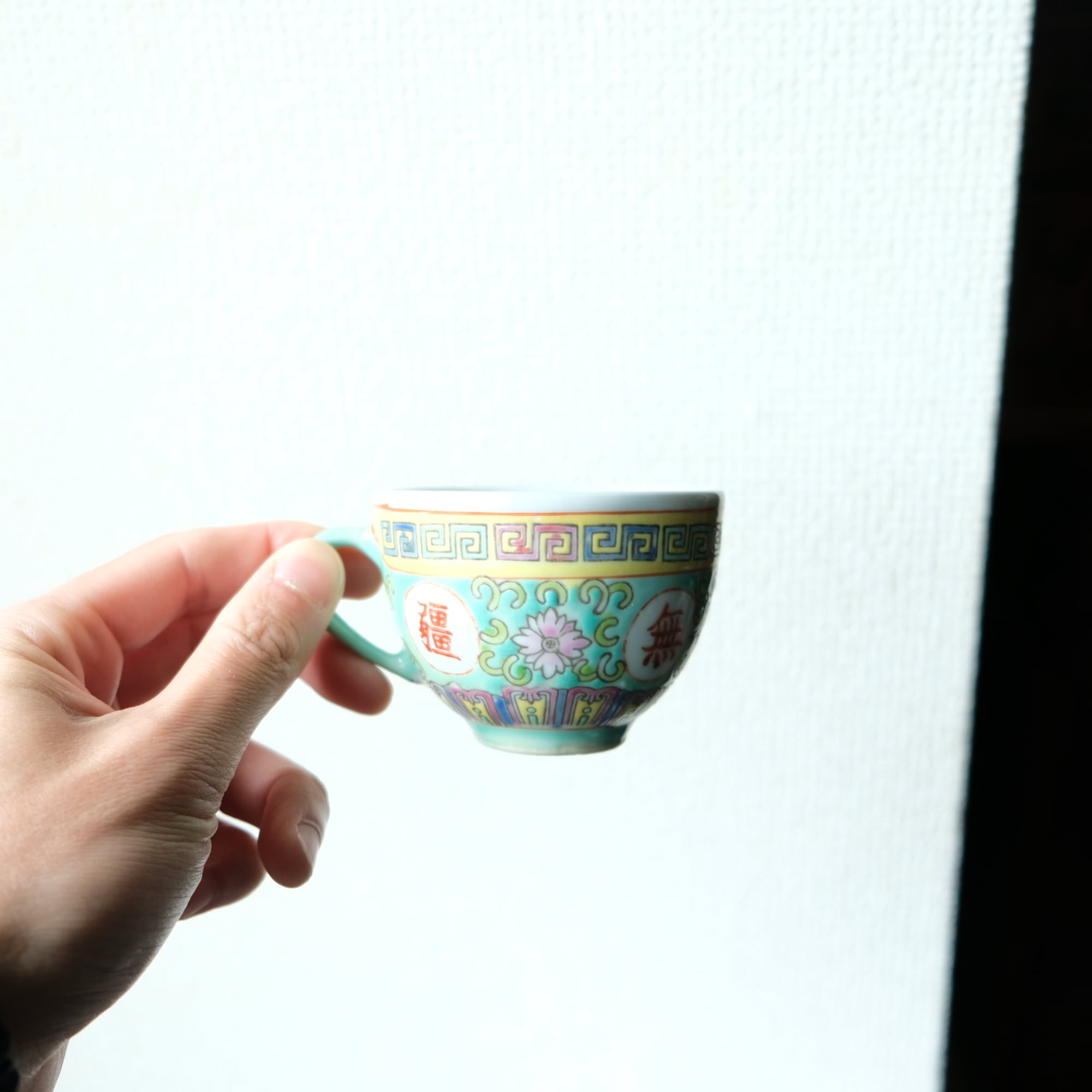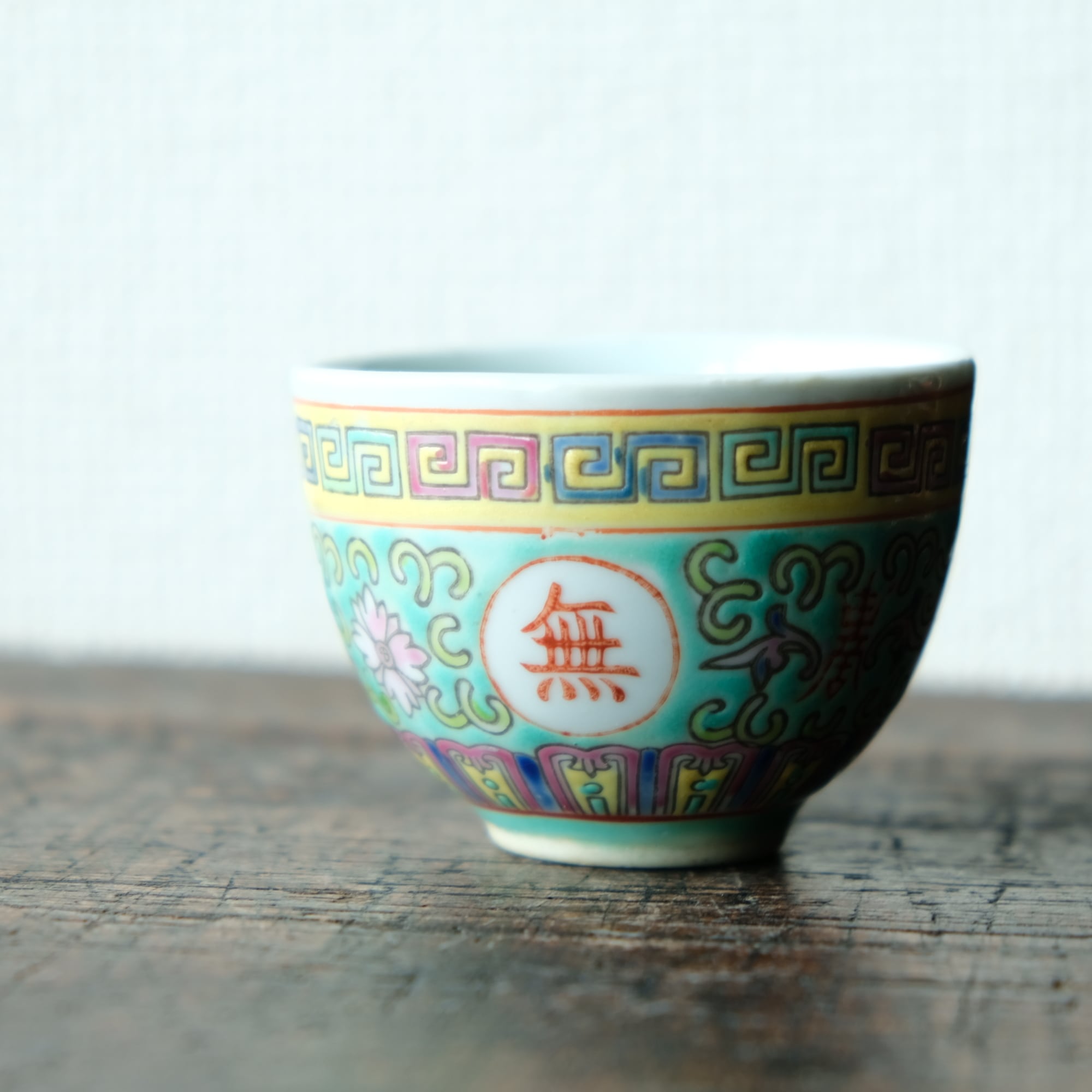 ビビット調のカラーで可愛い◆花唐草と漢字。中国景徳鎮 色絵カップ 茶器 シノワズリ ポップ チャイナレトロ