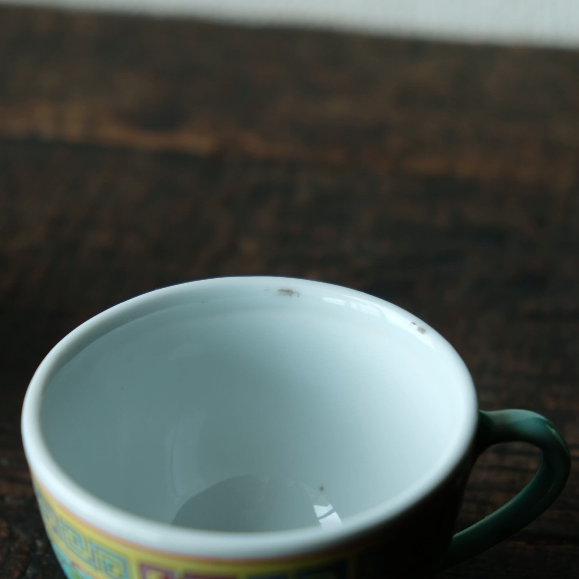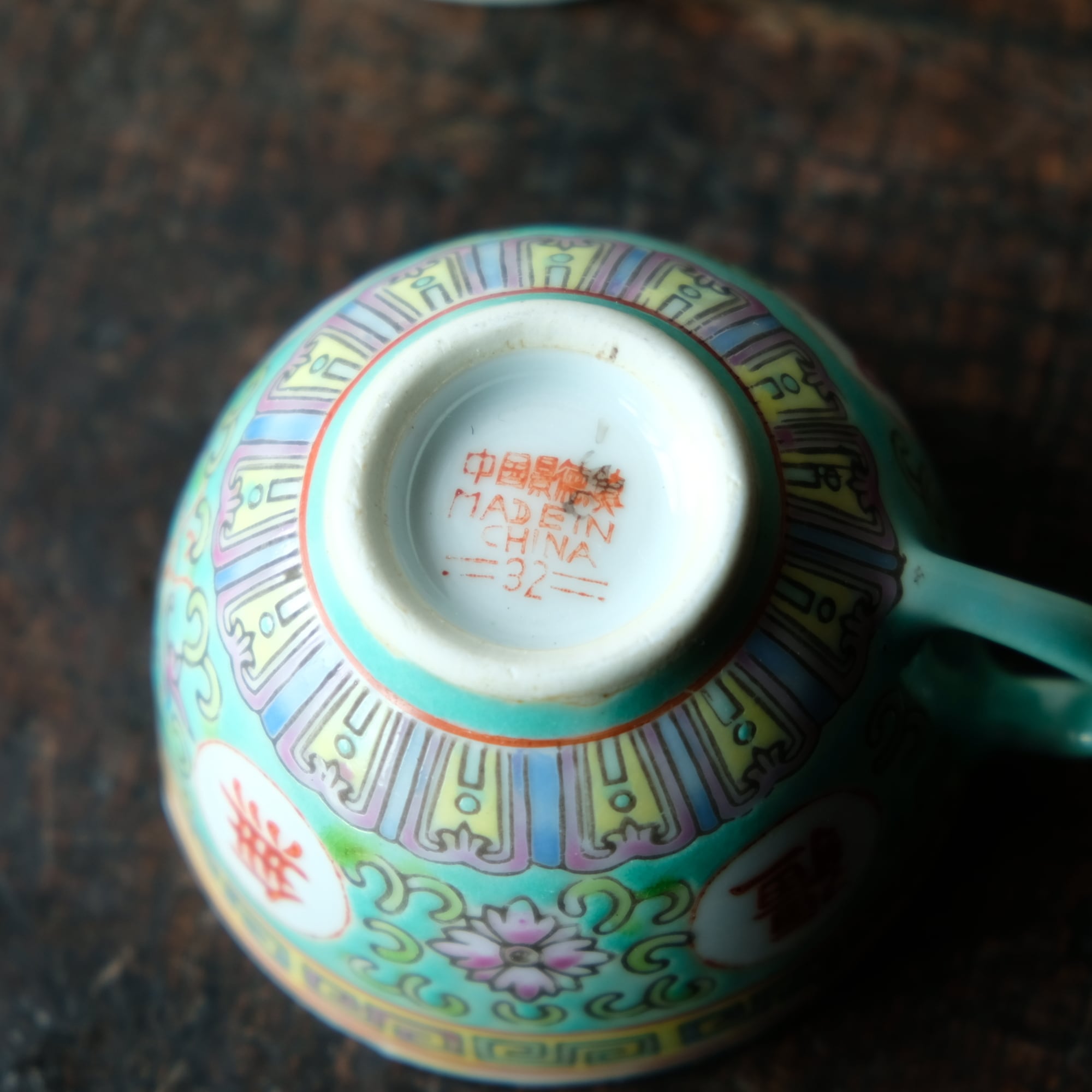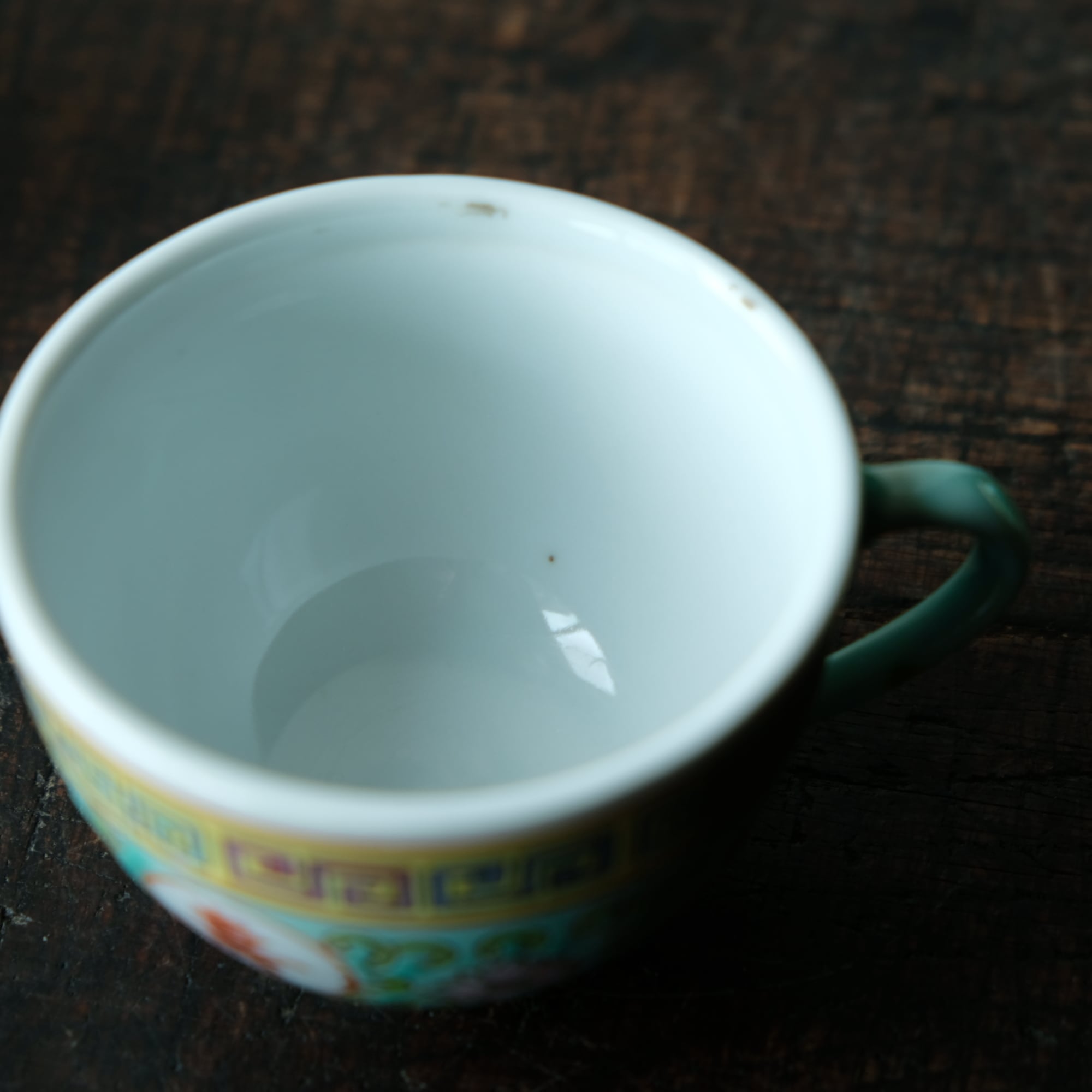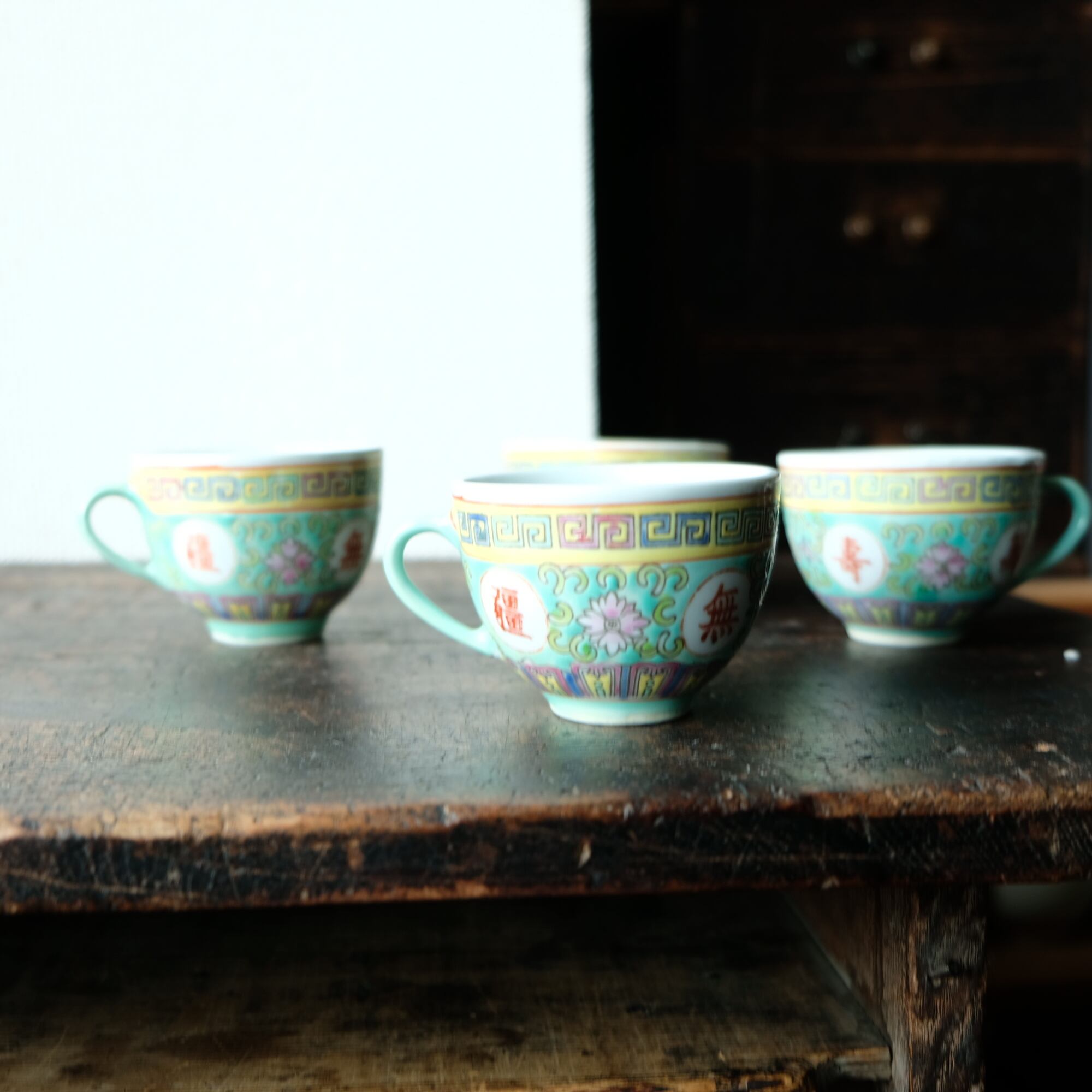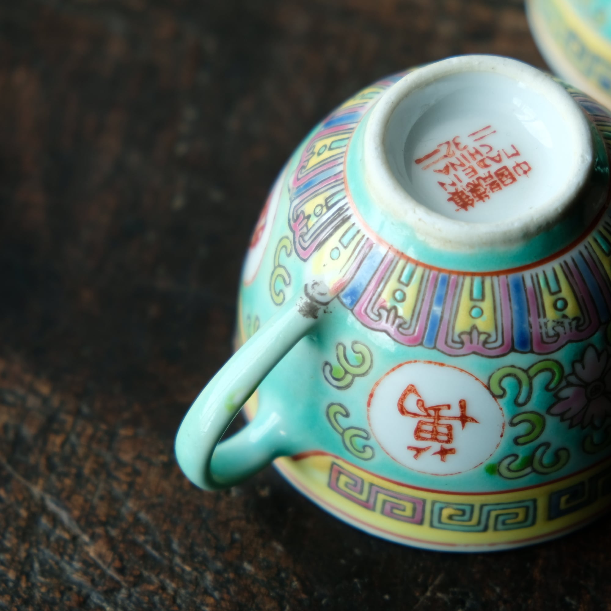 ビビット調のカラーで可愛い◆花唐草と漢字。中国景徳鎮 色絵カップ 茶器 シノワズリ ポップ チャイナレトロ
