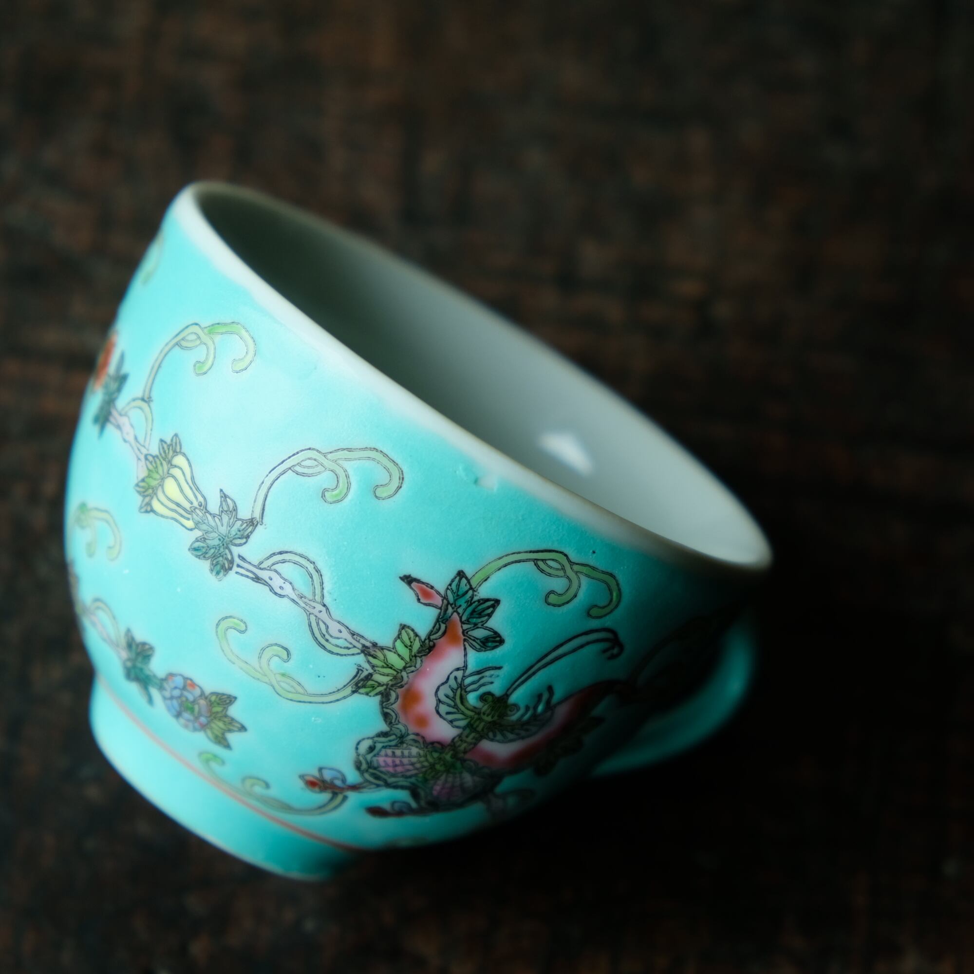 ビビット調のカラーで可愛い◆花と蝶々。中国景徳鎮 色絵カップ 茶器 シノワズリ ポップ チャイナレトロ