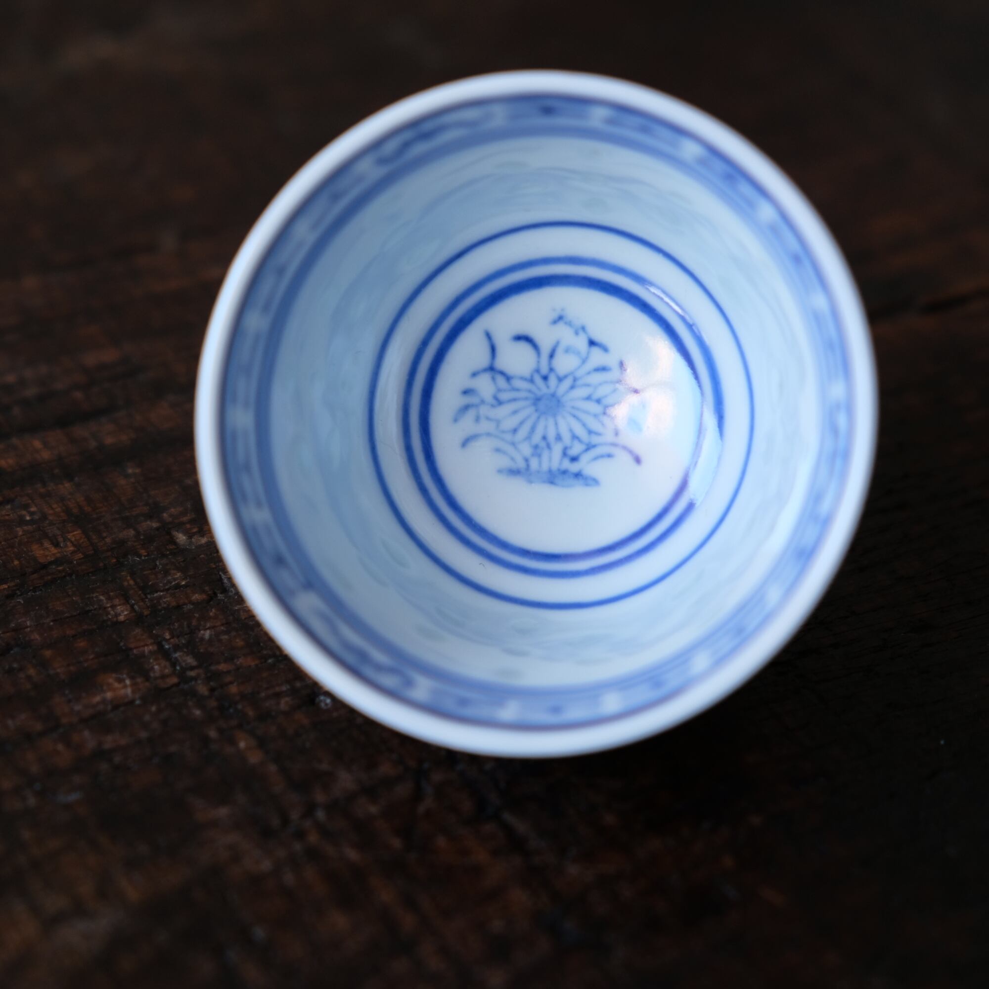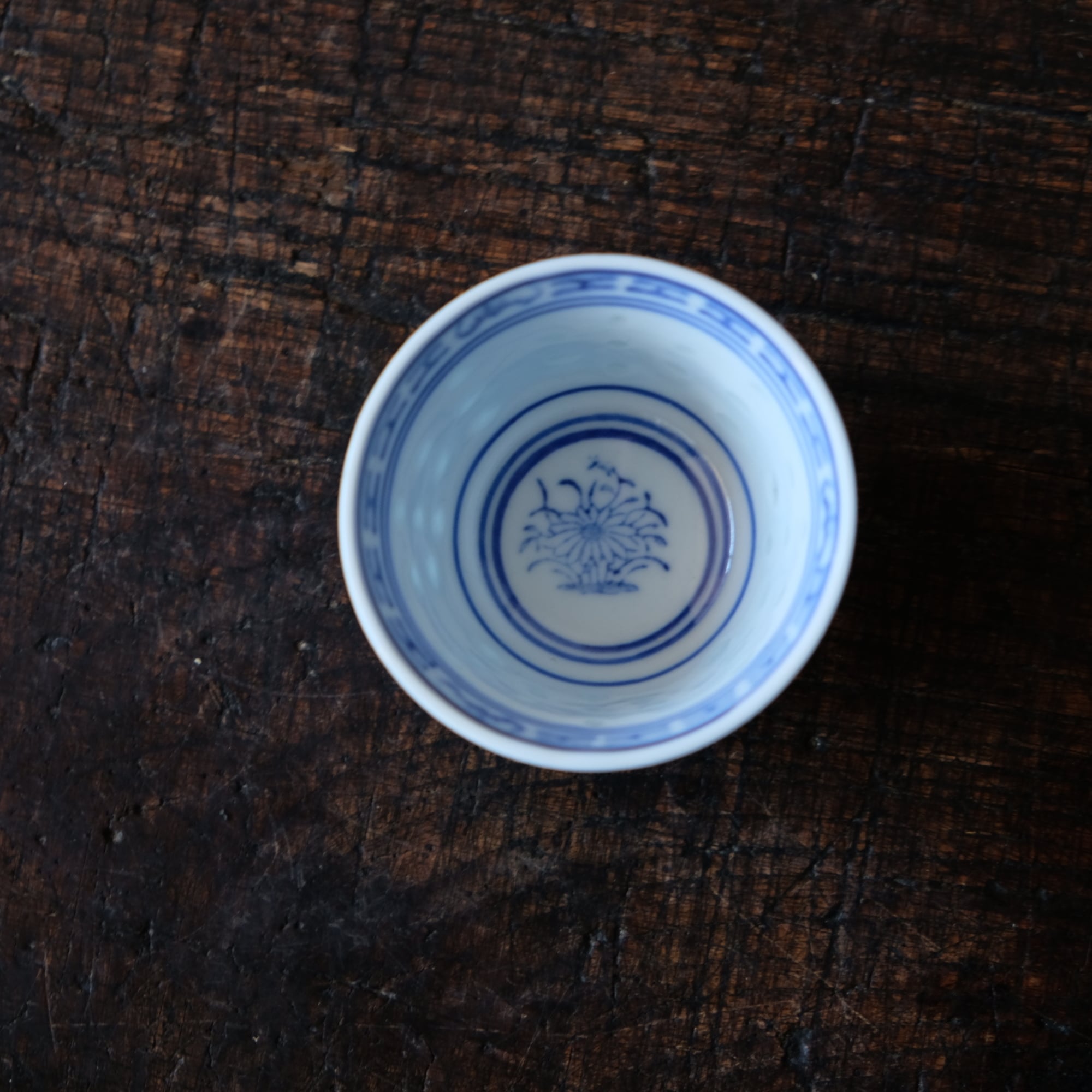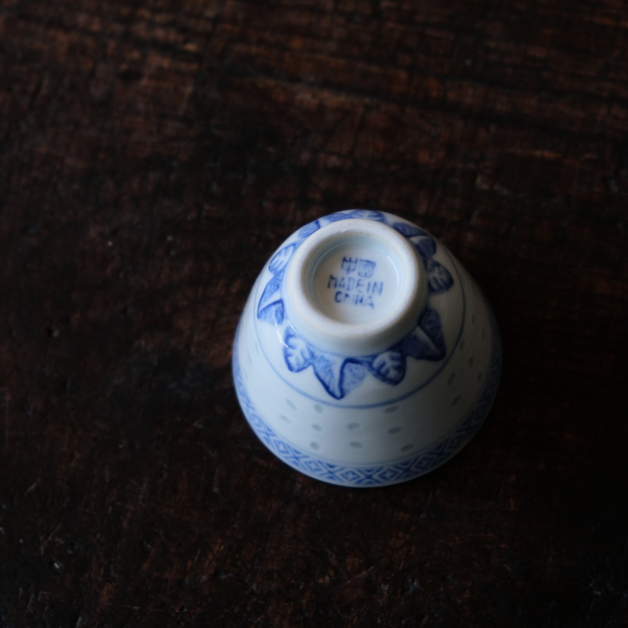チャイナレトロで可愛い◇見込みに青花。中国景徳鎮 蛍焼染付猪口 茶杯 湯呑み 蝙蝠 シノワズリ