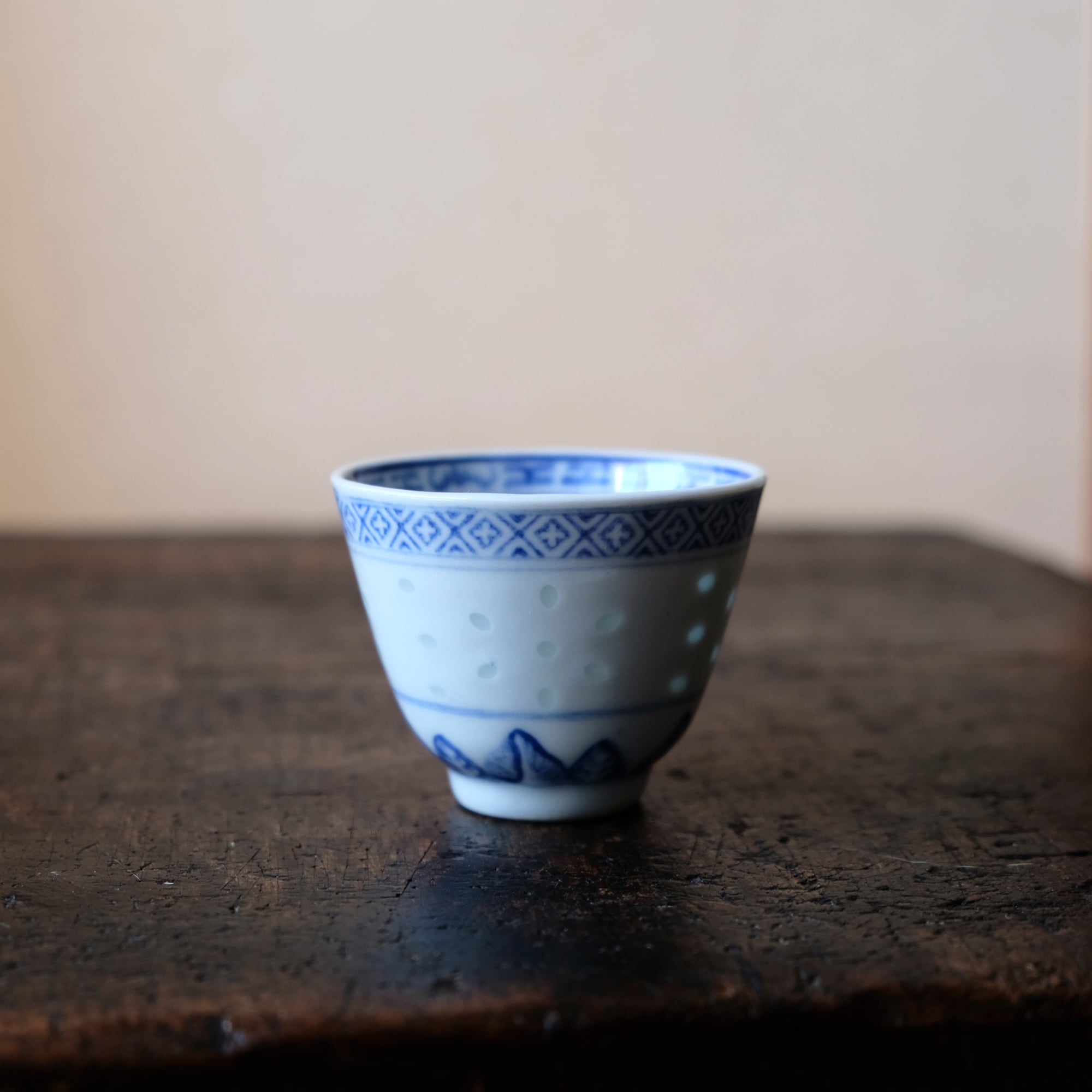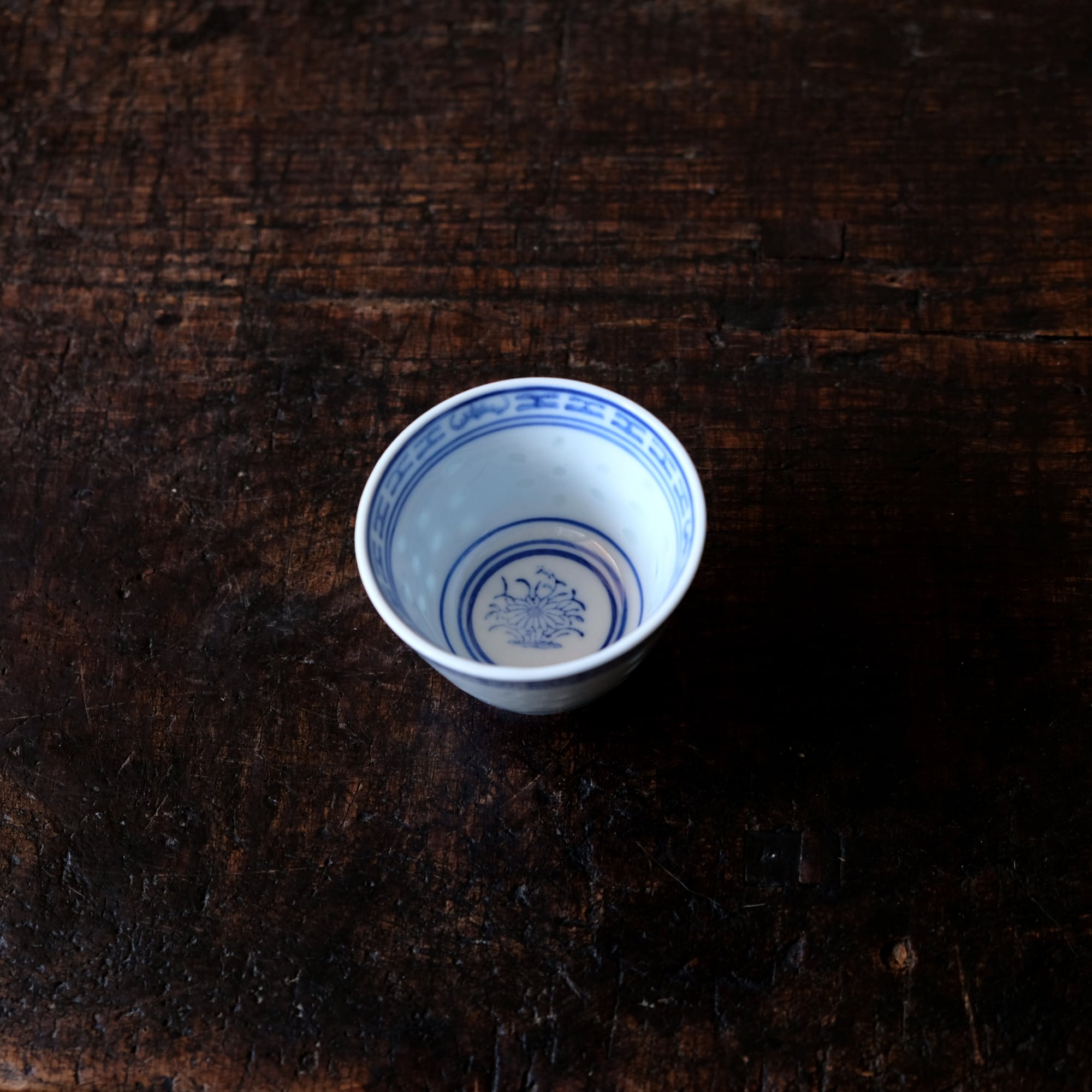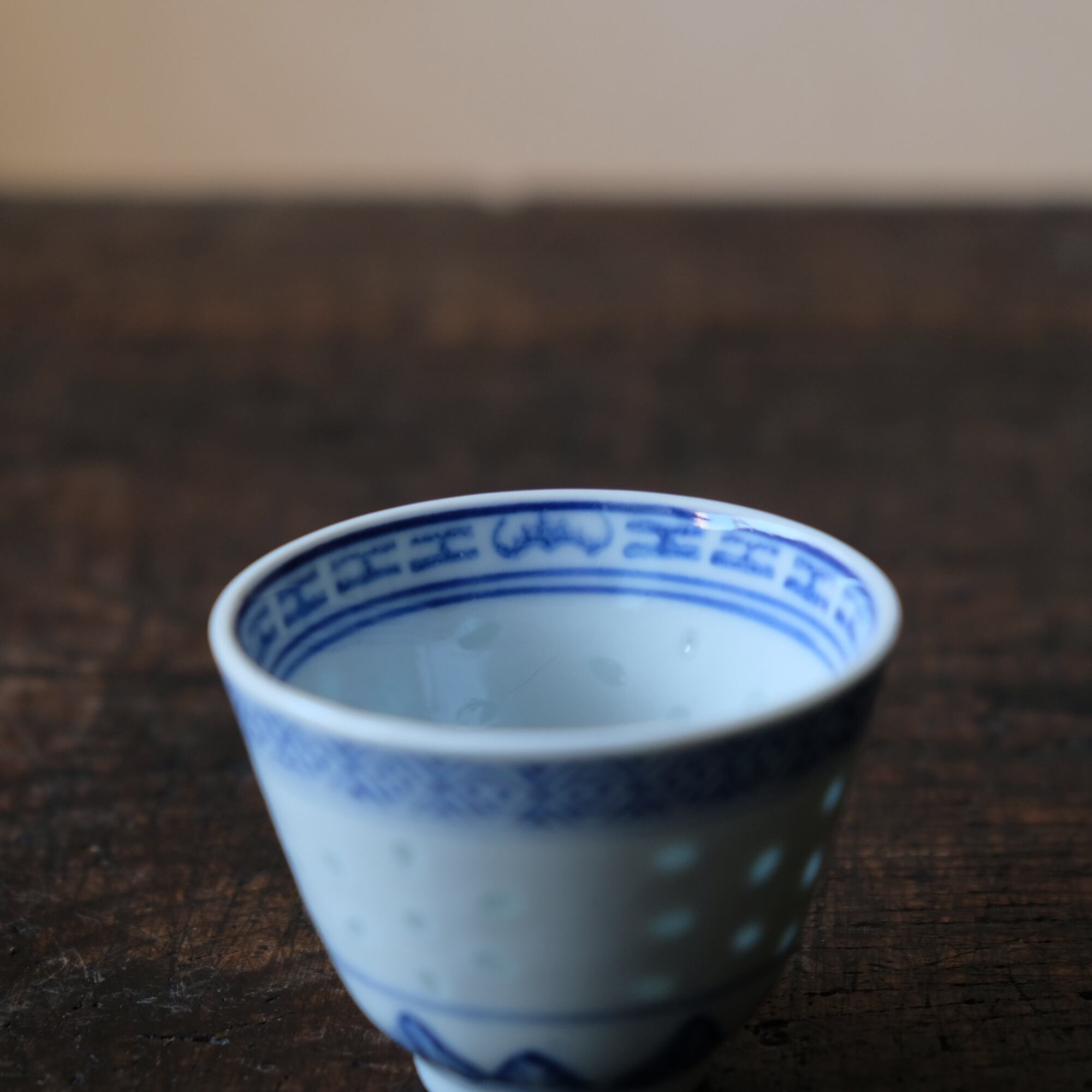 チャイナレトロで可愛い◇見込みに青花。中国景徳鎮 蛍焼染付猪口 茶杯 湯呑み 蝙蝠 シノワズリ