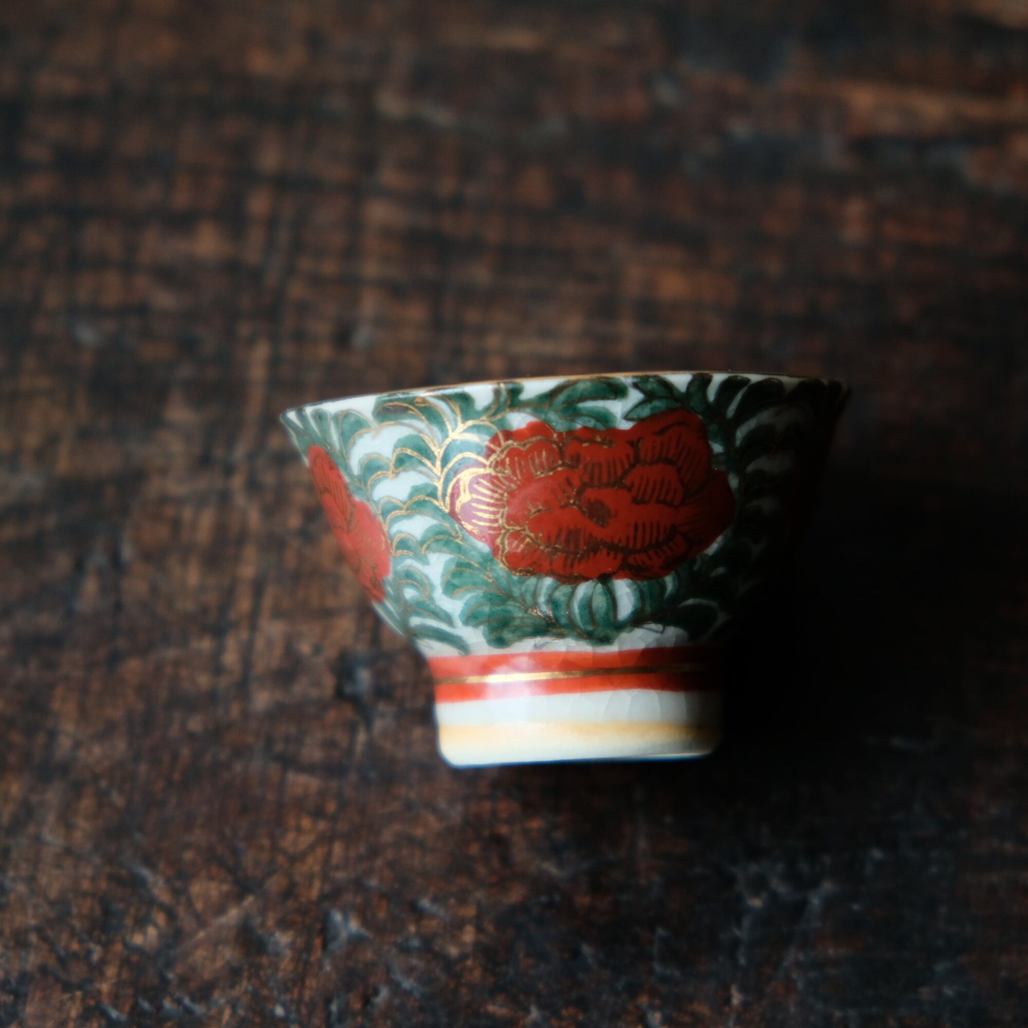 花とリーフ◆九谷焼 赤絵金彩猪口 酒器 インテリア 昭和レトロ ヴィンテージ 古物 骨董好きにも。