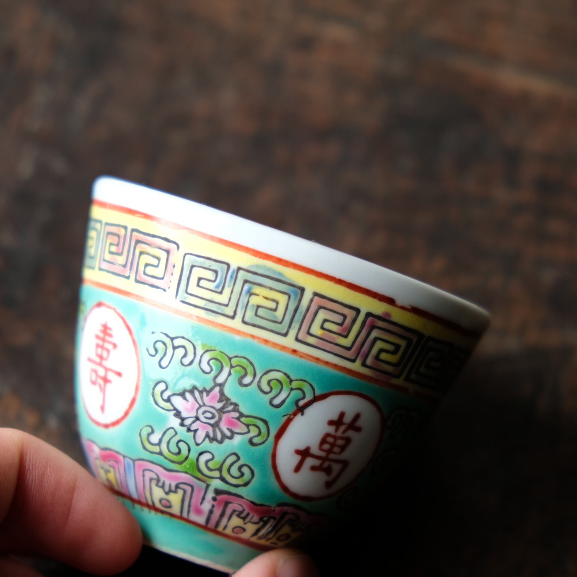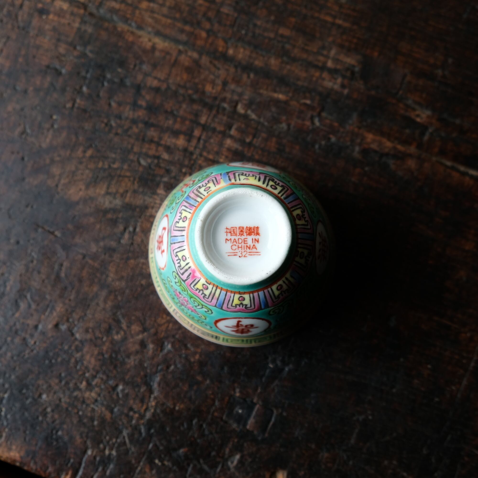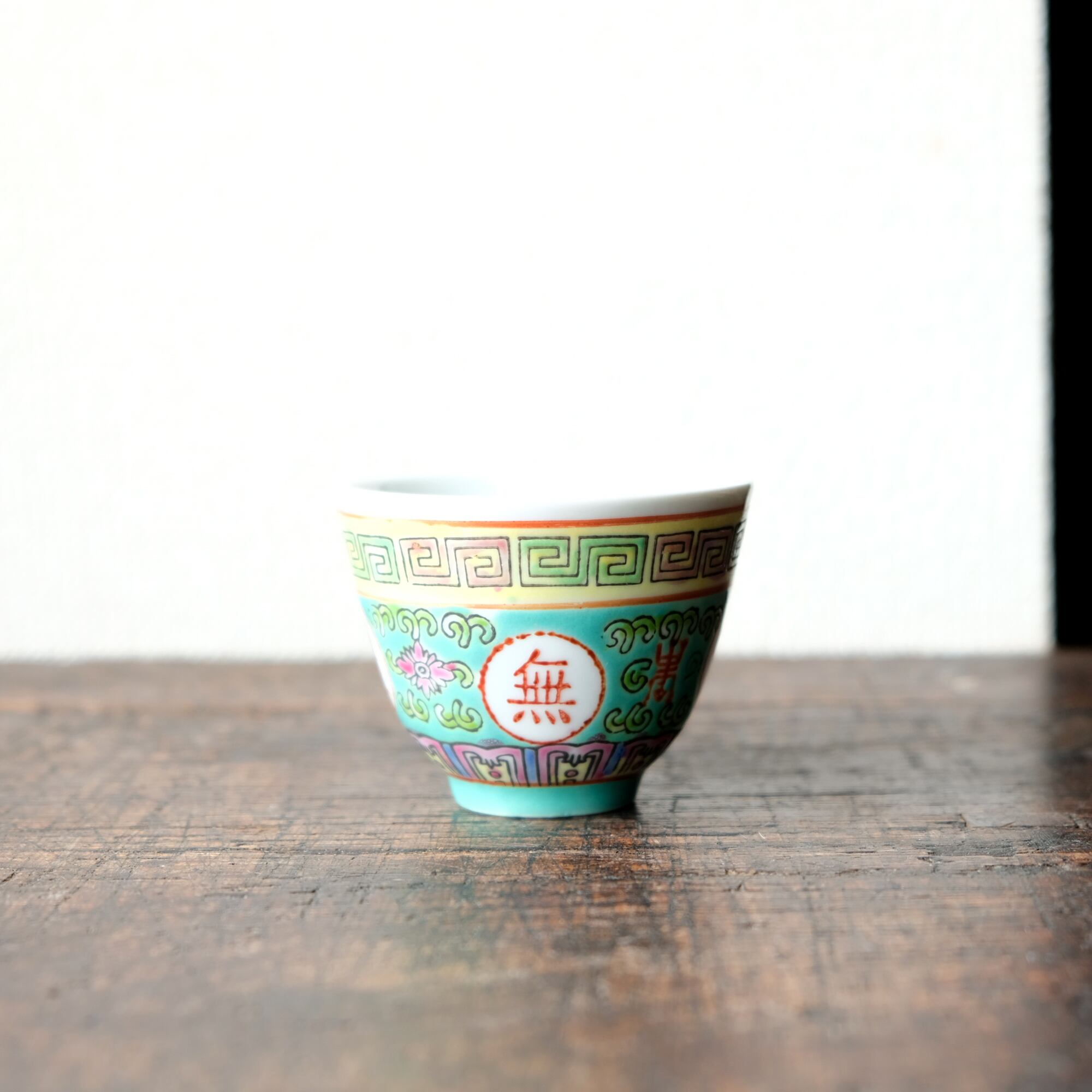 チャイナレトロで可愛い◇萬壽無彊。中国景徳鎮 花文色絵猪口 茶杯 花唐草 中華・台湾料理 ビビットグリーン