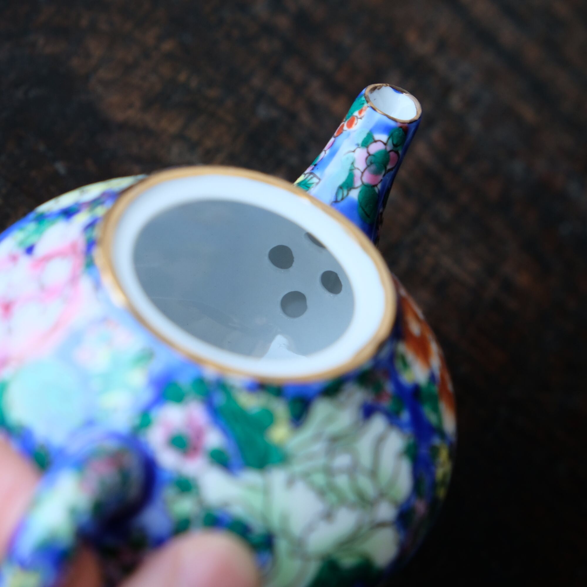 濃い青にカラフルな草花尽くし◇中国産 色絵金彩小ぶり急須 煎茶茶器 青 チャイナレトロ シノワズリ #3