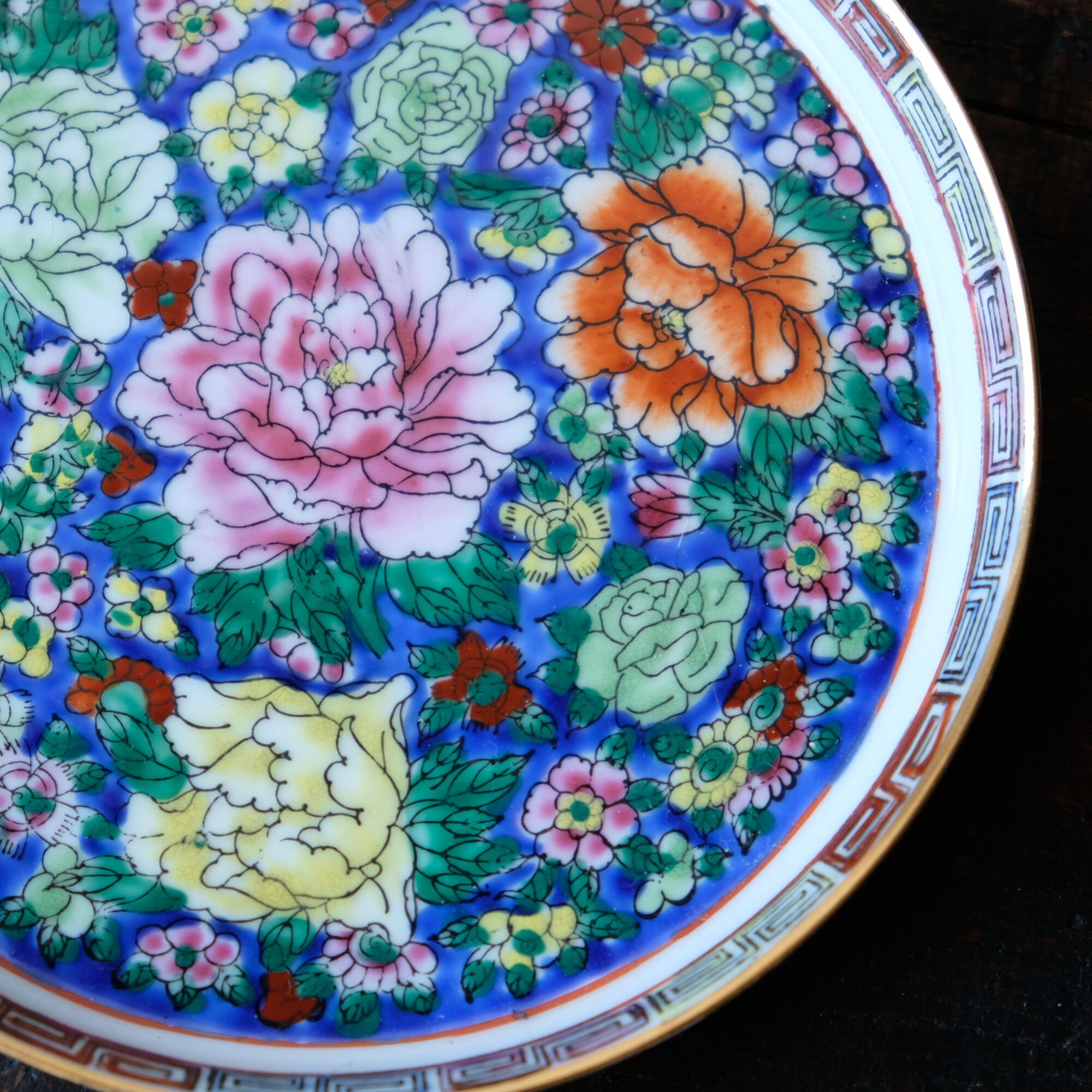 濃い青にカラフルな草花尽くし◇中国産 色絵金彩中皿プレート 煎茶茶器 青 チャイナレトロ シノワズリ #3