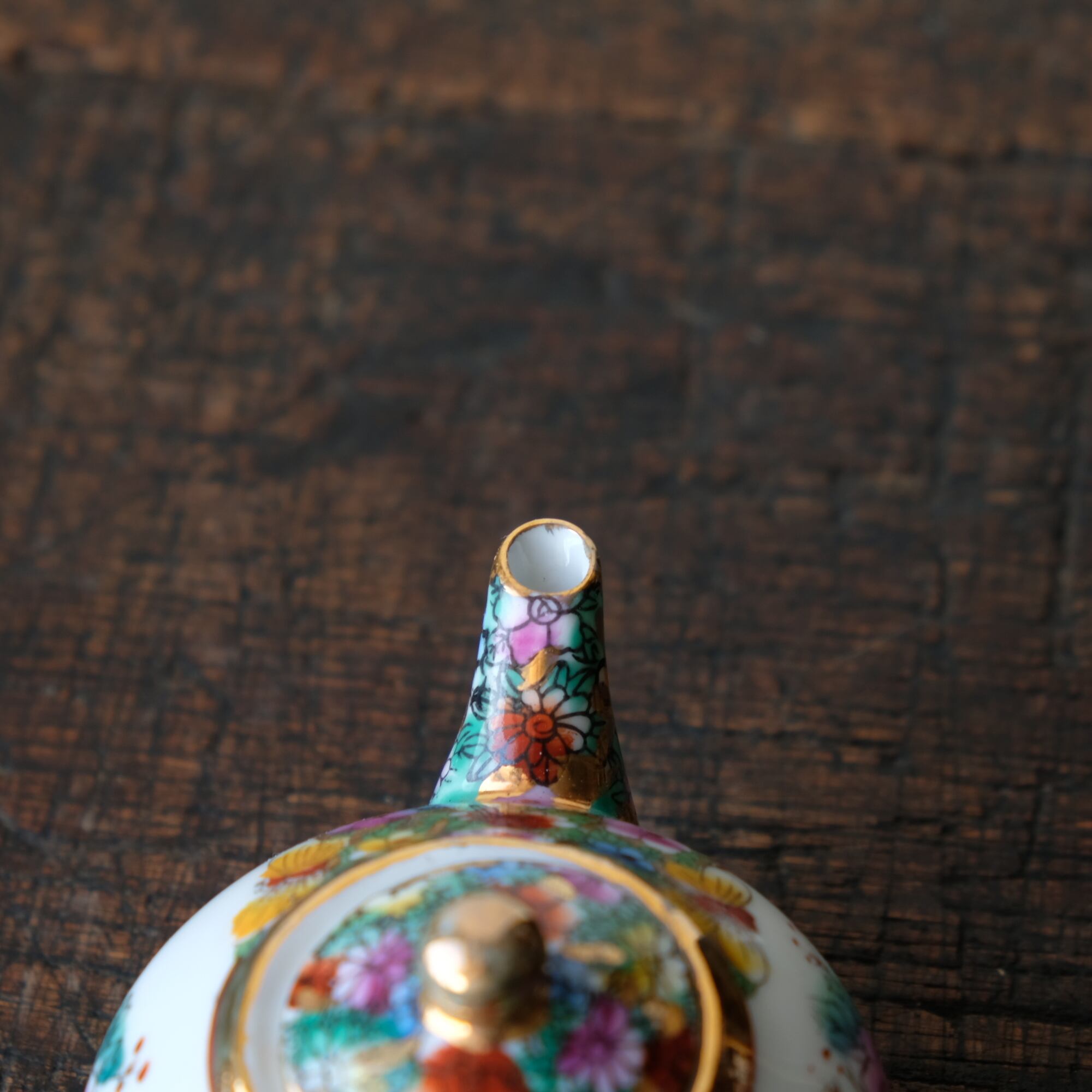 ピンクの牡丹◆花と蝶々。中国産 色絵金彩小ぶり急須 煎茶茶器 オブジェ チャイナレトロ シノワズリ