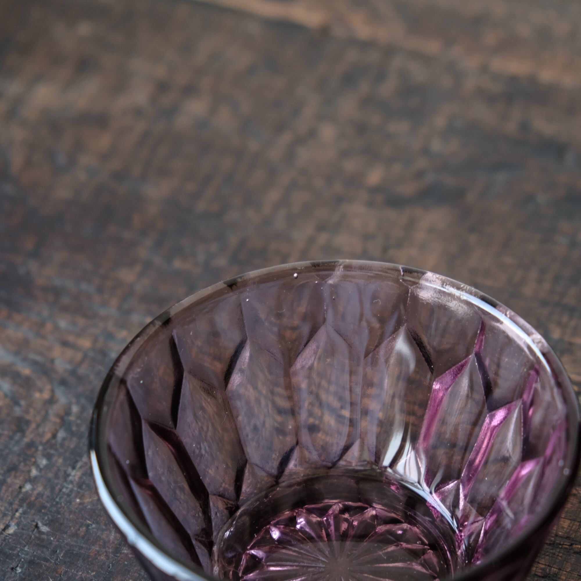 ギザギザで素敵◆見込みに花文様。昭和期 プレスガラス小鉢 昭和レトロ 戦後 古道具 古民家 薄紫