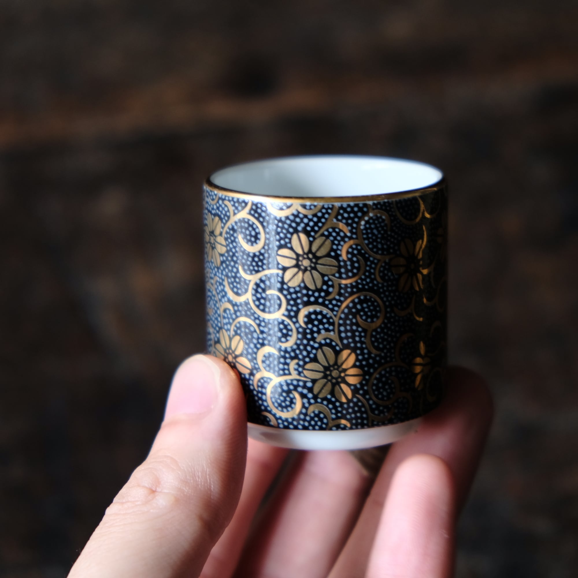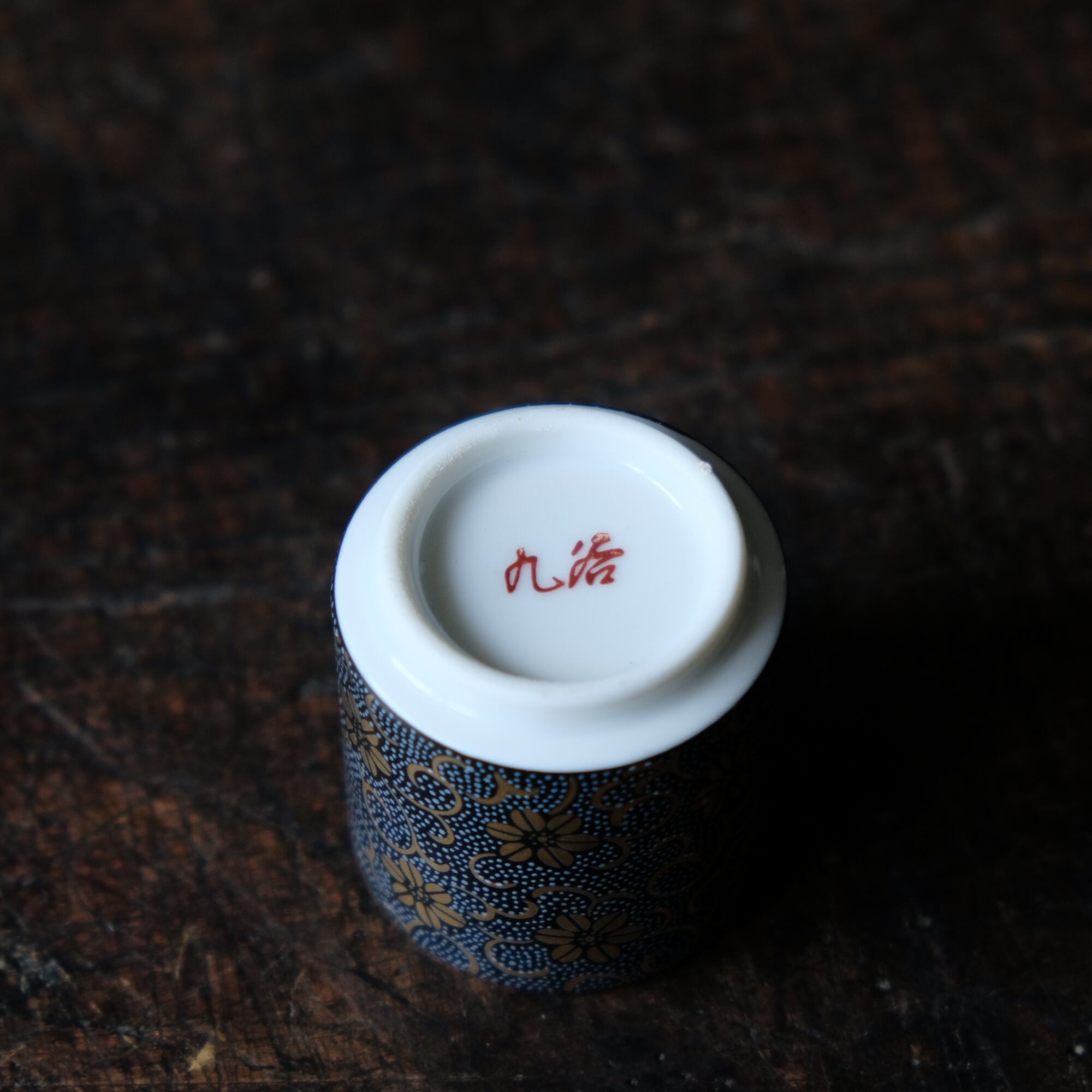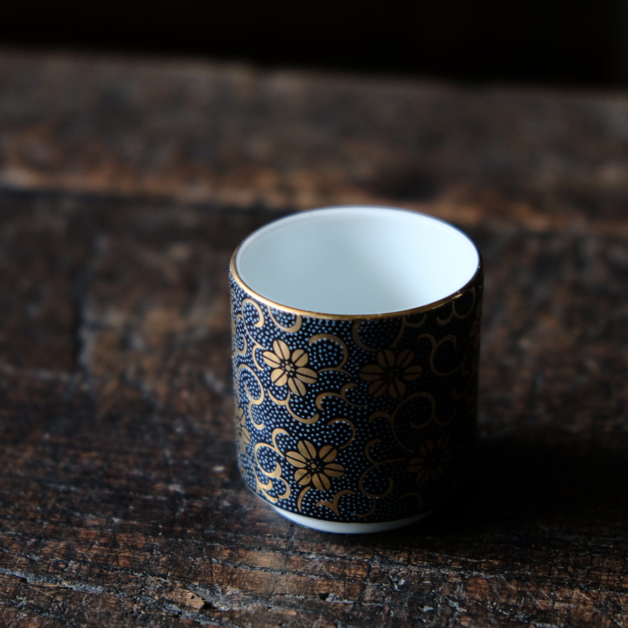 花唐草と青粒◆九谷焼 青粒金彩覗き猪口 小ぶり 酒器 レトロ 転写 工芸品 インテリア