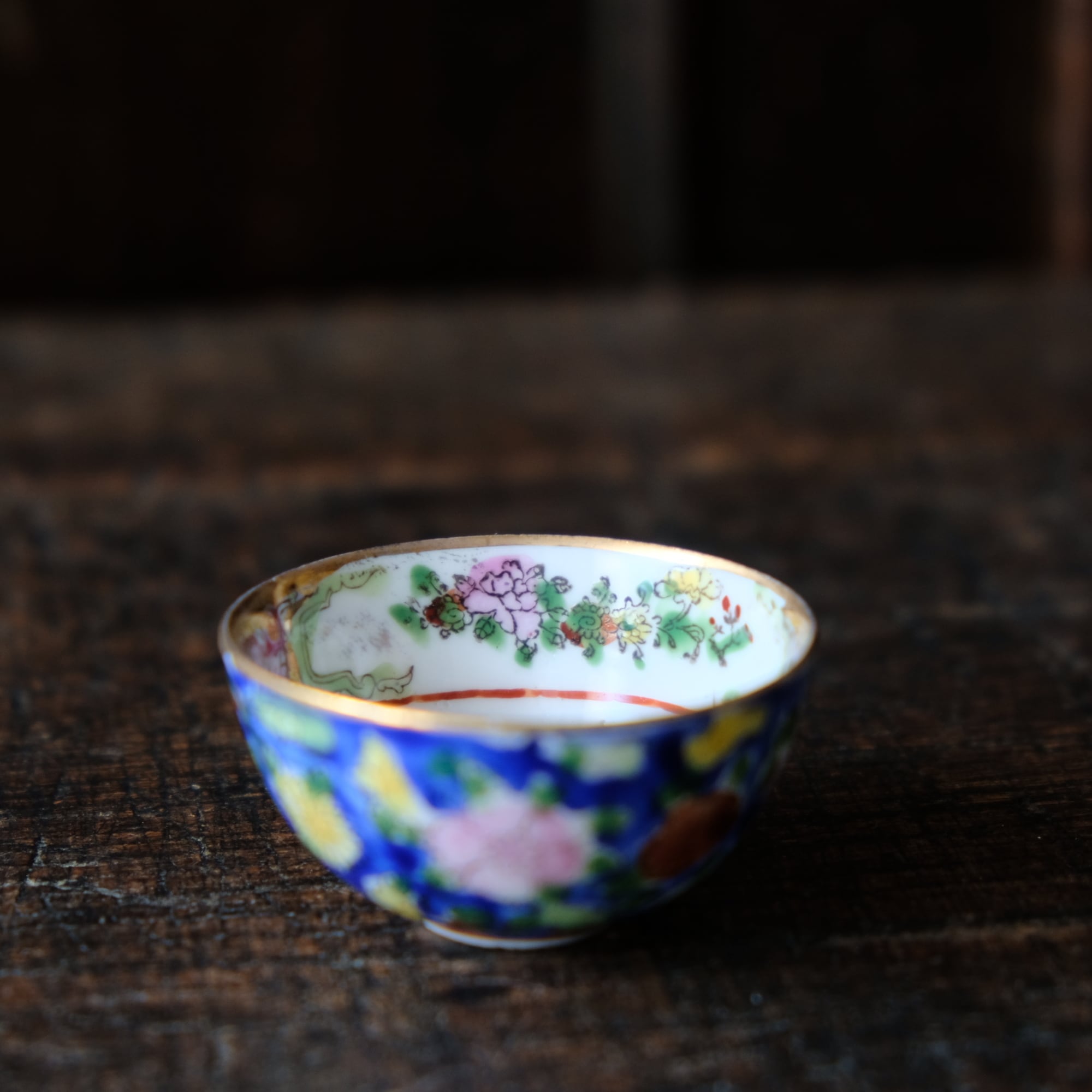 見込みにパンダ◆カラフルな花尽くし。中国産 チャイナレトロ 色絵金彩小ぶり猪口 シノワズリ