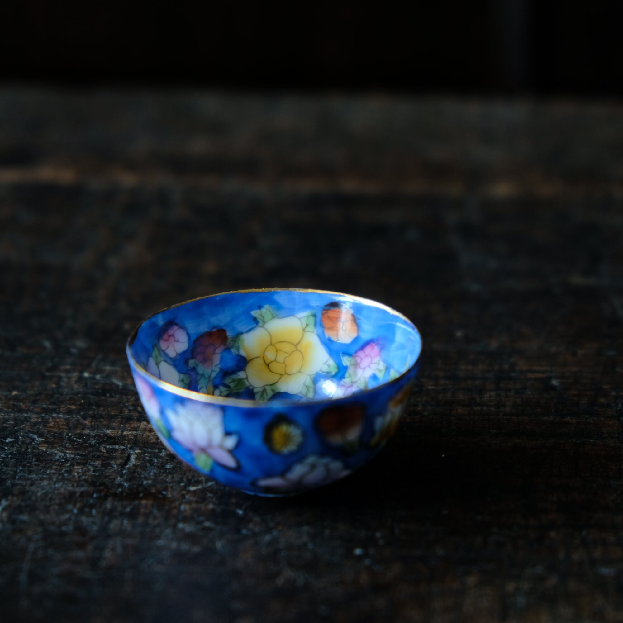 見込みに丑(牛)◆中国景徳鎮 ブルー 干支 色絵金彩小ぶり猪口 花尽くし。シノワズリ チャイナレトロ
