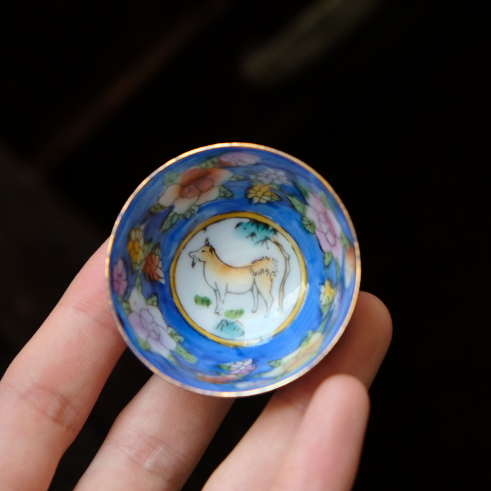 見込みに戌(犬)◆中国景徳鎮 ブルー 干支 色絵金彩小ぶり猪口 花尽くし。シノワズリ チャイナレトロ
