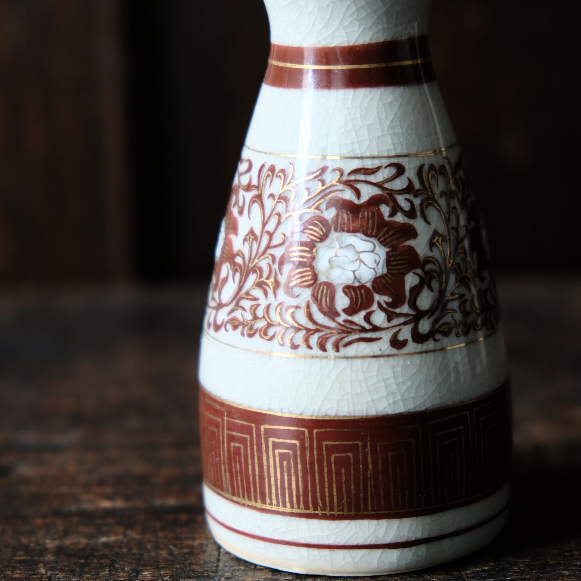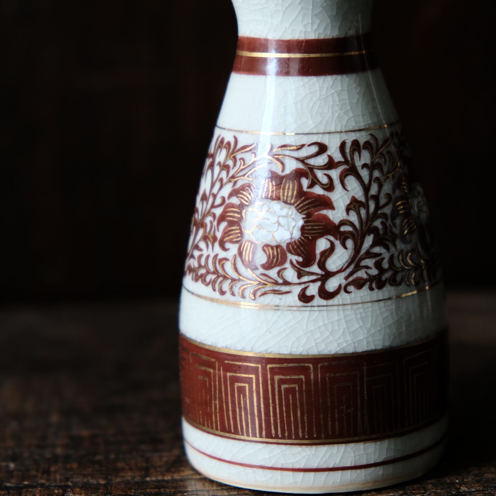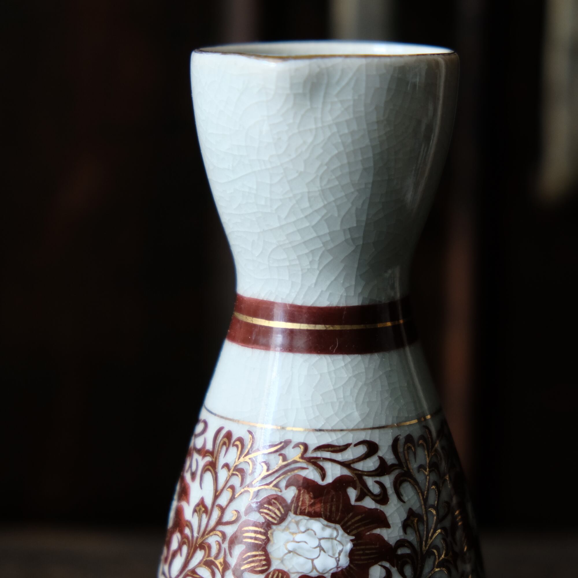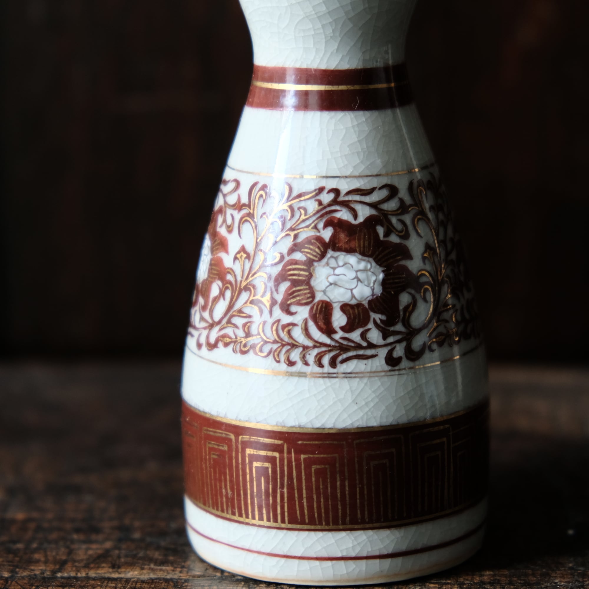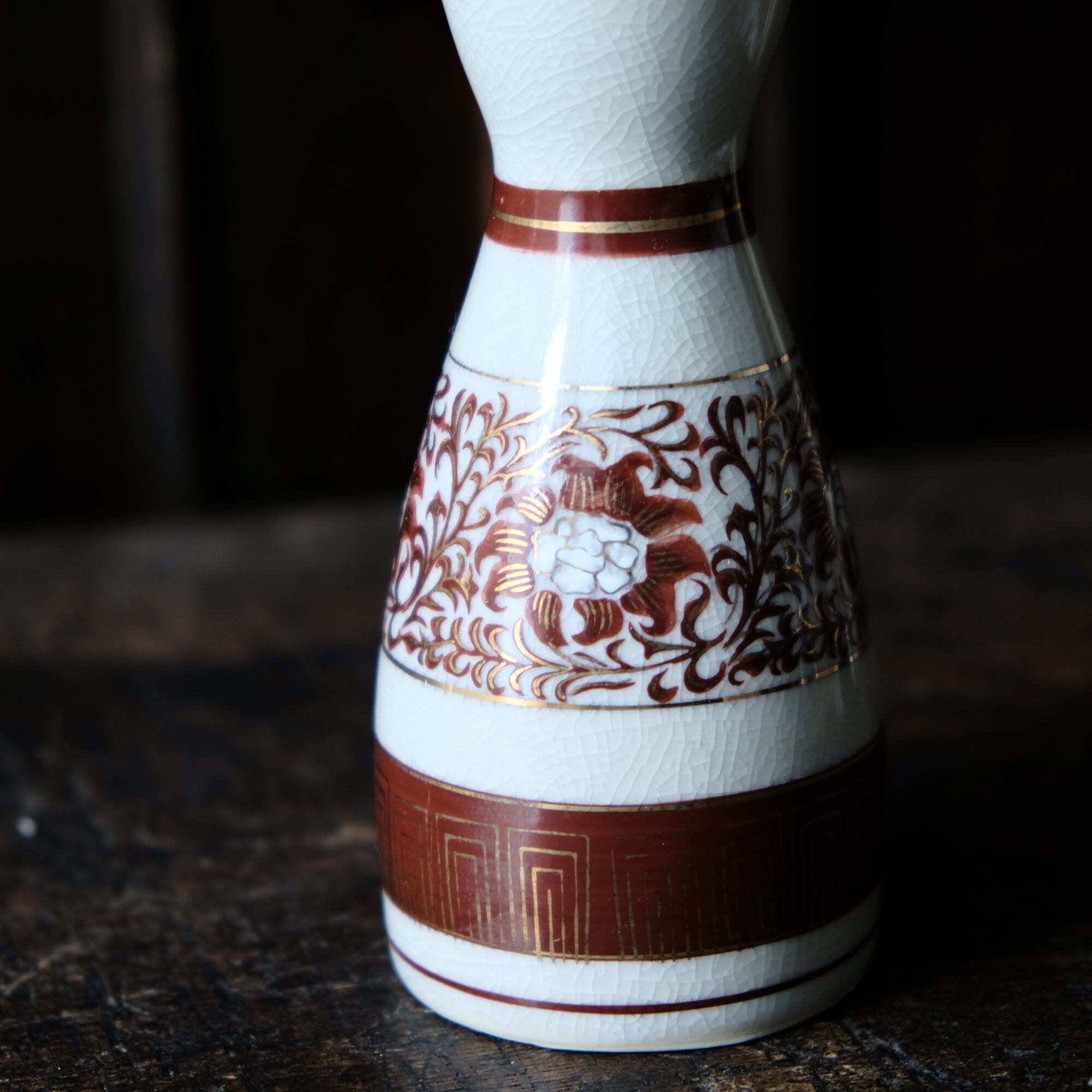 赤いリーフと唐草◆白い花文様。九谷焼 赤絵金彩徳利 酒器 工芸品 岳山 昭和レトロ インテリア 古民家