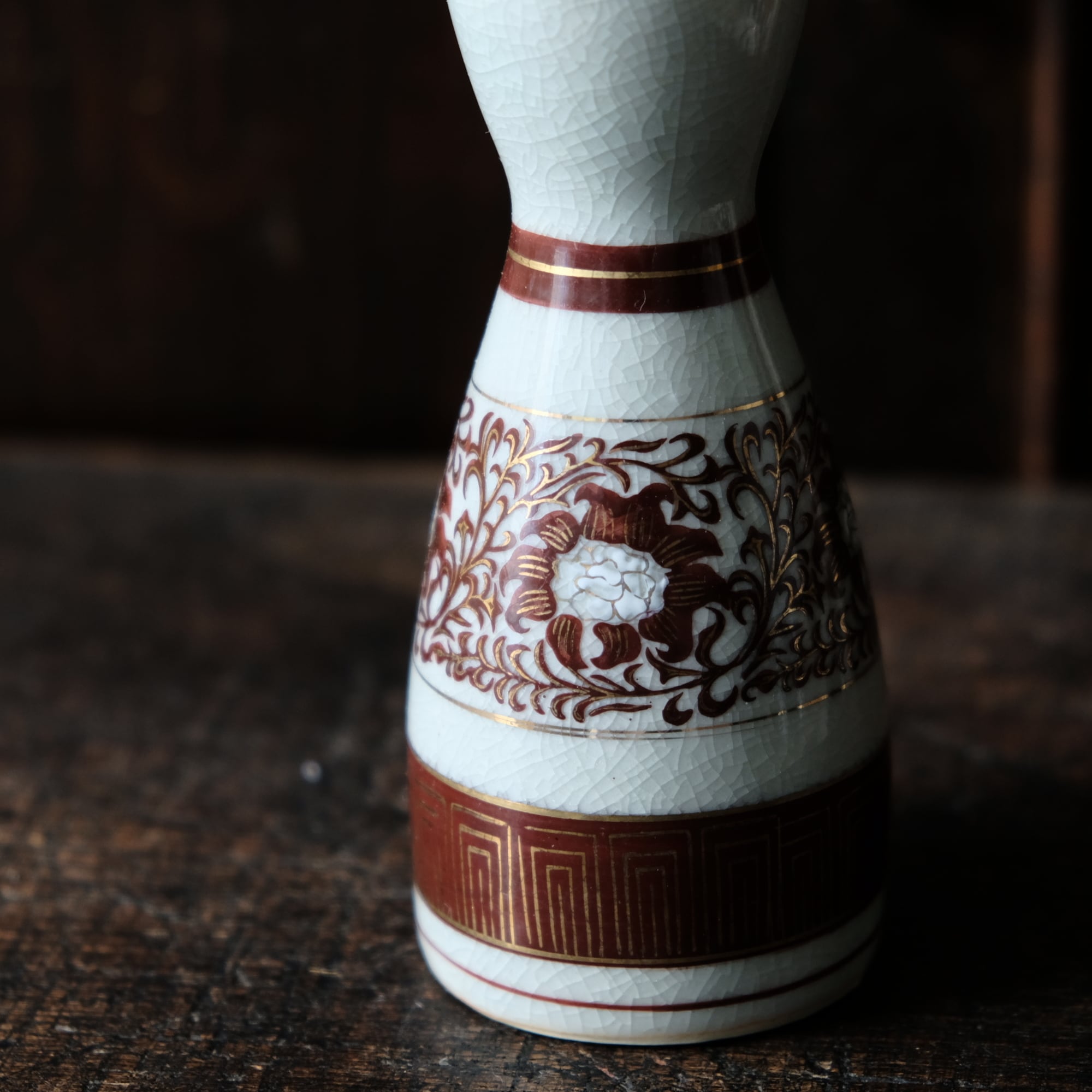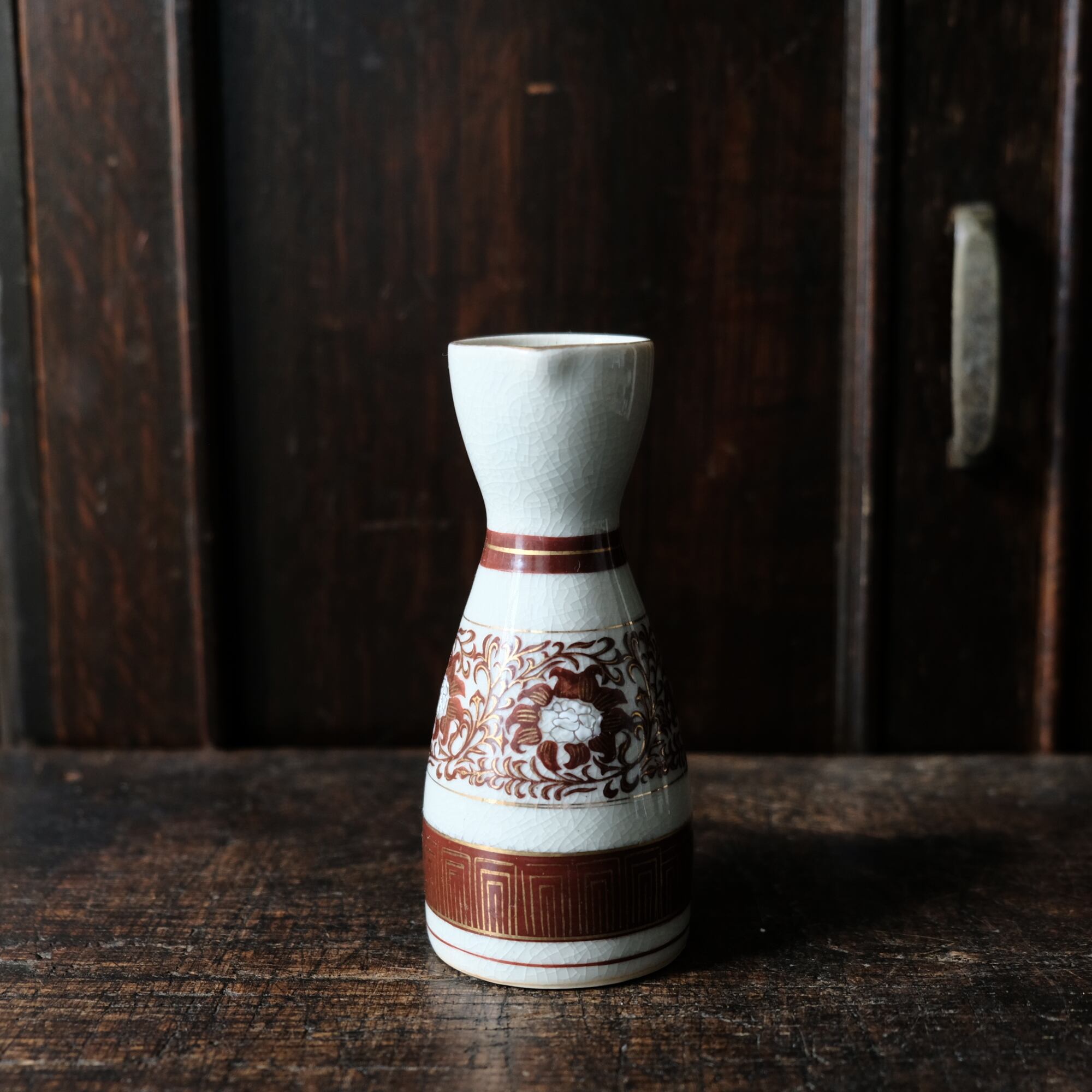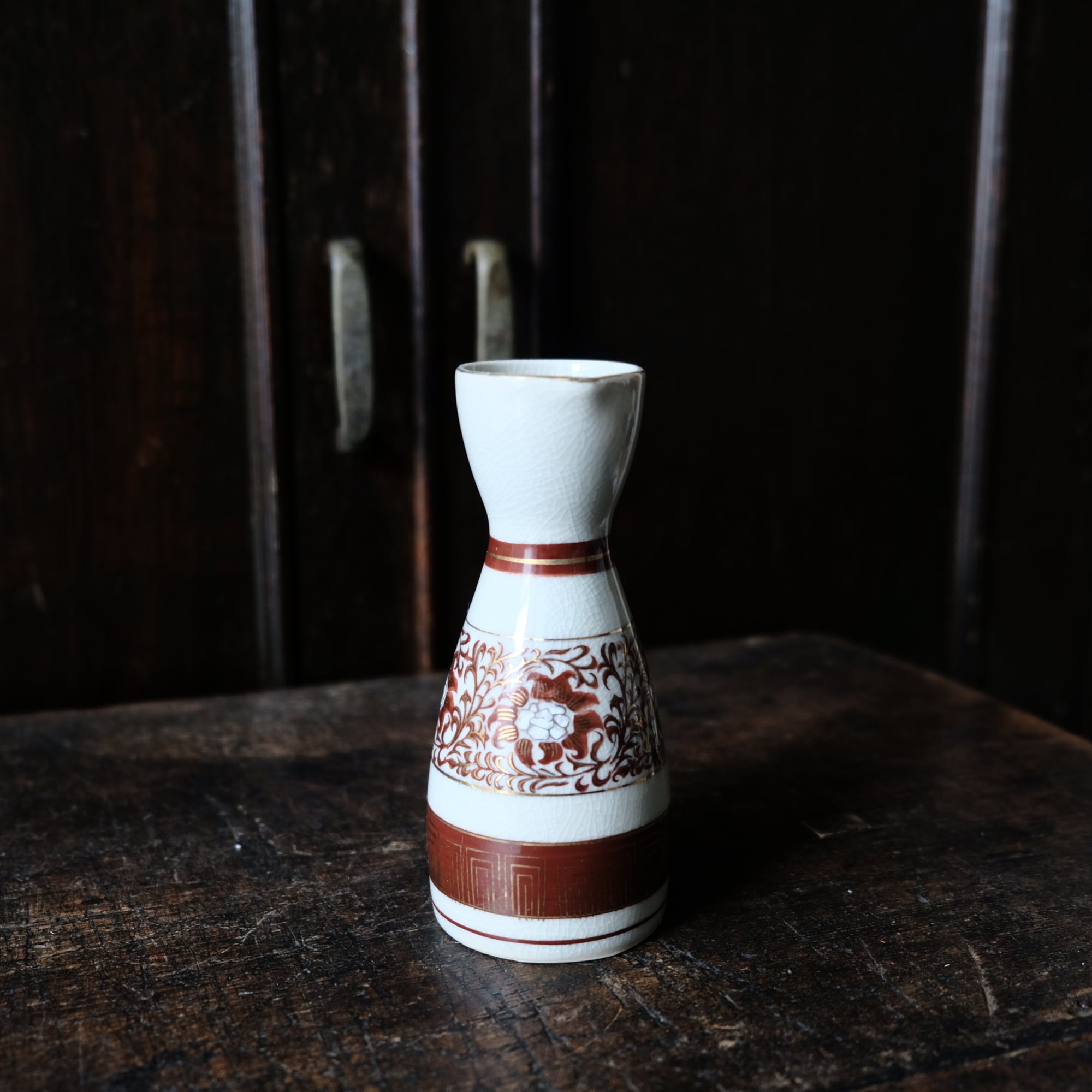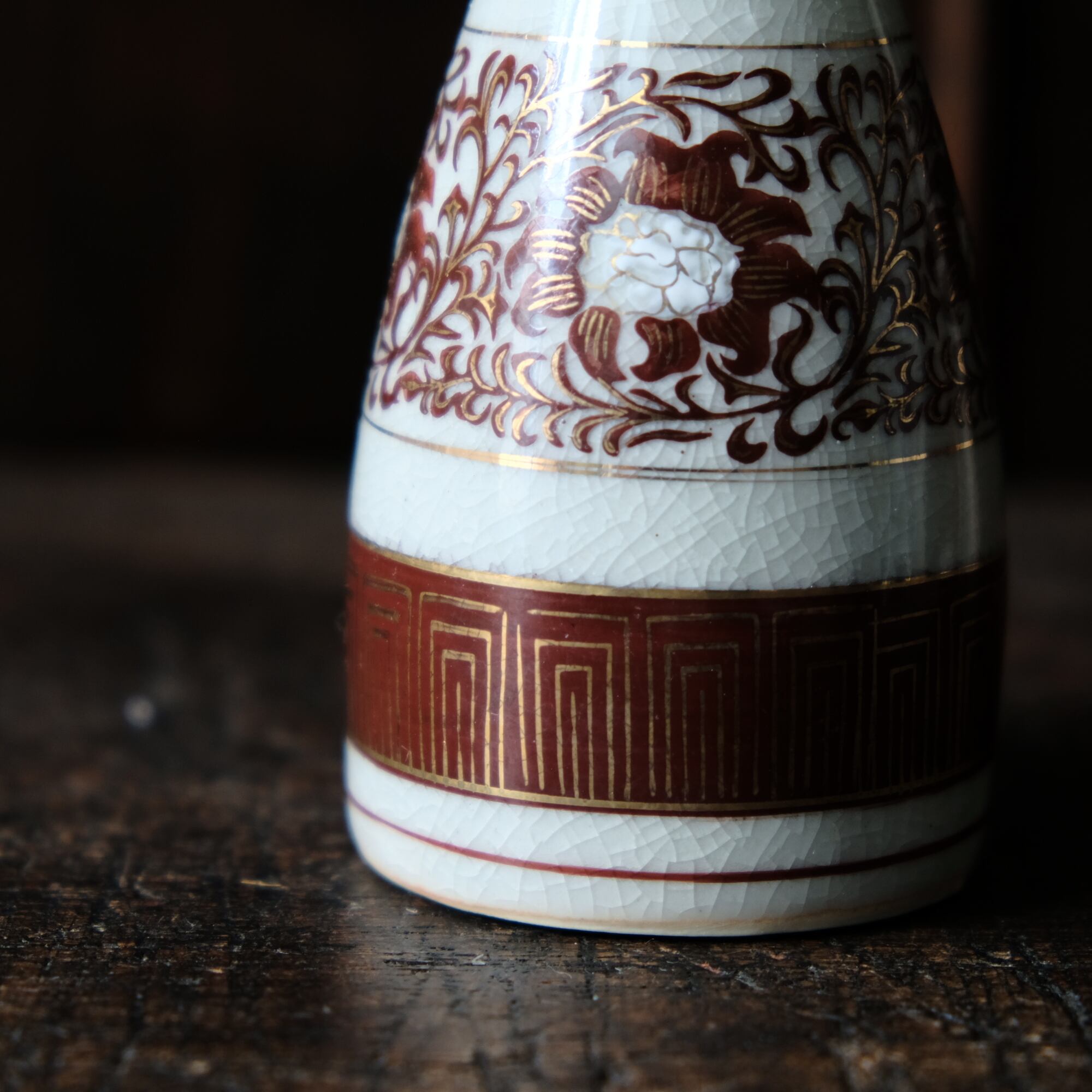 赤いリーフと唐草◆白い花文様。九谷焼 赤絵金彩徳利 酒器 工芸品 岳山 昭和レトロ インテリア 古民家