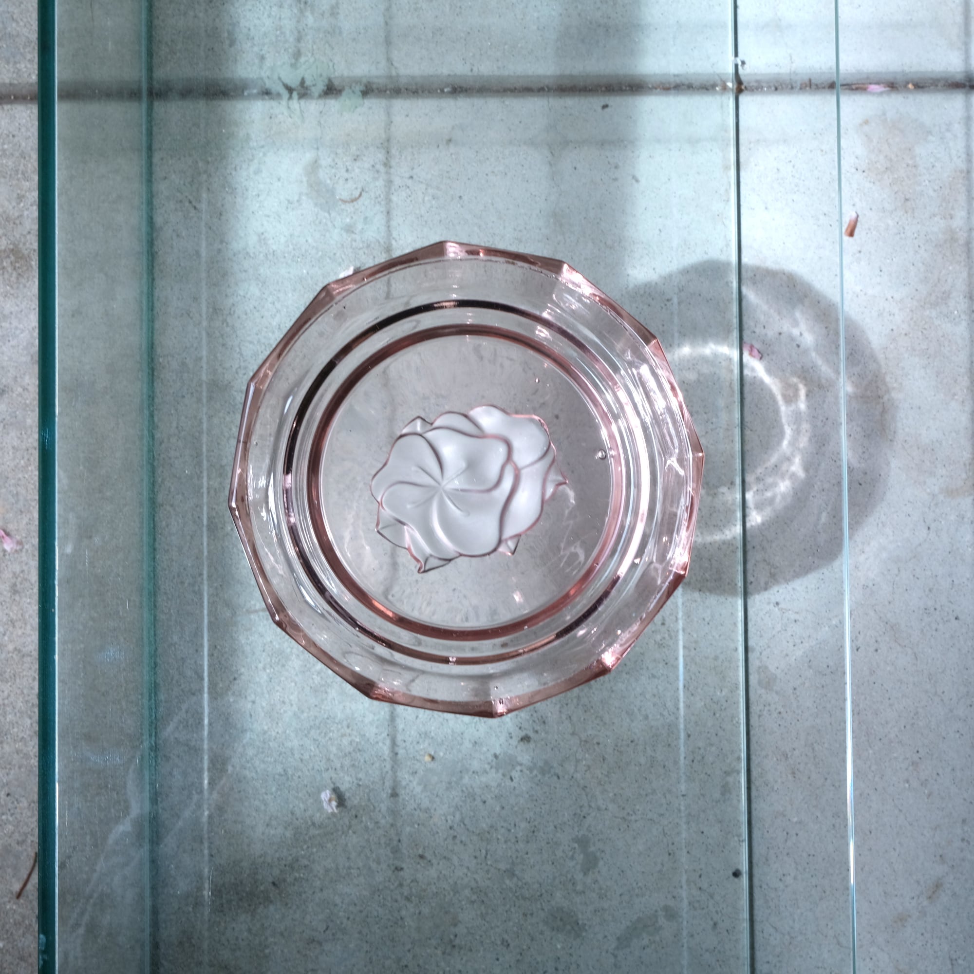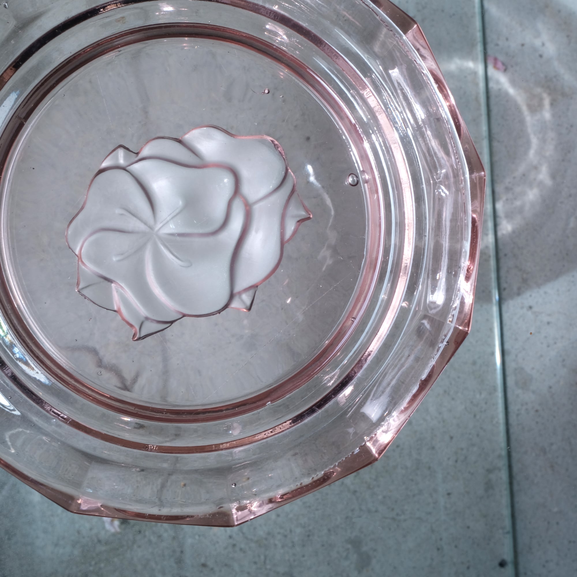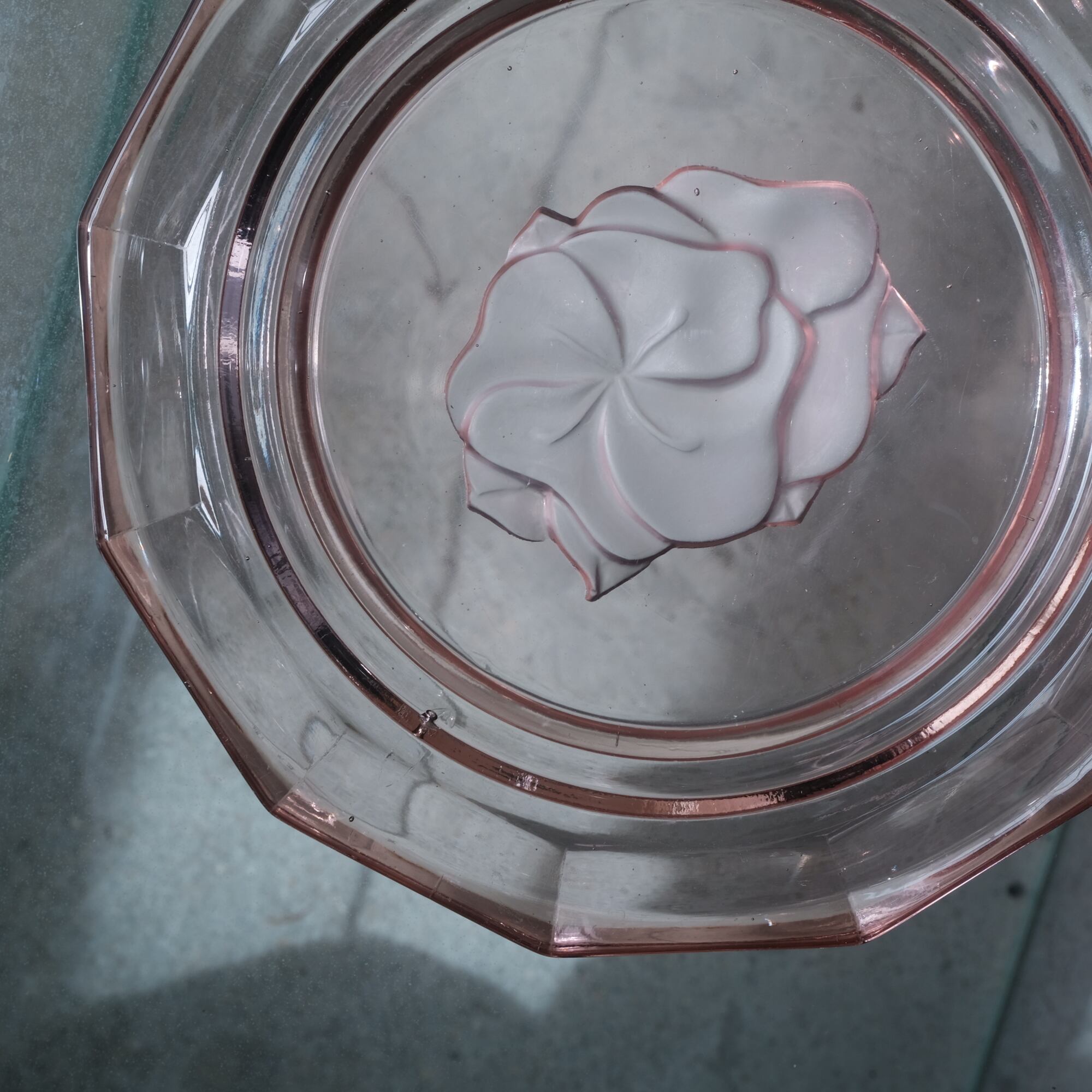 見込みに薔薇◆スモーキーなピンク。アンティークプレスガラス十二角皿 骨董/antiques 大正〜昭和初期