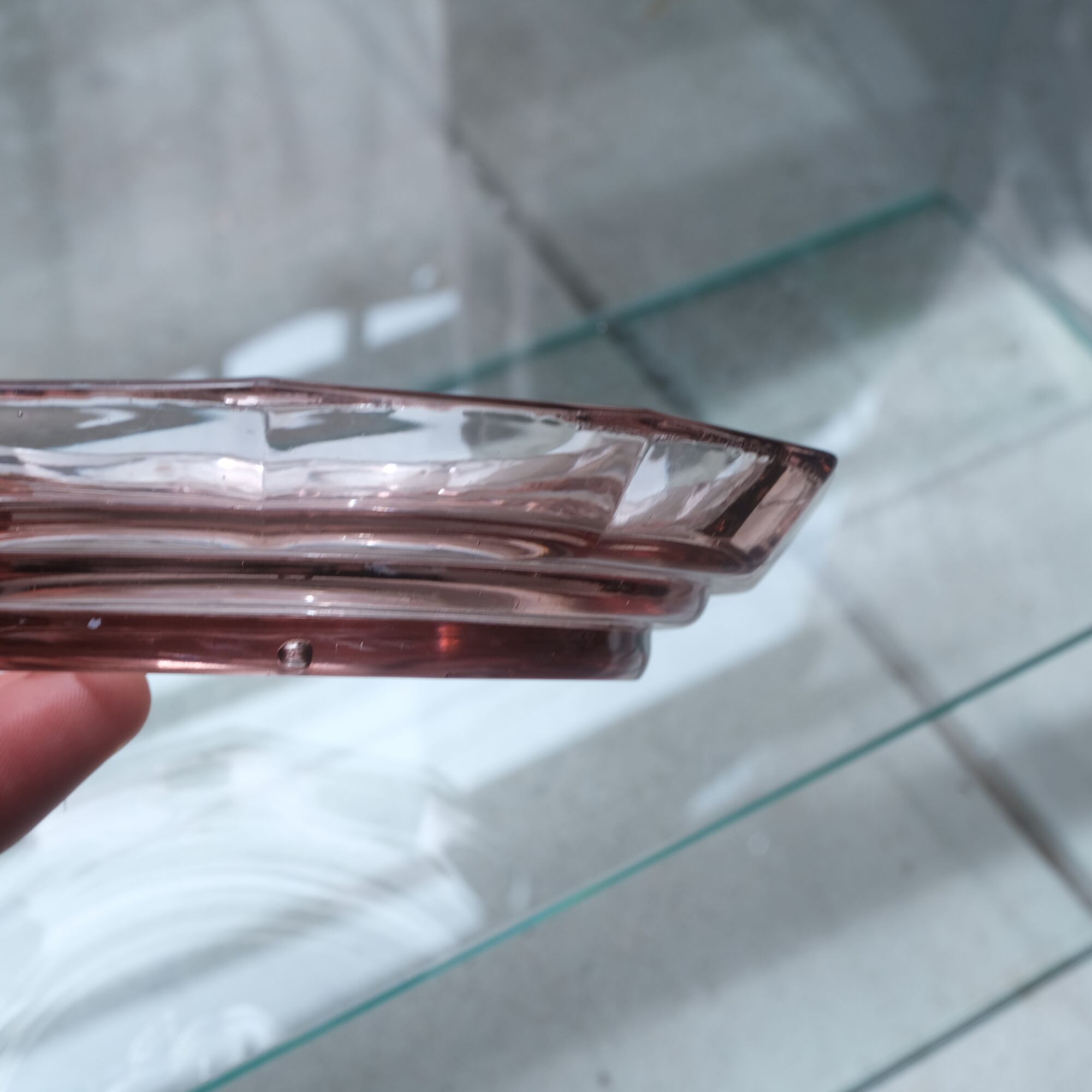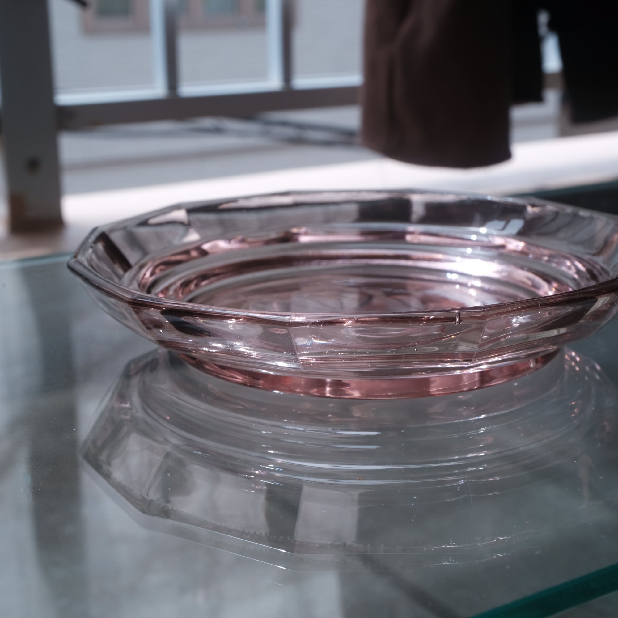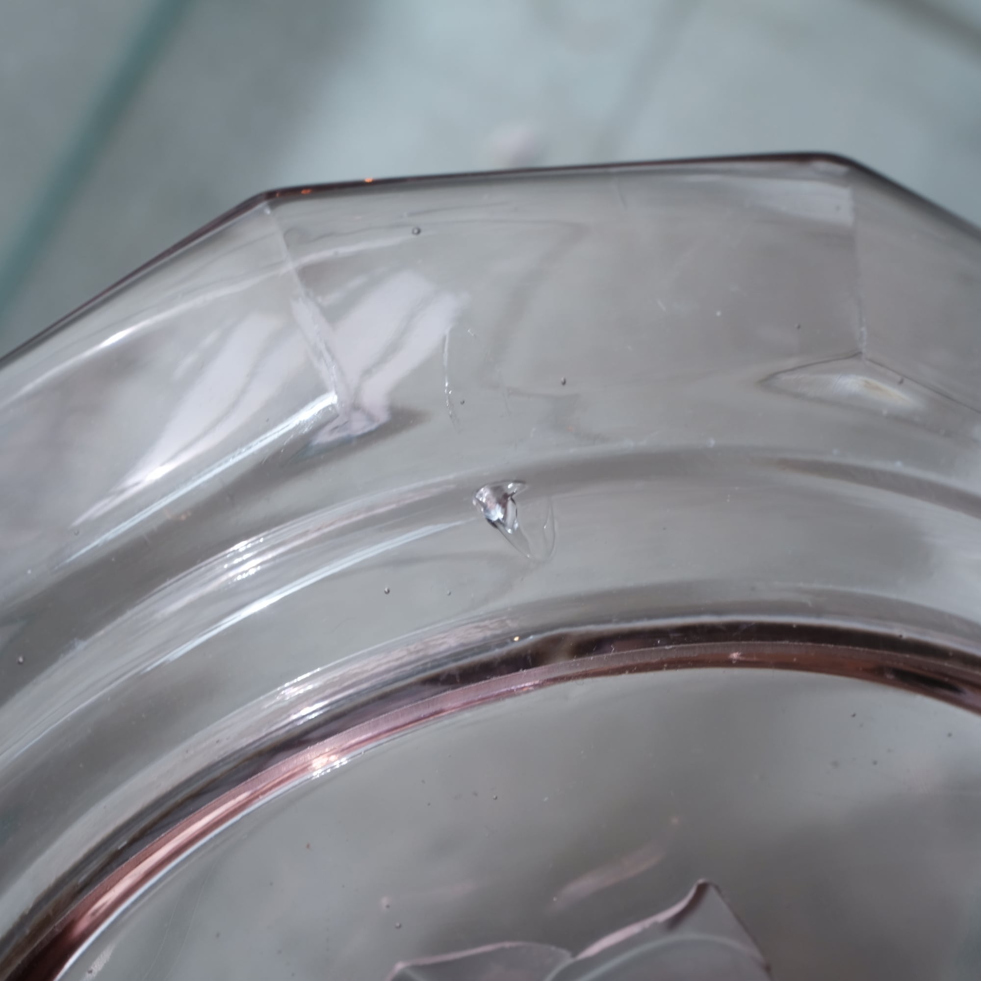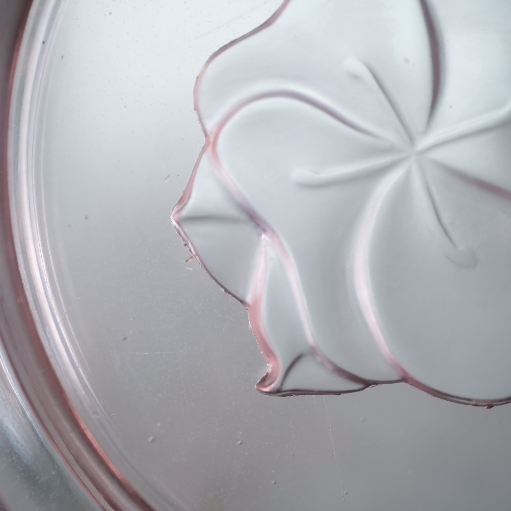 見込みに薔薇◆スモーキーなピンク。アンティークプレスガラス十二角皿 骨董/antiques 大正〜昭和初期