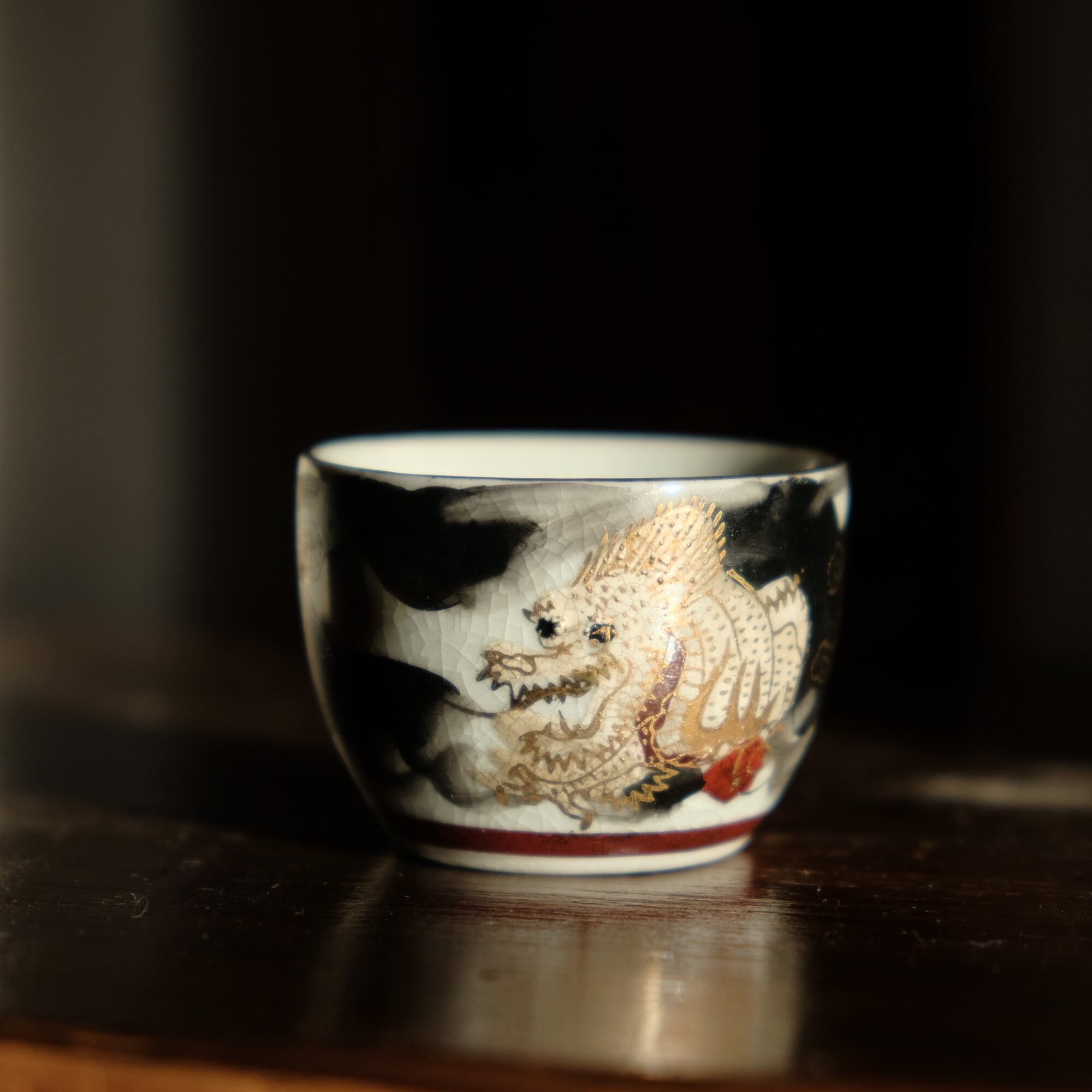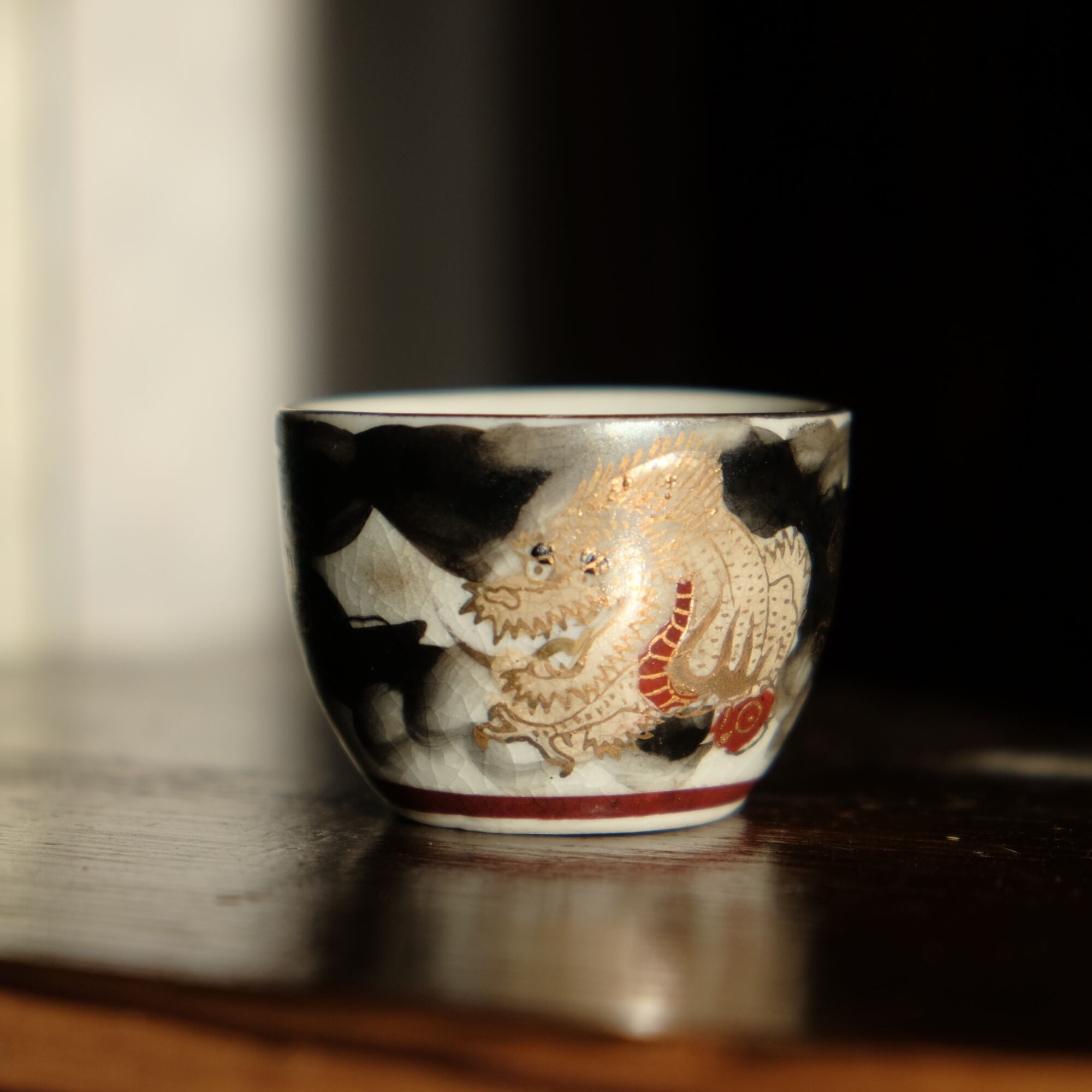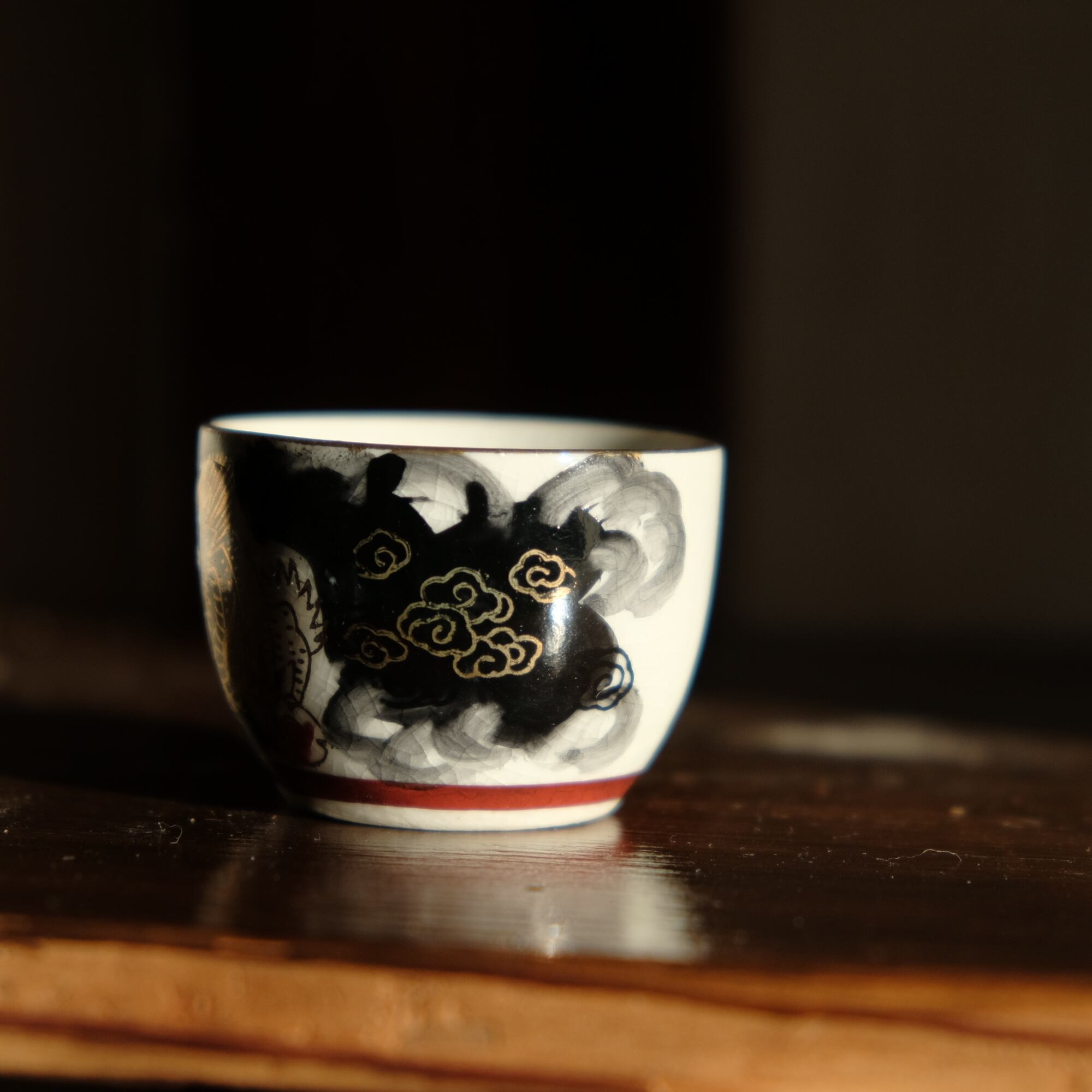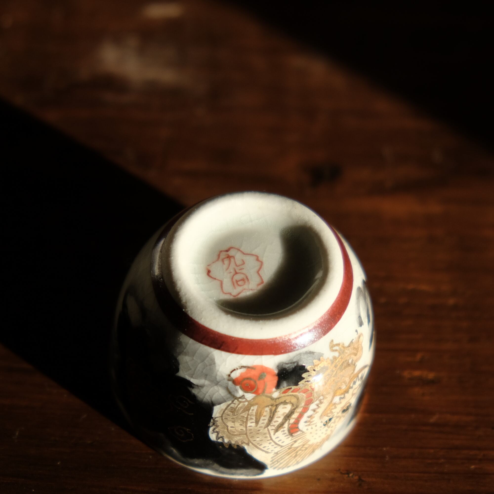 豪快な龍◆黒と金の雲。九谷焼 龍文色絵金彩猪口 酒器 古民家 工芸品 インテリア 昭和期