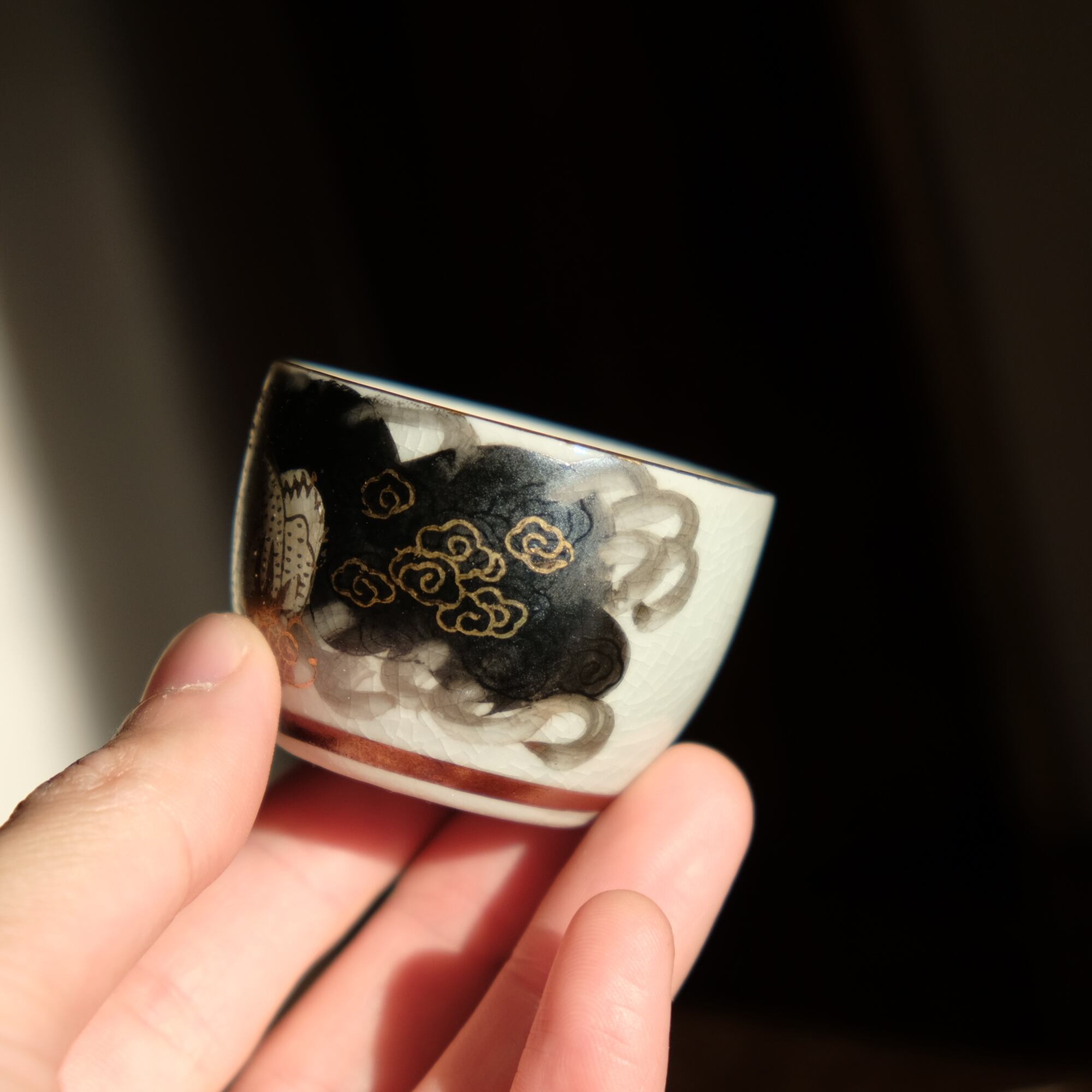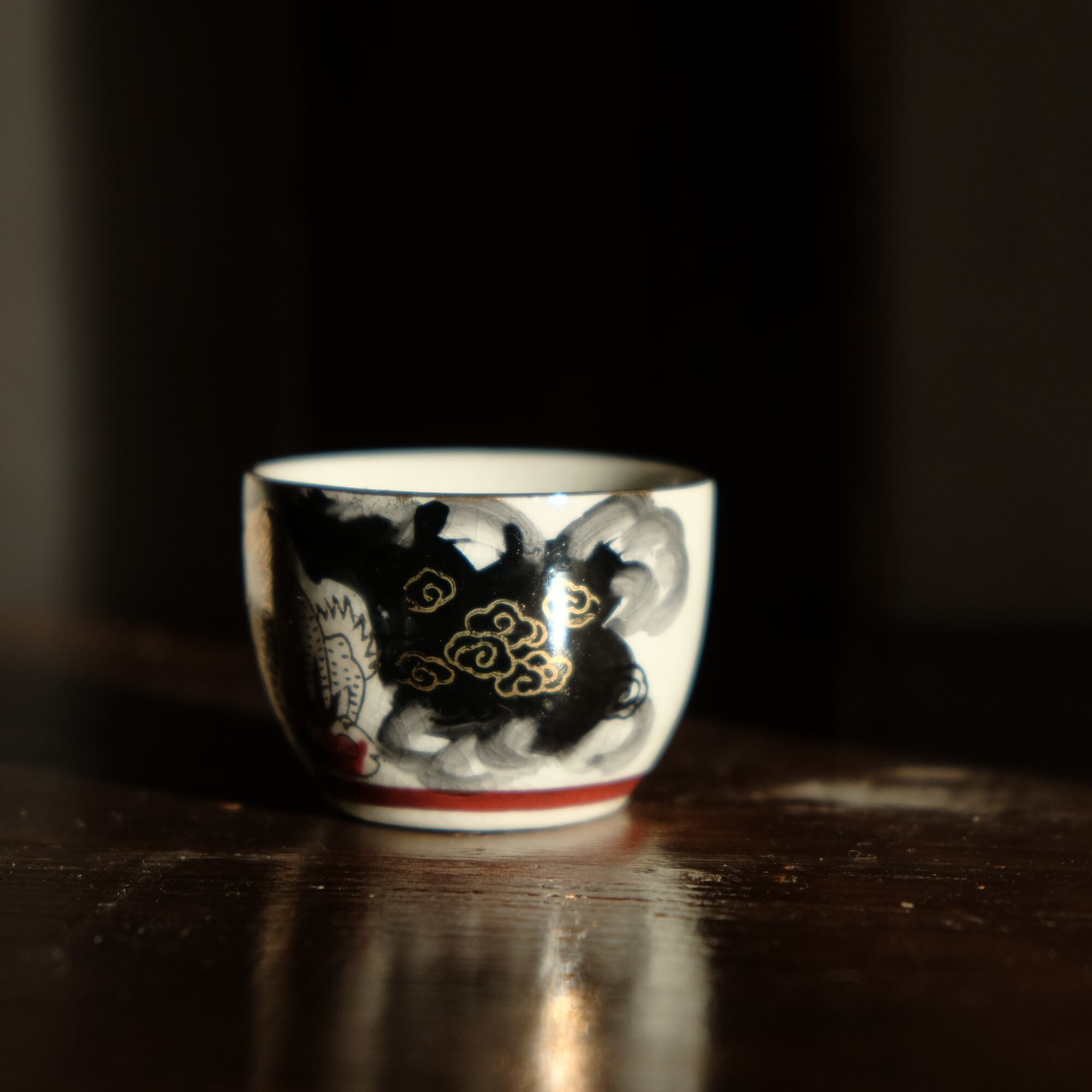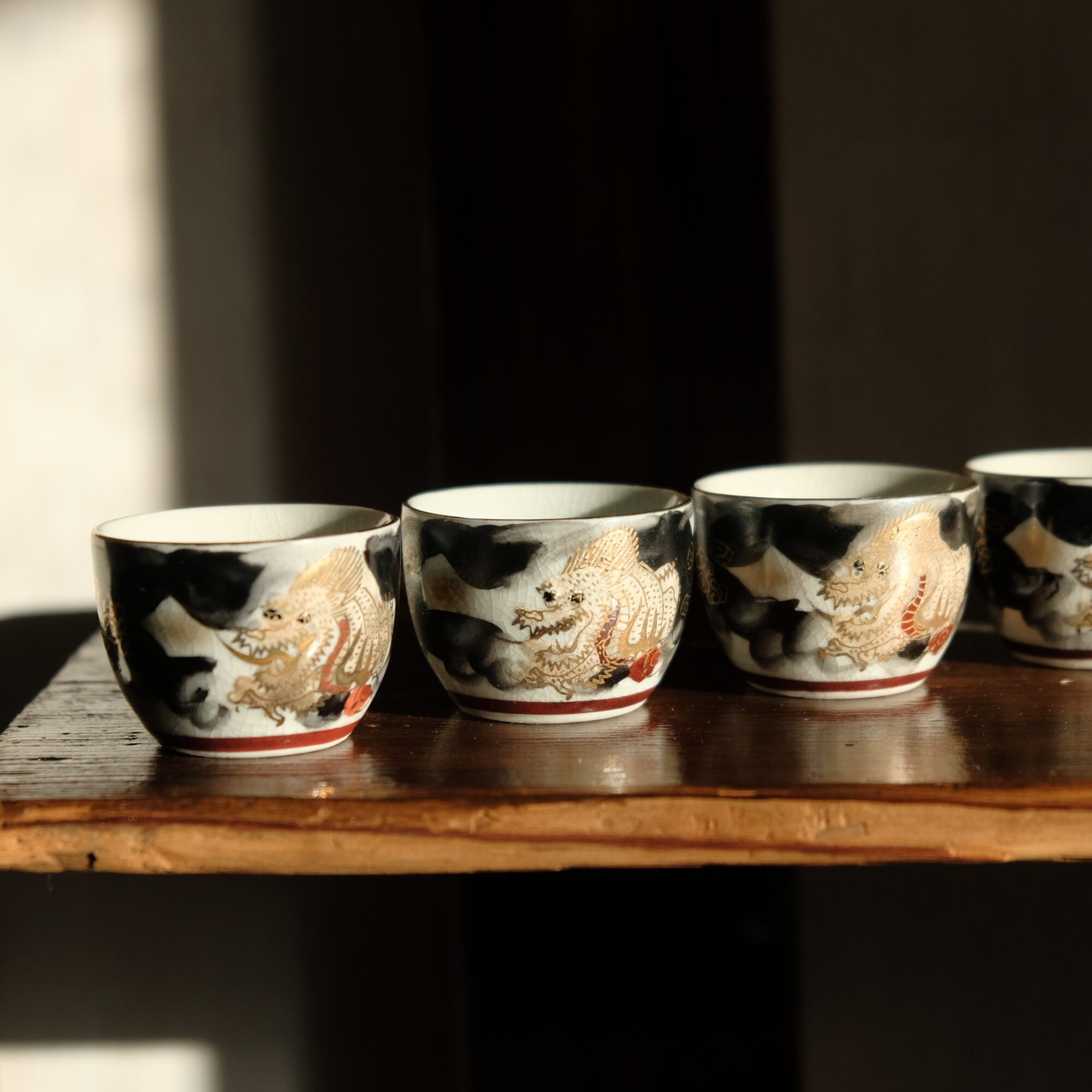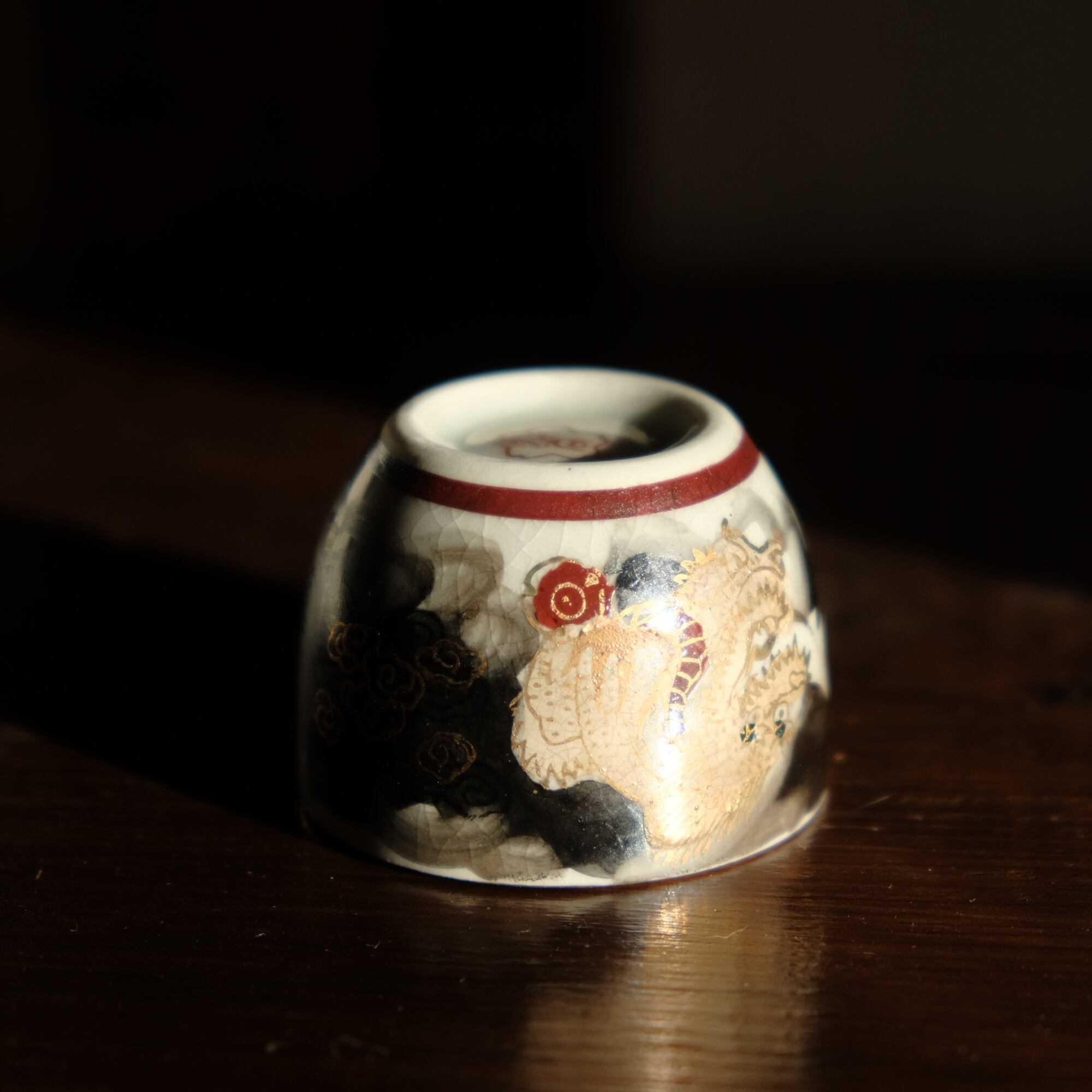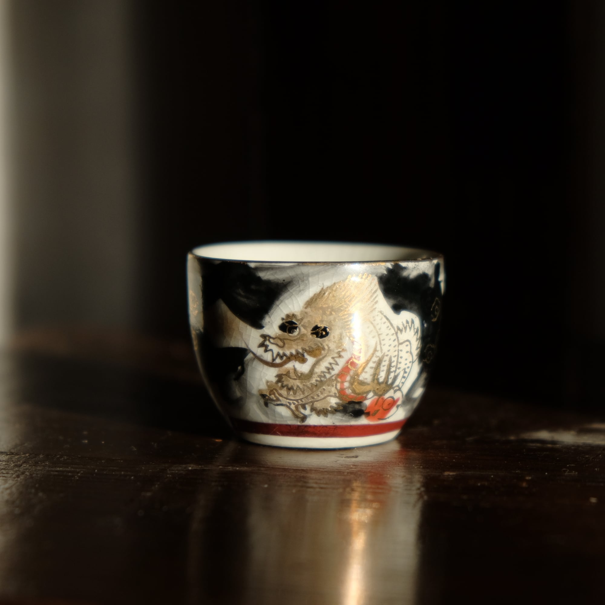 豪快な龍◆黒と金の雲。九谷焼 龍文色絵金彩猪口 酒器 古民家 工芸品 インテリア 昭和期