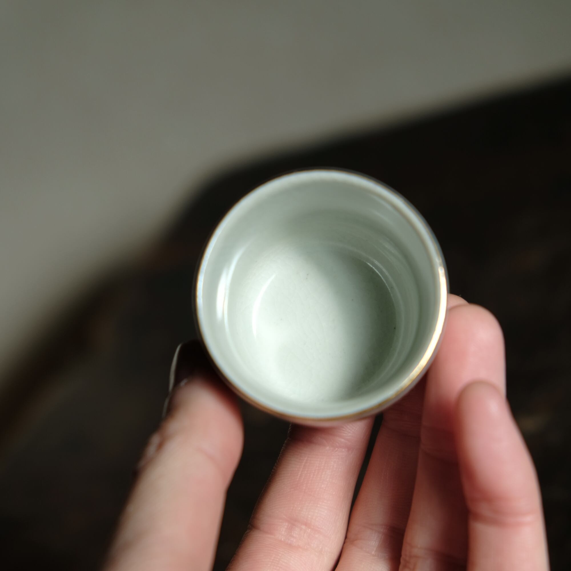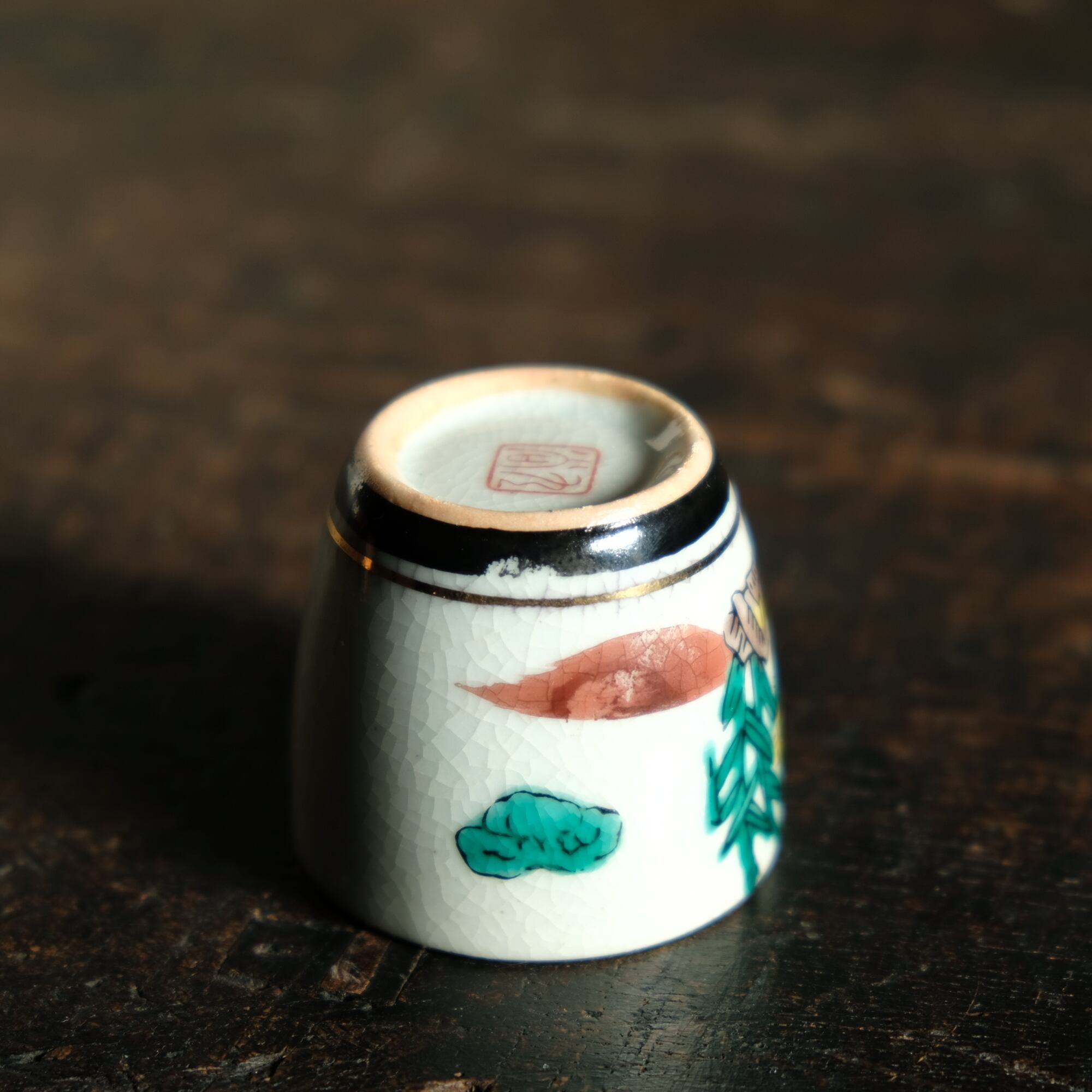 草むらから現れる猪(亥)◆キュートな緑の雲。九谷焼 色絵金彩猪口 昭和レトロ 干支 酒器 コレクション 古民家 古道具 #7