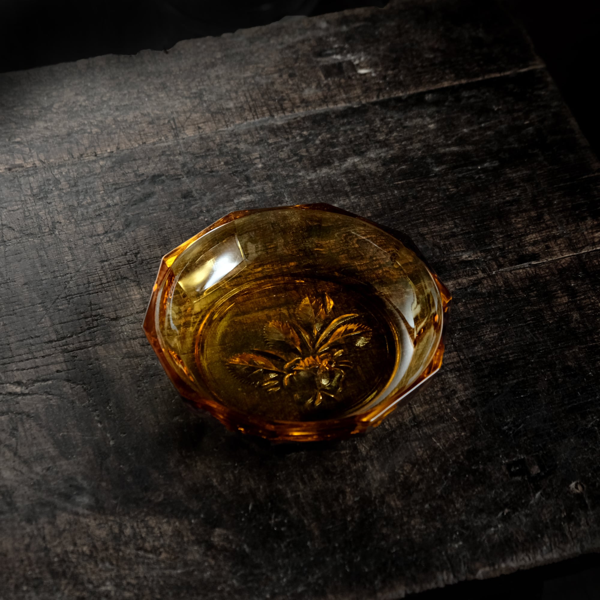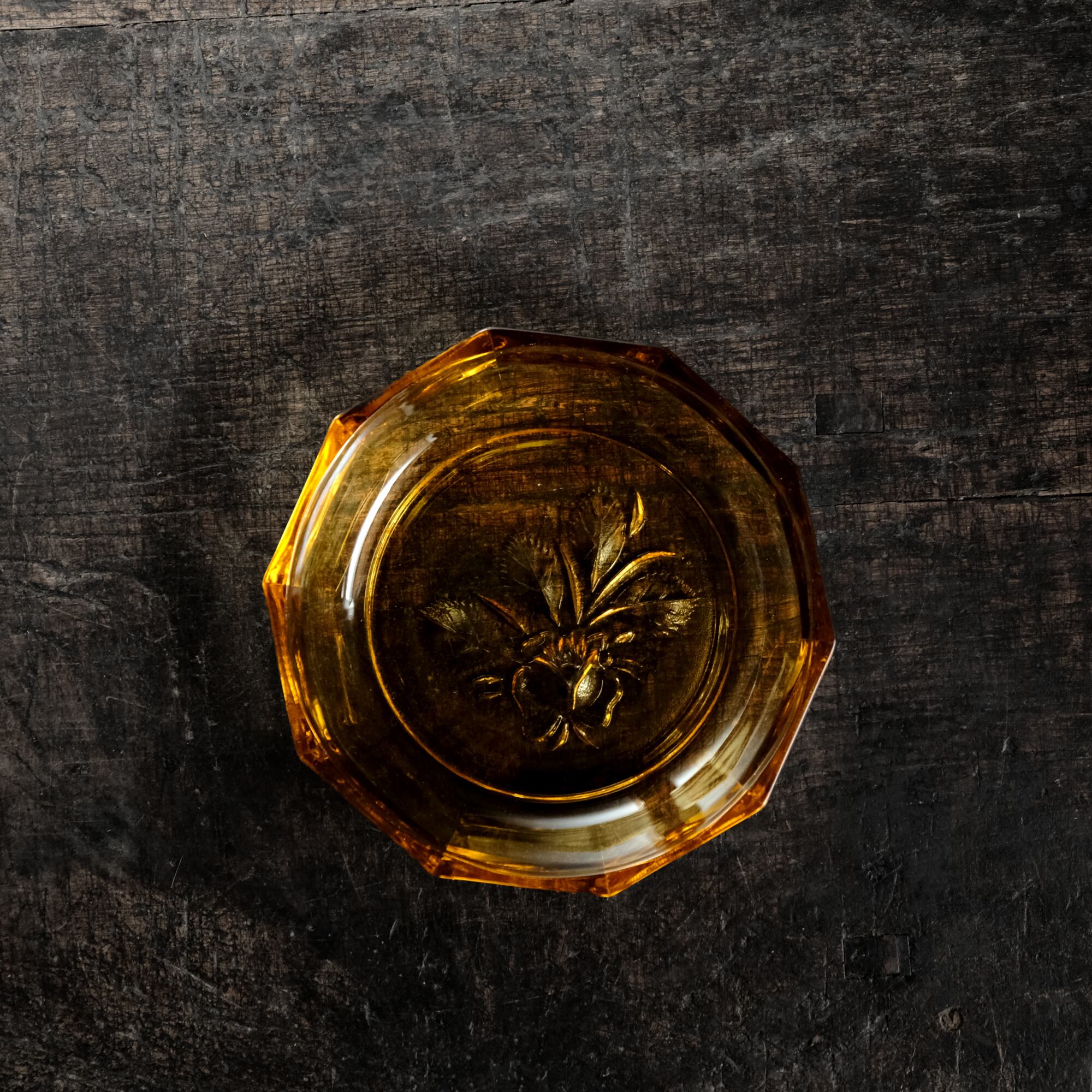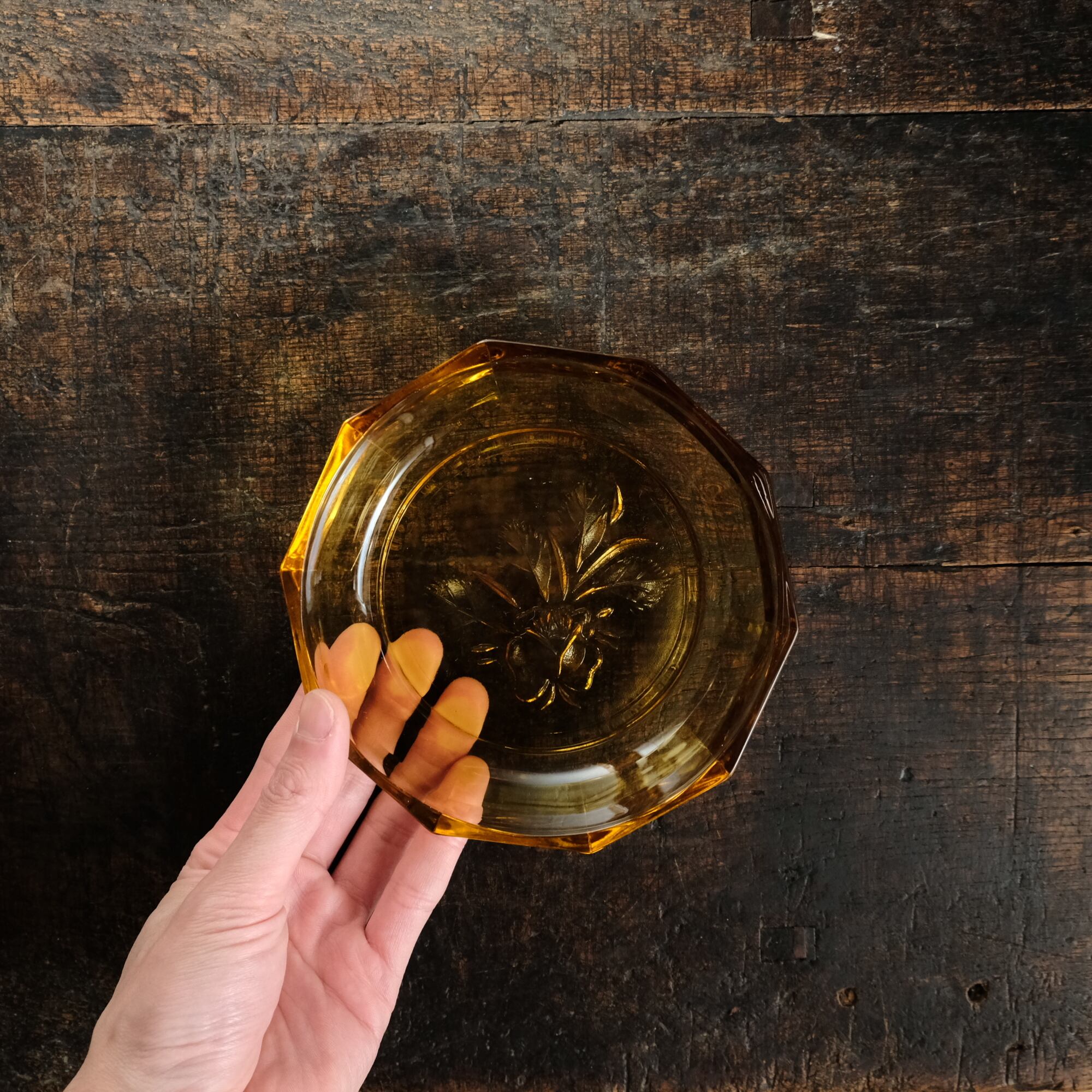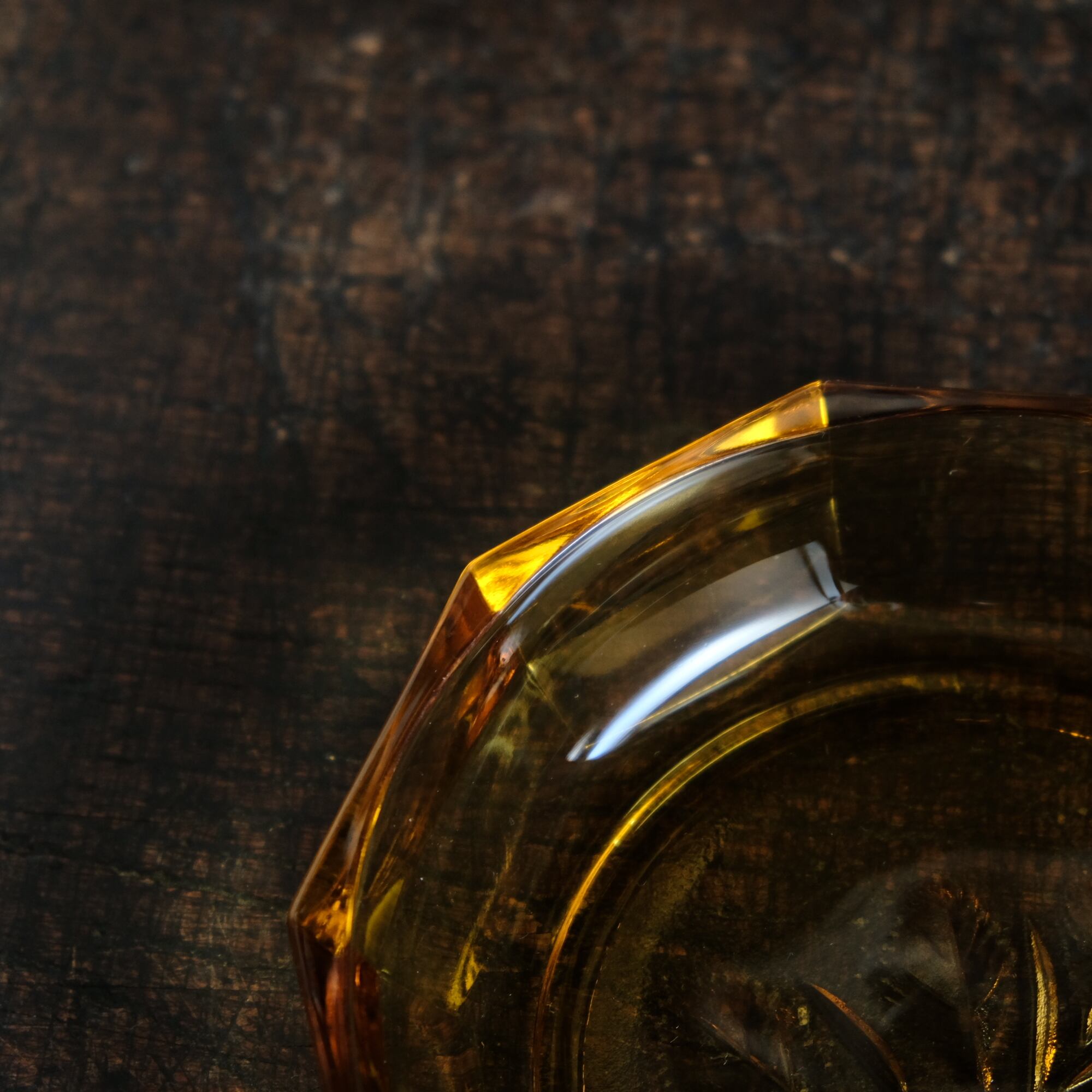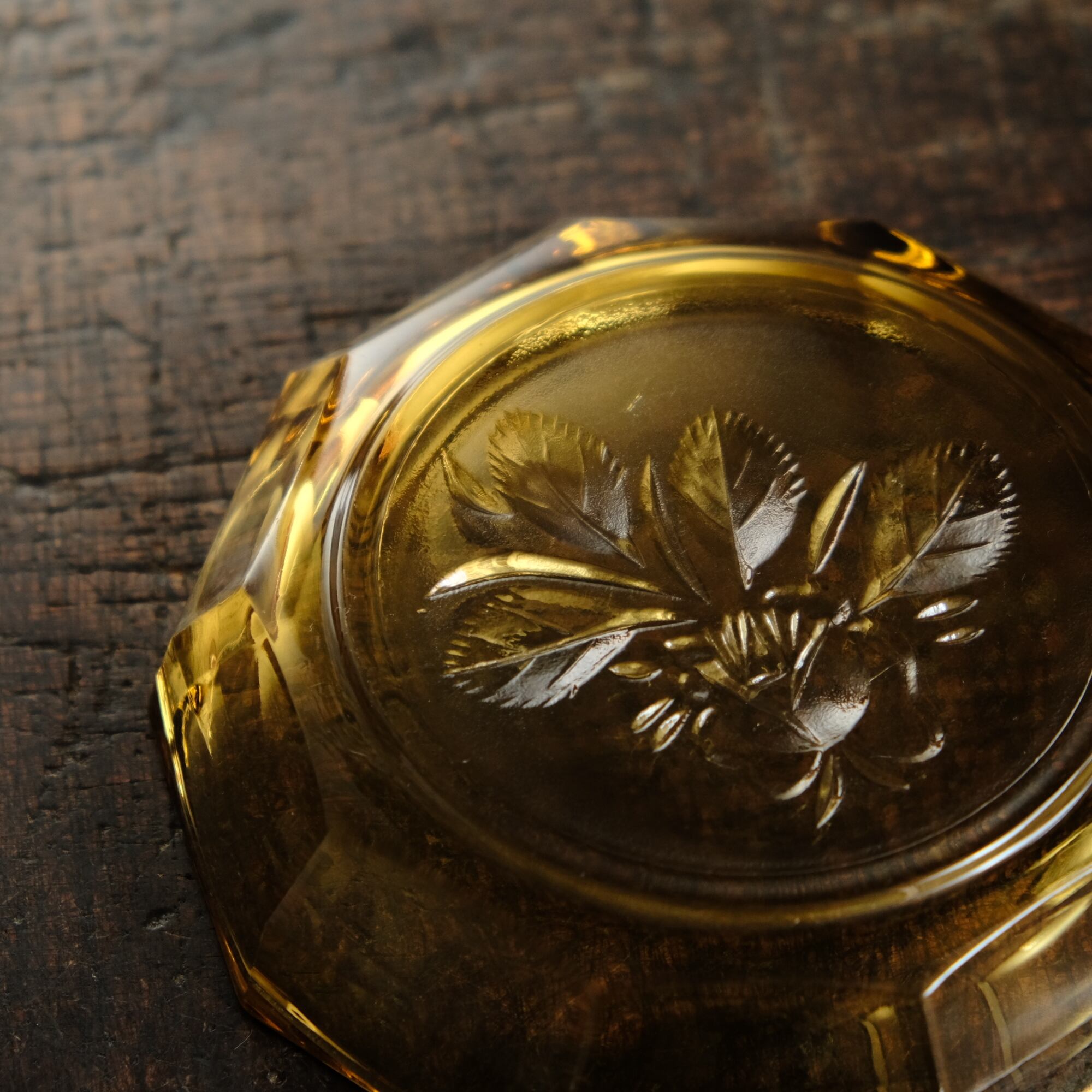 十角の形状◆温もりを感じる琥珀色。昭和後期 花文アンバー硝子十角中皿 プレスガラス 昭和レトロ 丁寧な暮らし