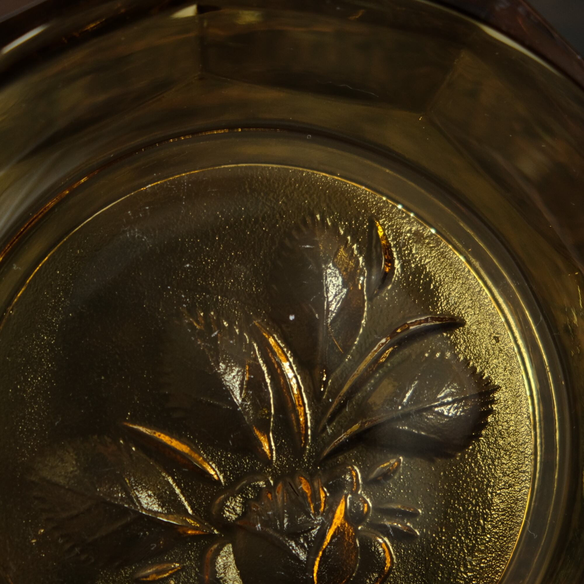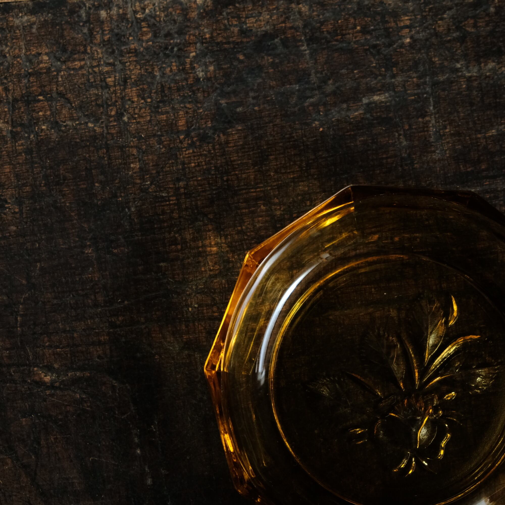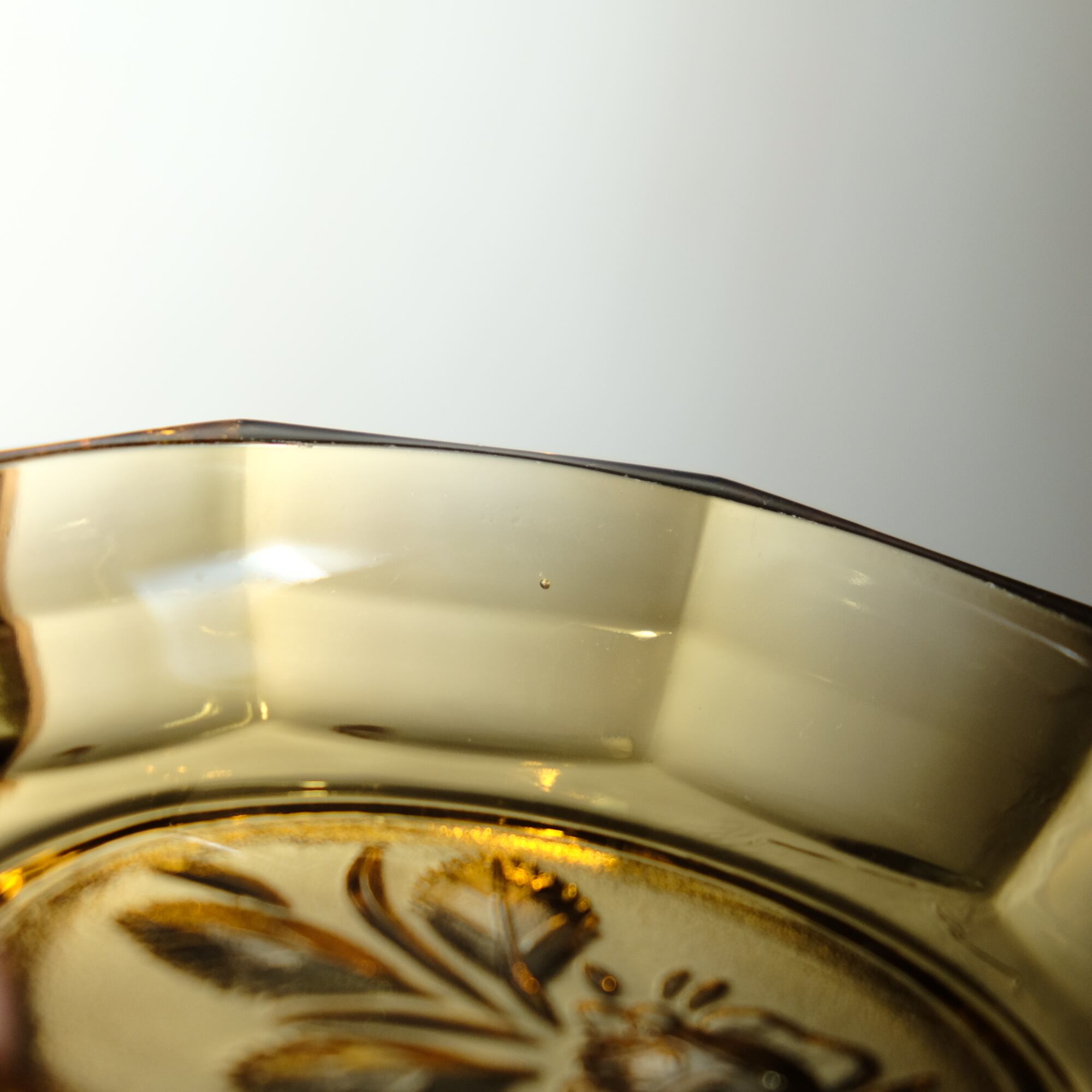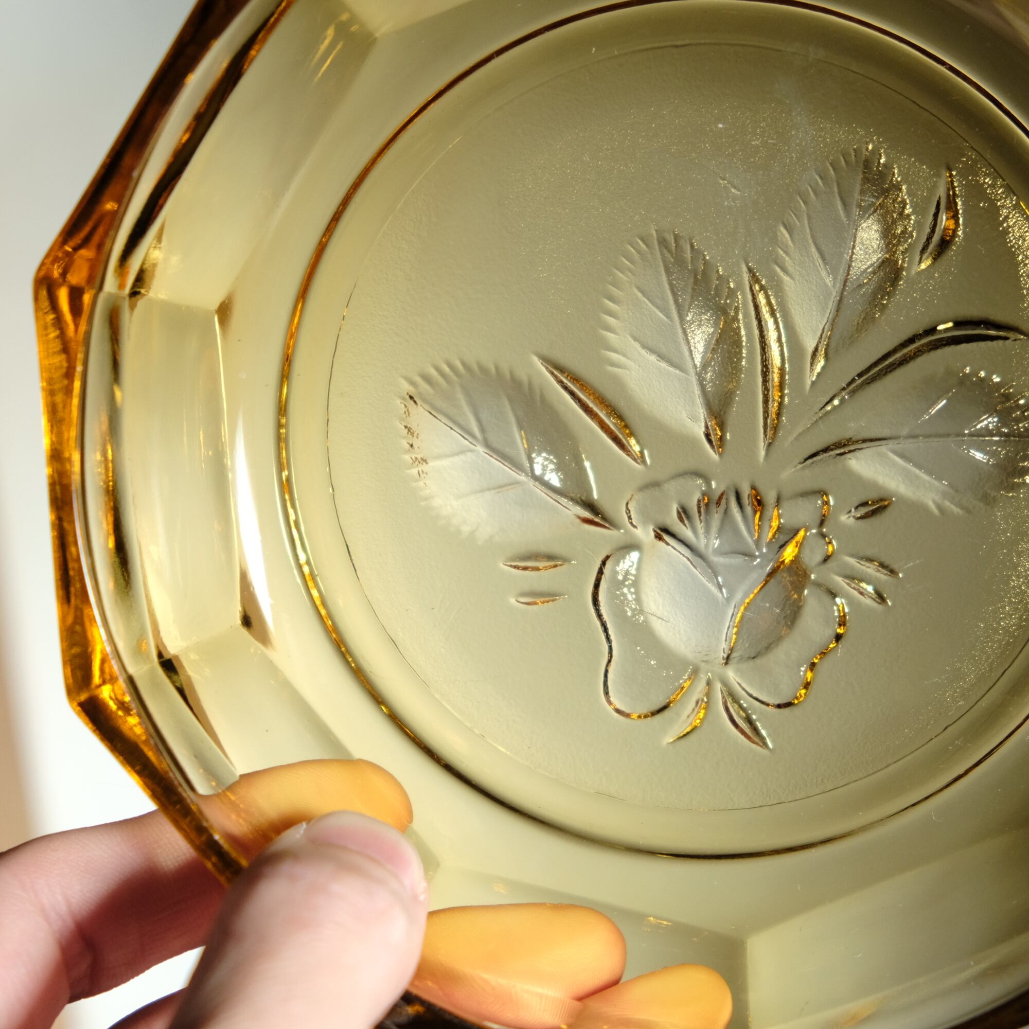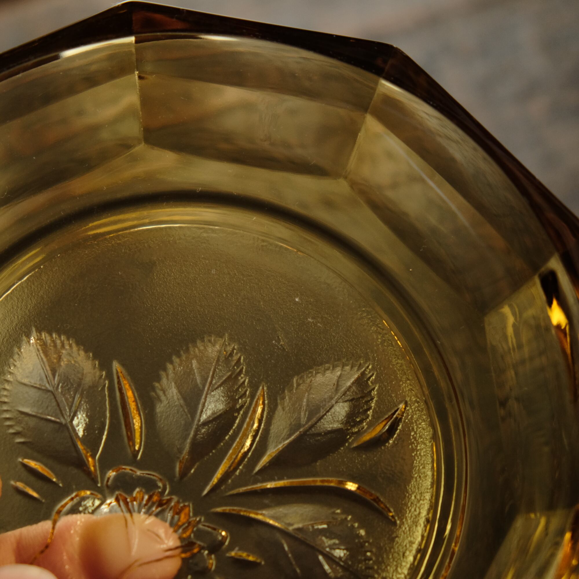 十角の形状◆温もりを感じる琥珀色。昭和後期 花文アンバー硝子十角中皿 プレスガラス 昭和レトロ 丁寧な暮らし